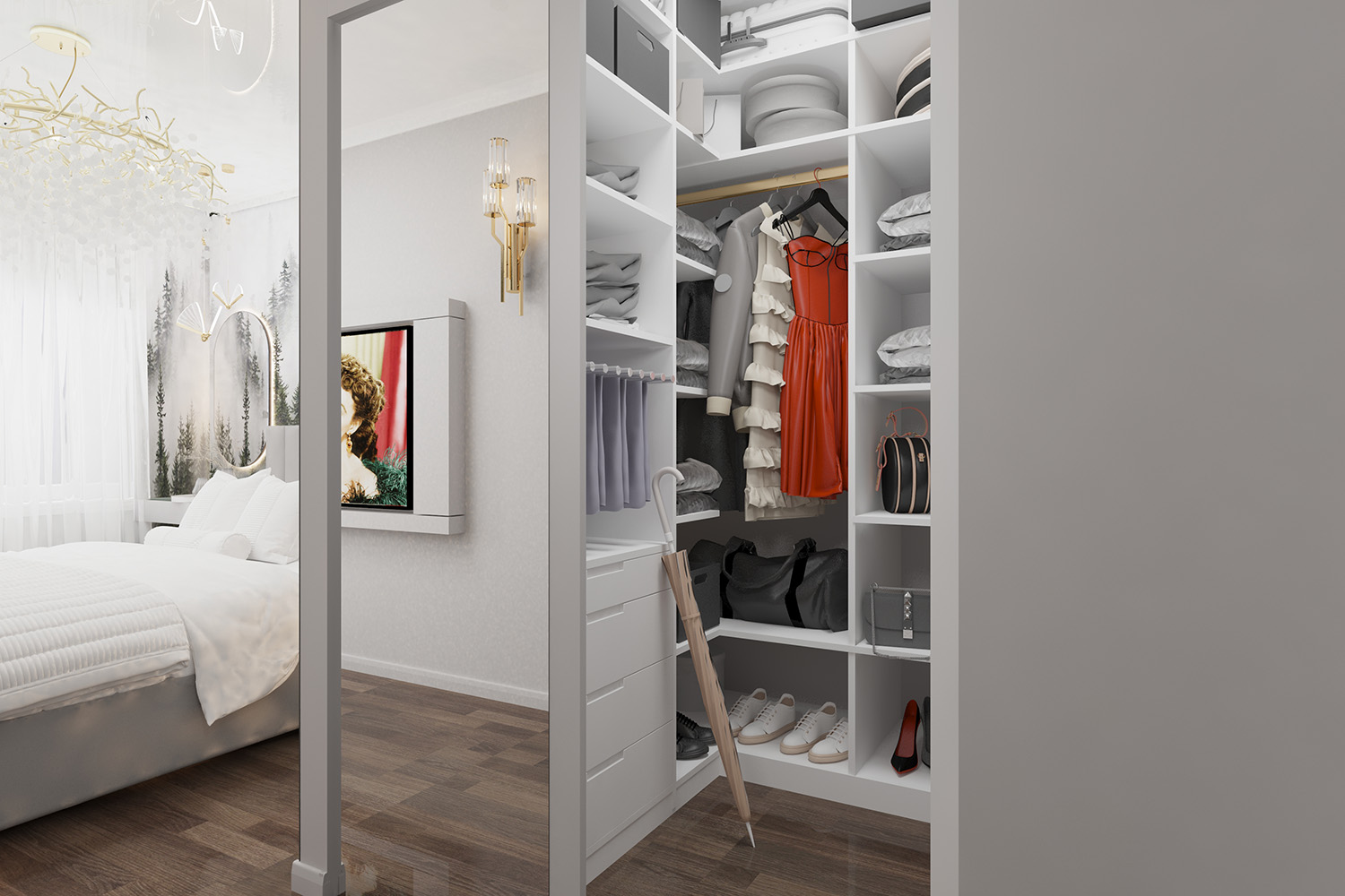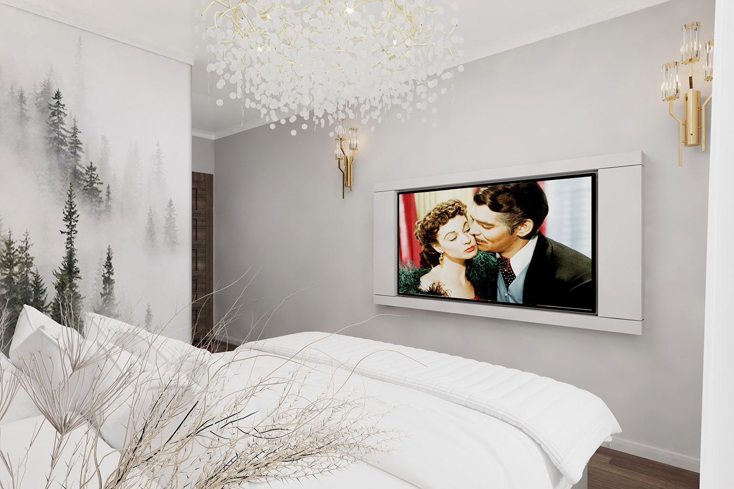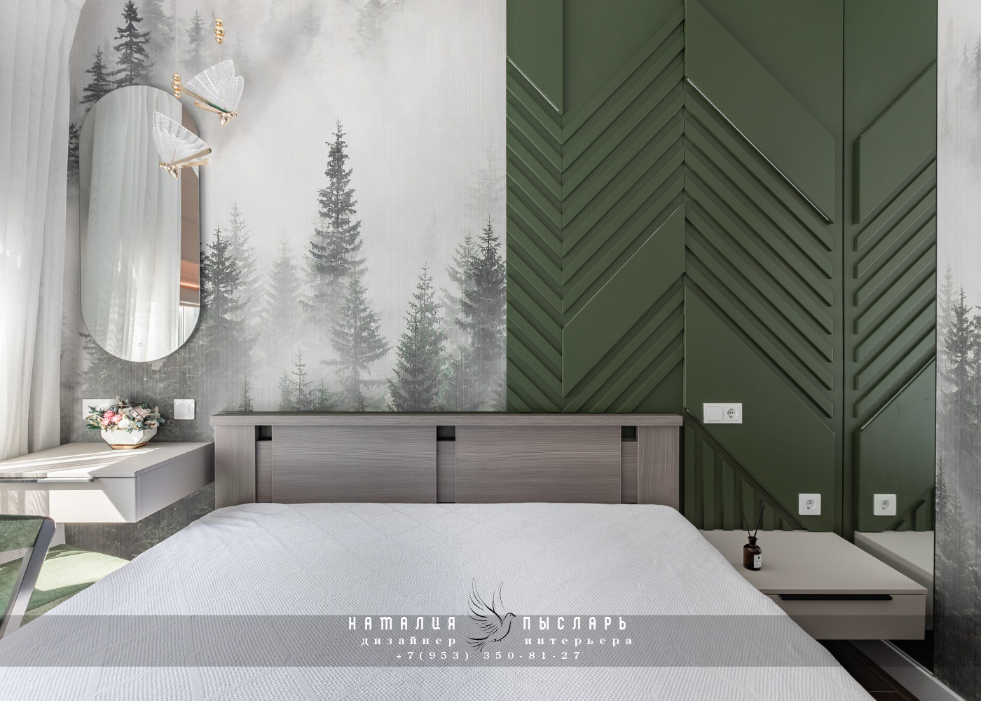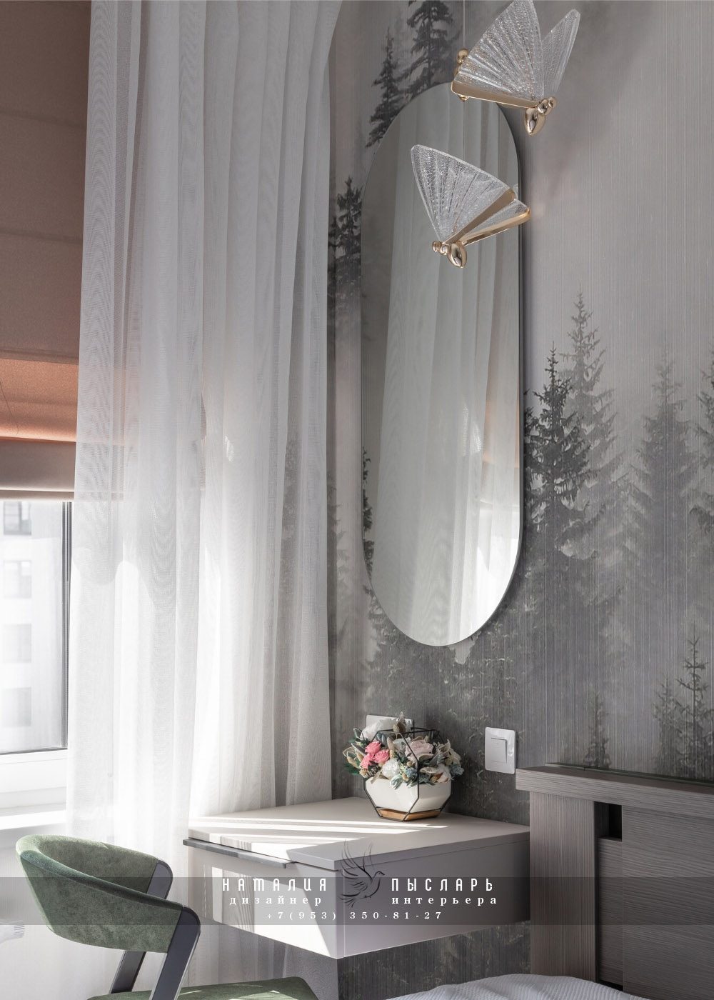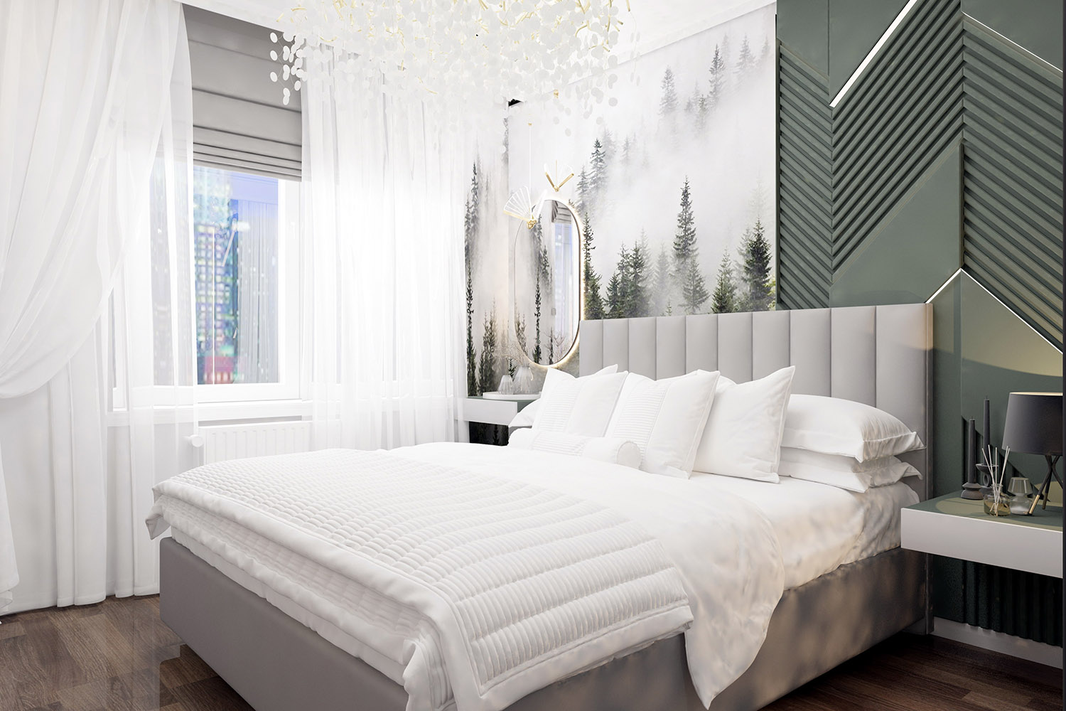 Спальня площадью 14 м² в трехкомнатной квартире в Санкт Петербурге. Компромисс в интерьере достигнут за счет зонирования на мужскую и женскую зону. Обои из коллекции FRAME-2019 добавили интерьеру уюта и воздушности.