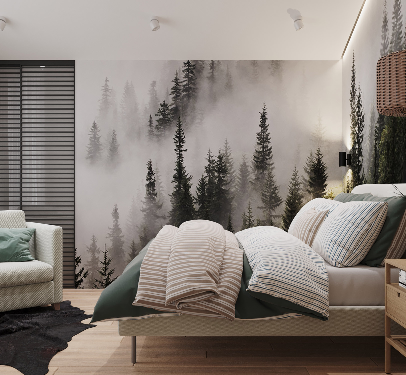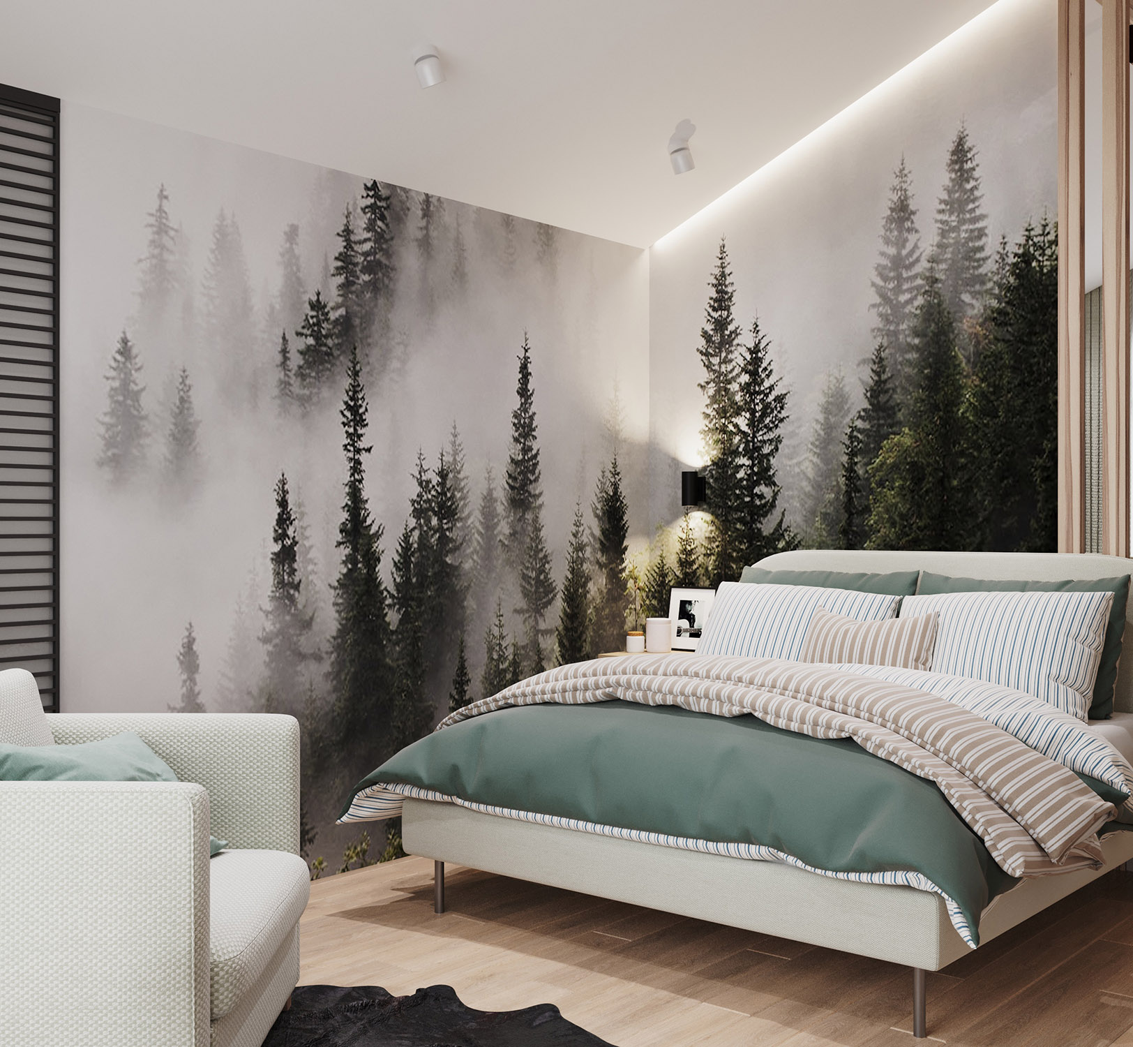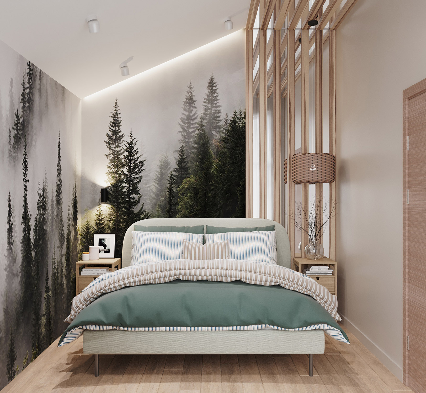 Эта спальня имеет мансардный потолок. Обои выбраны из коллекции «Frame-2019» с изображением чащи леса, что позволяет наслаждаться природой, находясь в комнате. На стенах будто раскинулись зелёные заросли, которые так и манят своей свежестью и утренней прохладой.