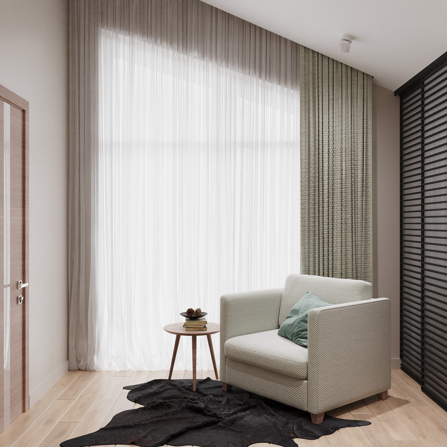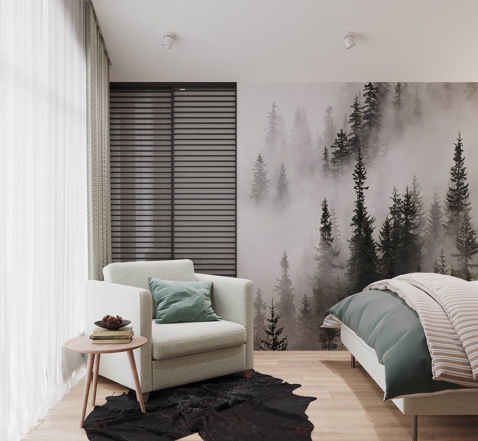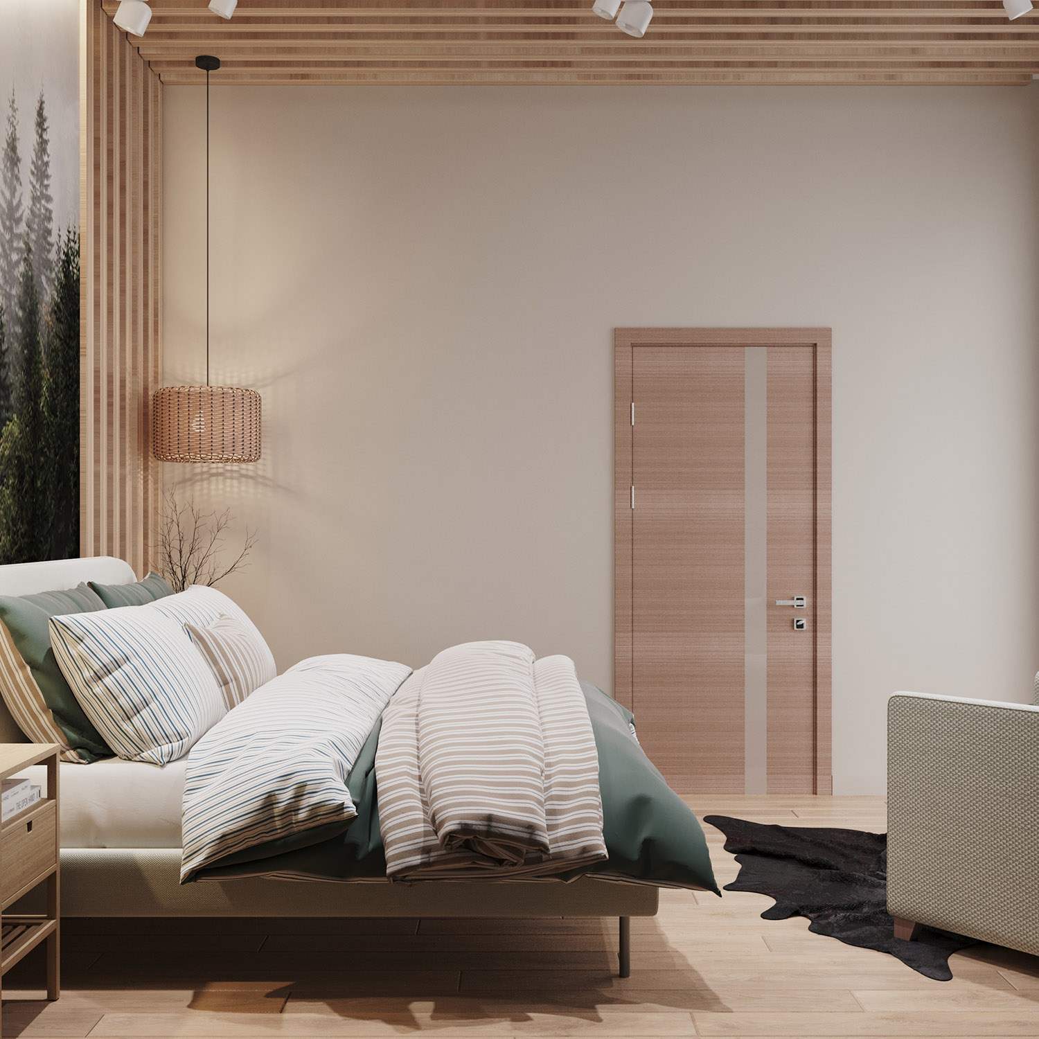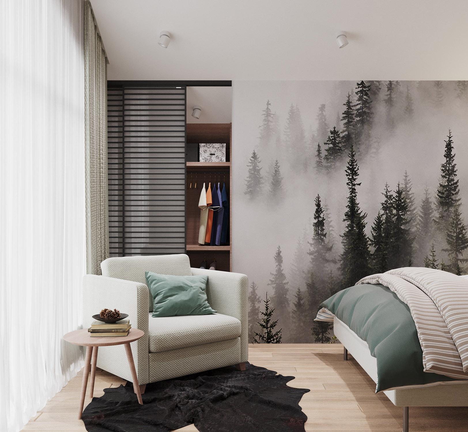 Эта спальня имеет мансардный потолок. Обои выбраны из коллекции «Frame-2019» с изображением чащи леса, что позволяет наслаждаться природой, находясь в комнате. На стенах будто раскинулись зелёные заросли, которые так и манят своей свежестью и утренней прохладой.