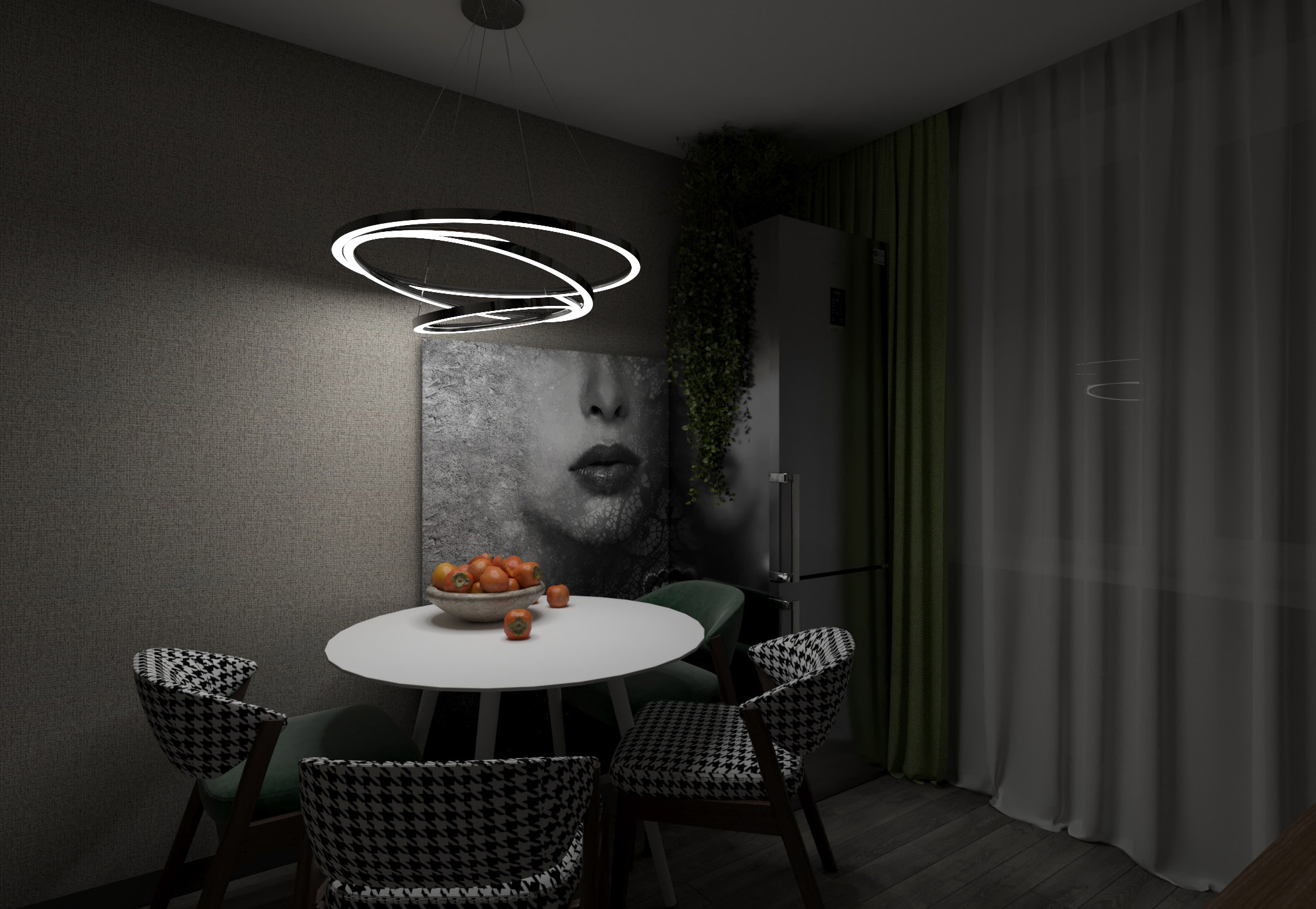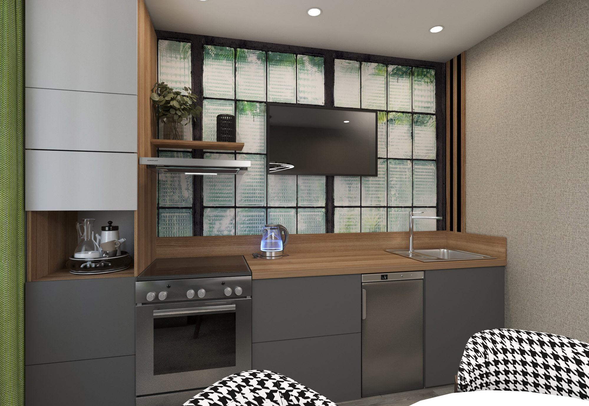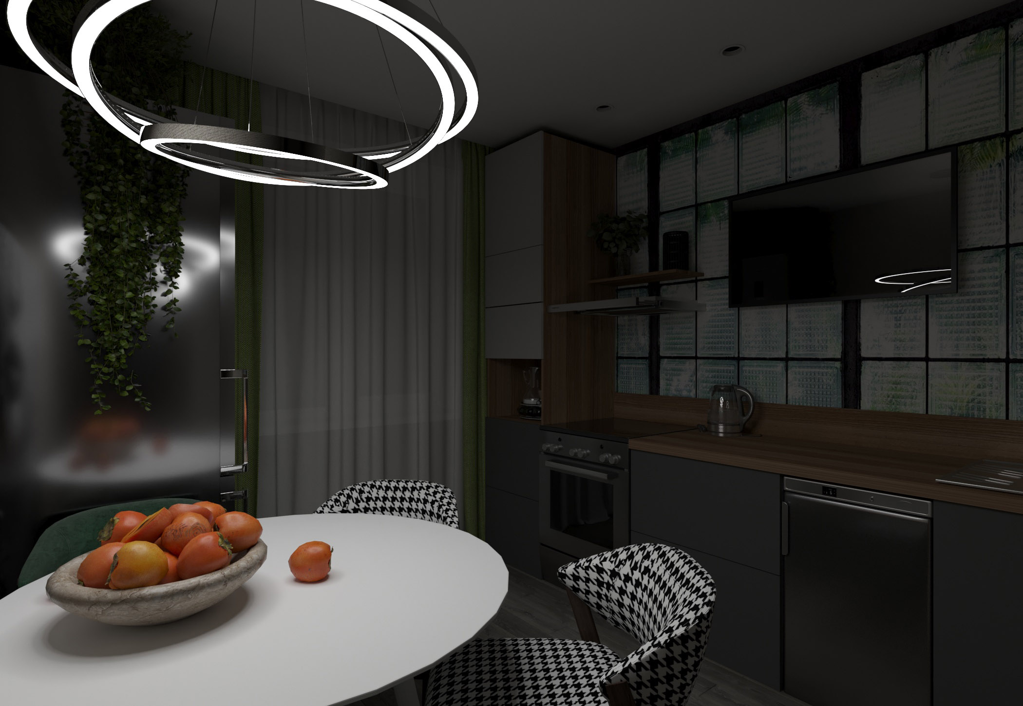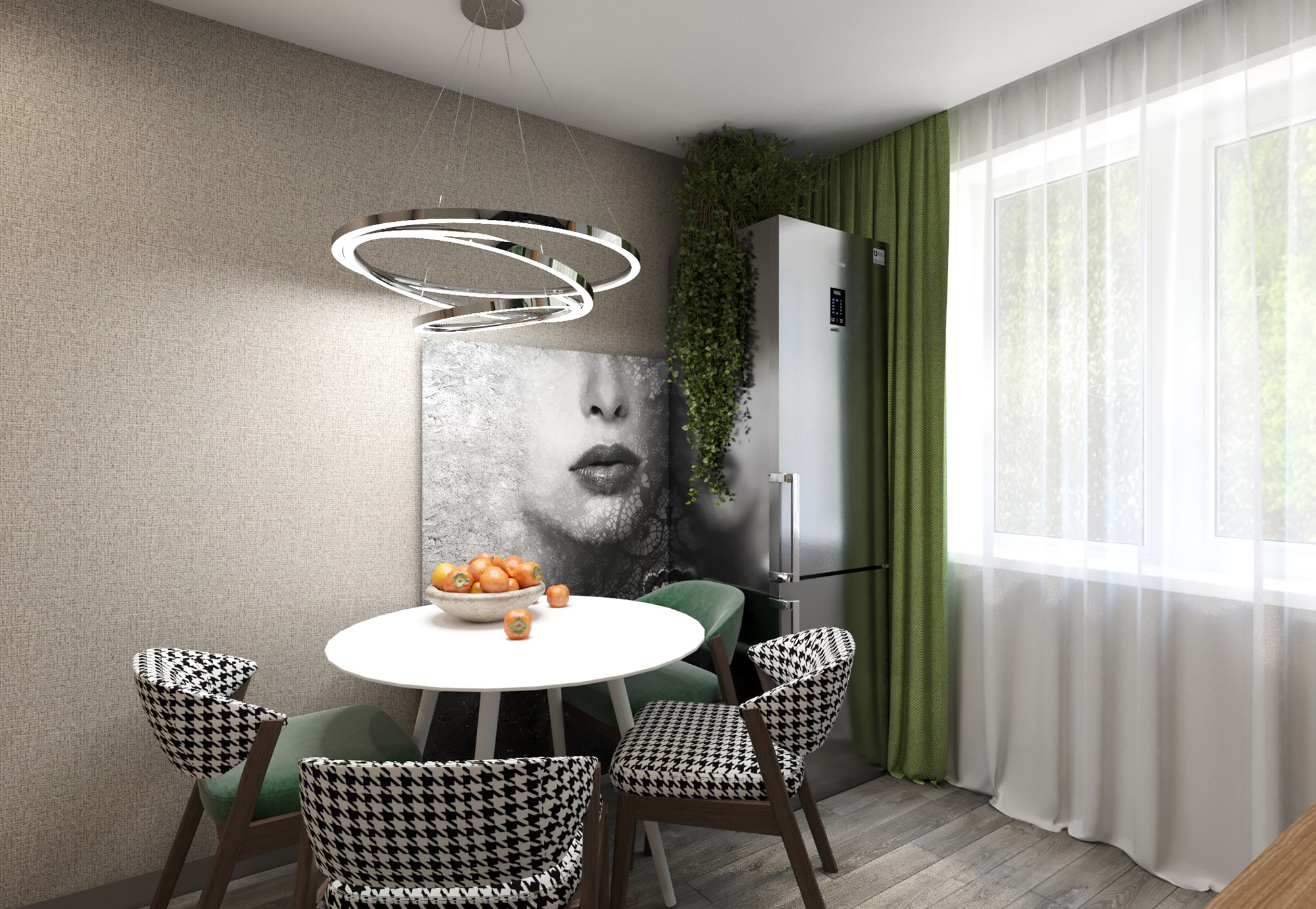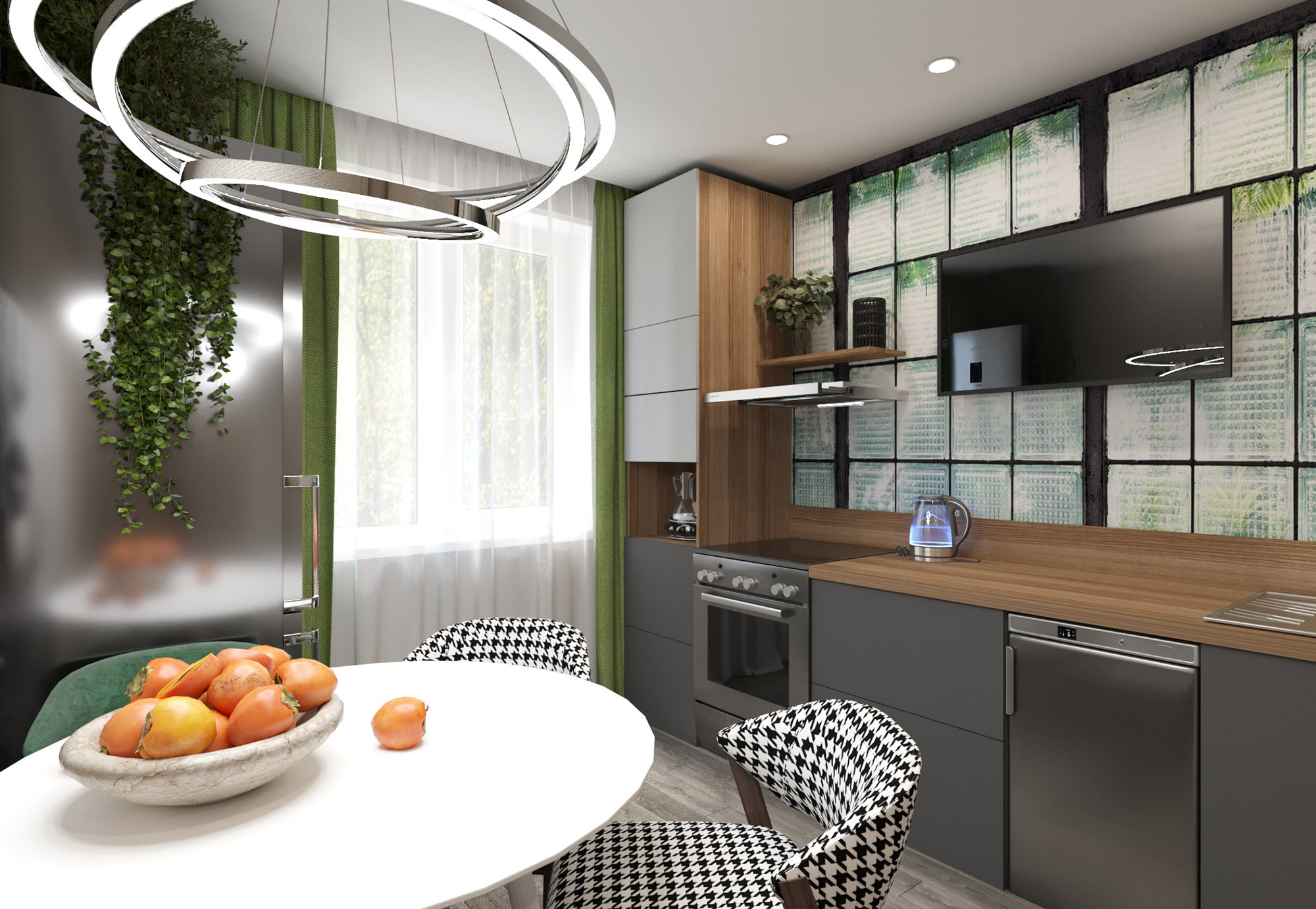 В семье мало готовят, и если и собираются, то возле телевизора. Поэтому минималистичная кухня площадью 9 м² с красивейшими современными обоями «Frame» стала отличным решением. Благодаря этим обоям помещение маленькой кухни визуально стало больше, как будто добавили еще одно окно.