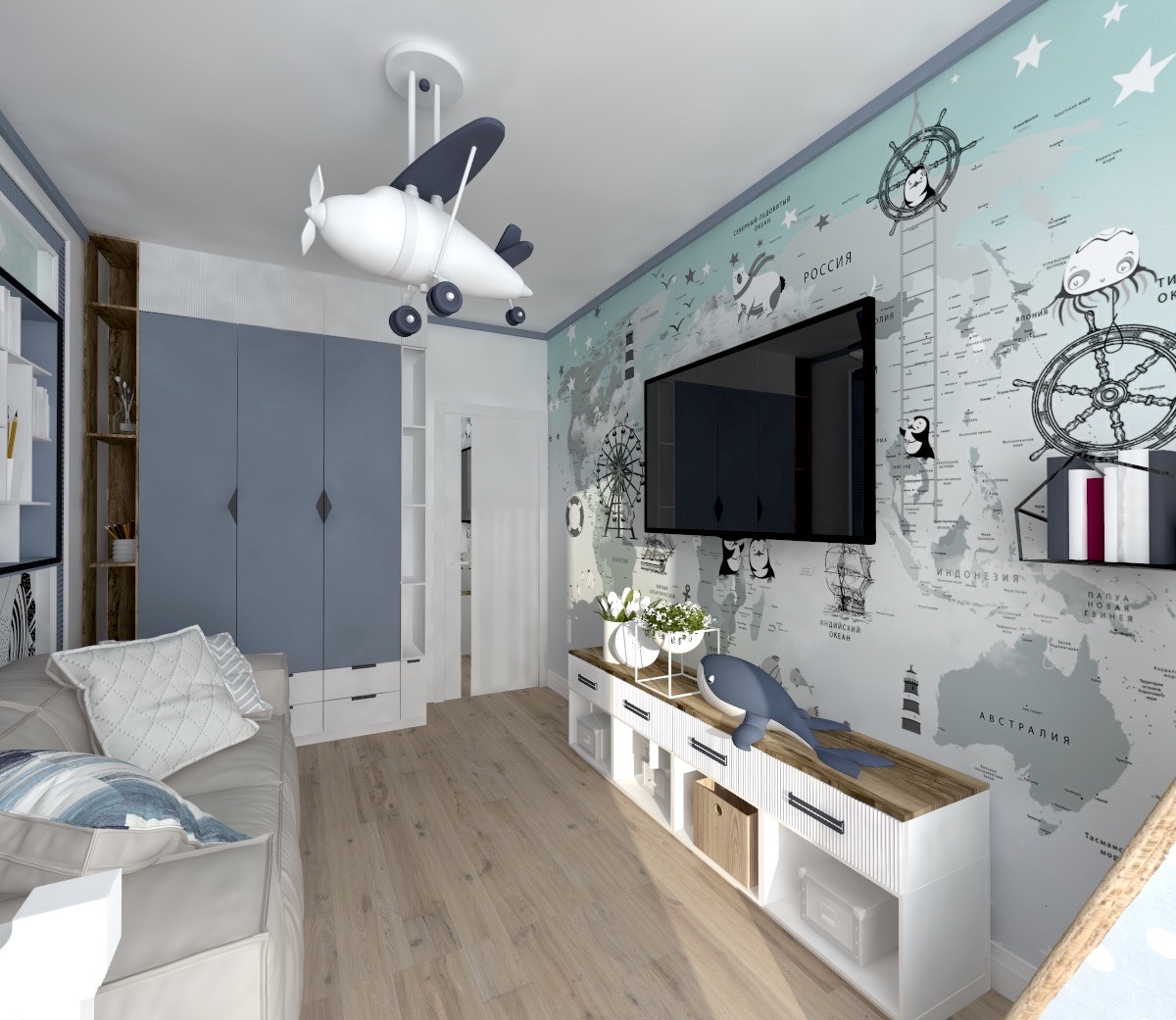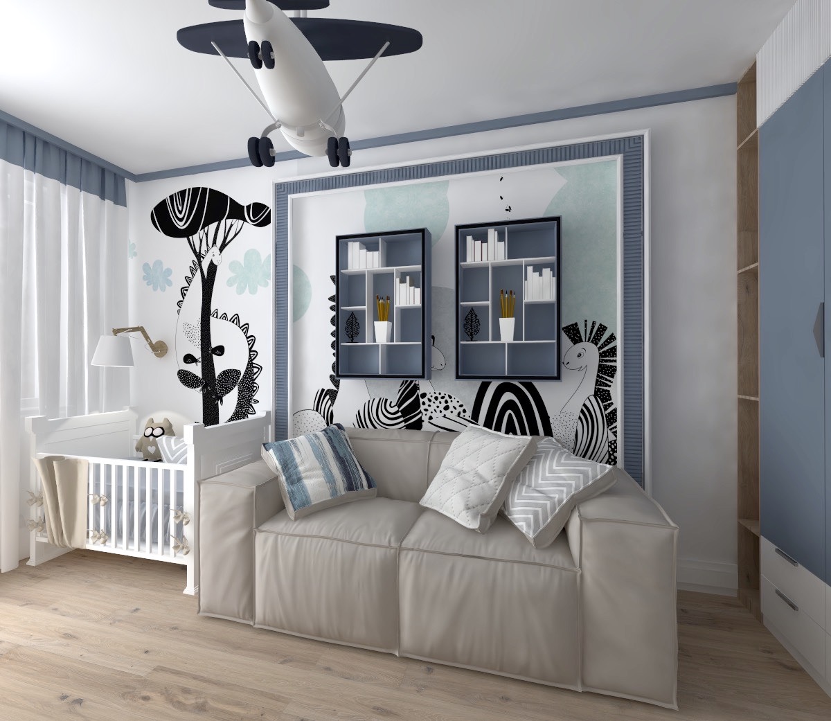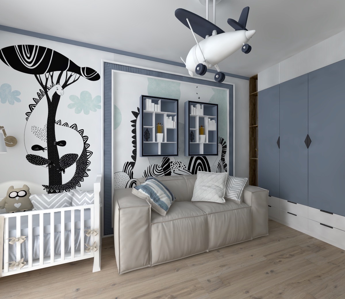 Проект детской комнаты площадью 12 м² выполнен для маленького малыша. В комнате предусмотрены места хранения и диванчик для мамы на случай, если малыш плохо засыпает. Ну а для хорошего настроения использованы прекрасные обои Dino Rino 5, Dino Rino 10 и Funny Tour.