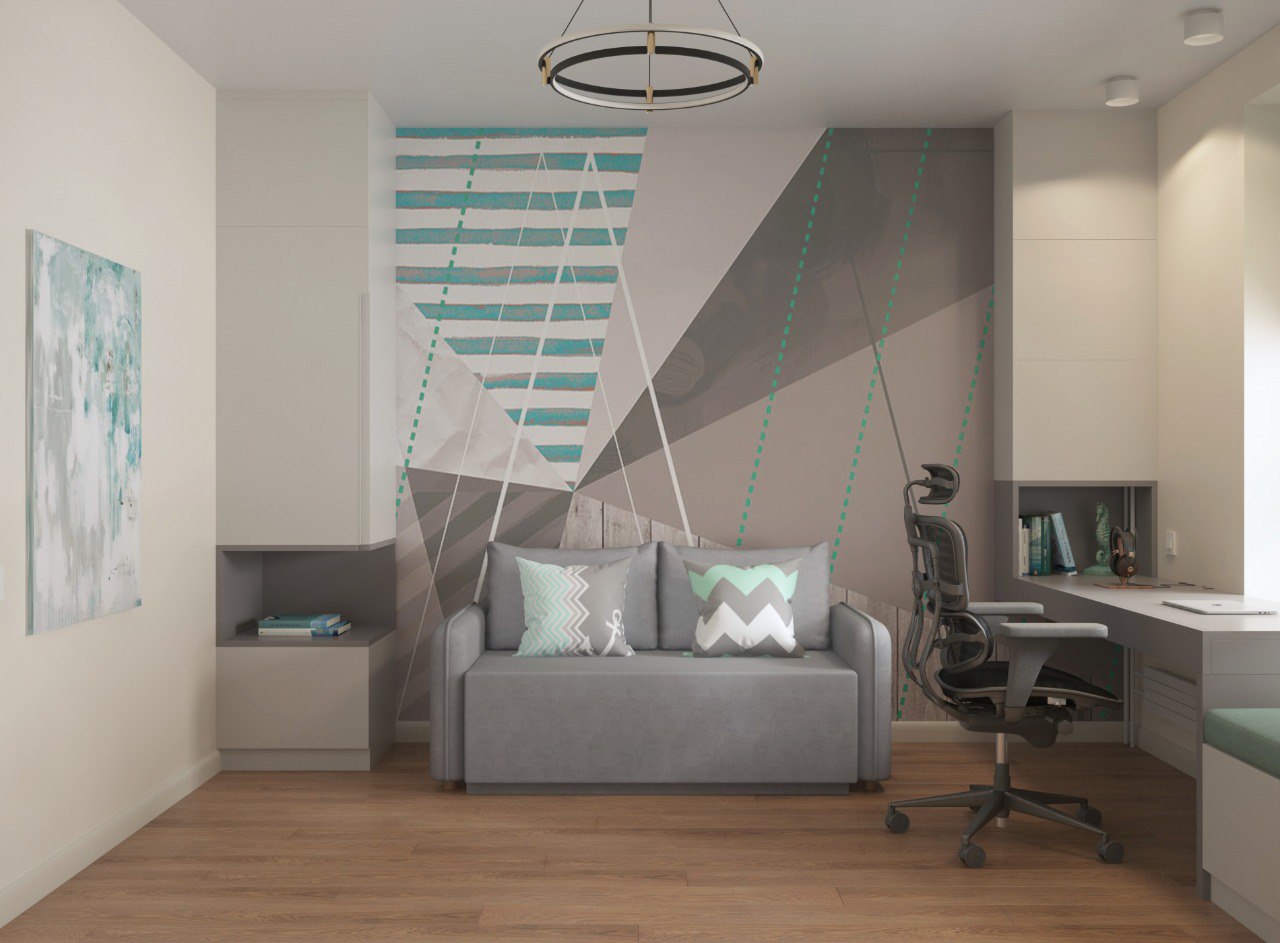 В кабинете преобладает минимализм в природных тонах: цветовая гамма носит естественный характер. Мягкость интерьеру придают оттенки природных цветов: цвет морской волны, песка, гальки.