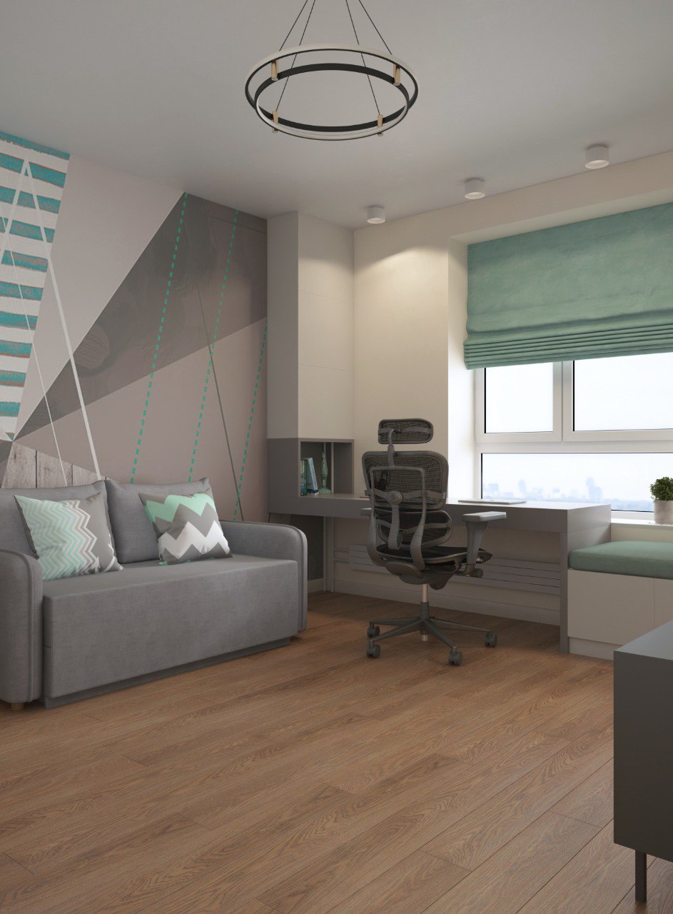 Кабинет площадью 14 м² в квартире, расположенной в г. Химки. Квартира выдержана в стиле минимализм с добавлением природных материалов, акцентов из натурального дерева в виде декоров и порталов. Предметы контрастируют друг с другом, создавая творческую атмосферу.