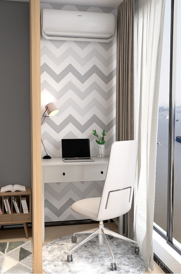 Спальня в скандинавском стиле в Москва-Сити, где клиент просил больше воздуха и меньше мебели. Геометричные обои из коллекции Geometry подошли как нельзя лучше!