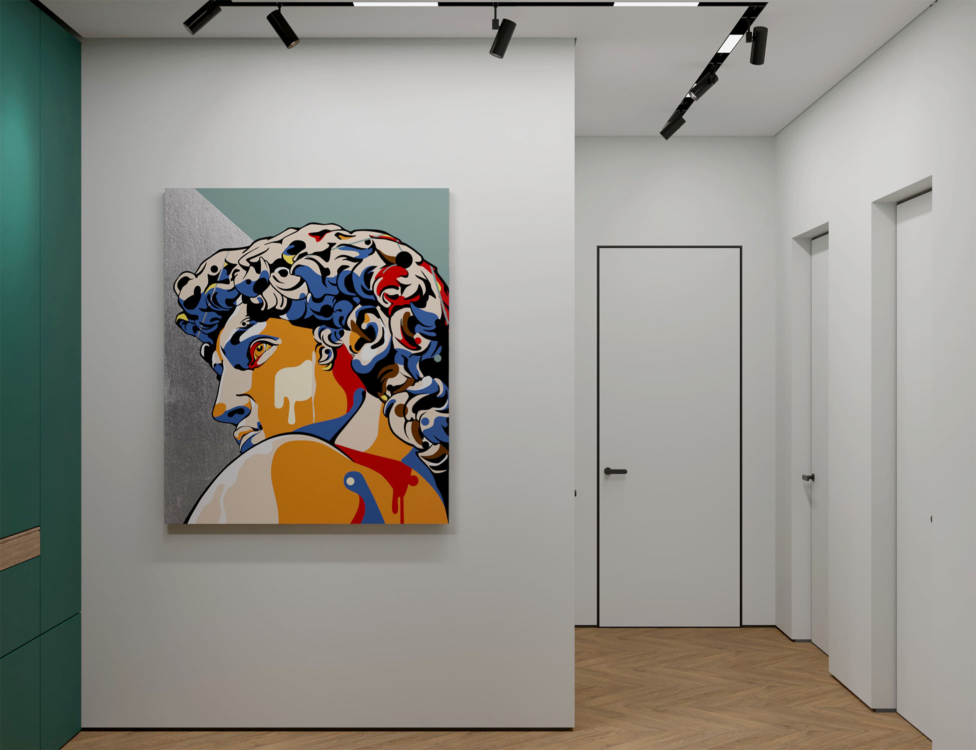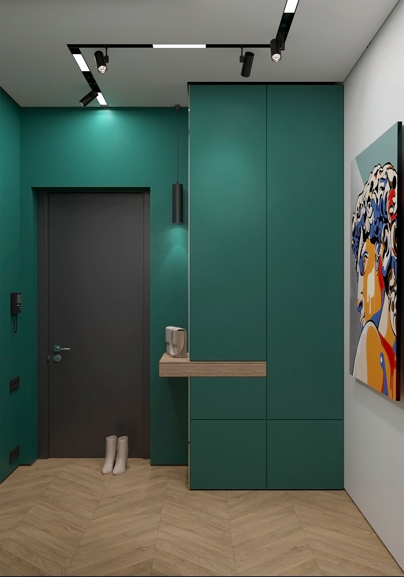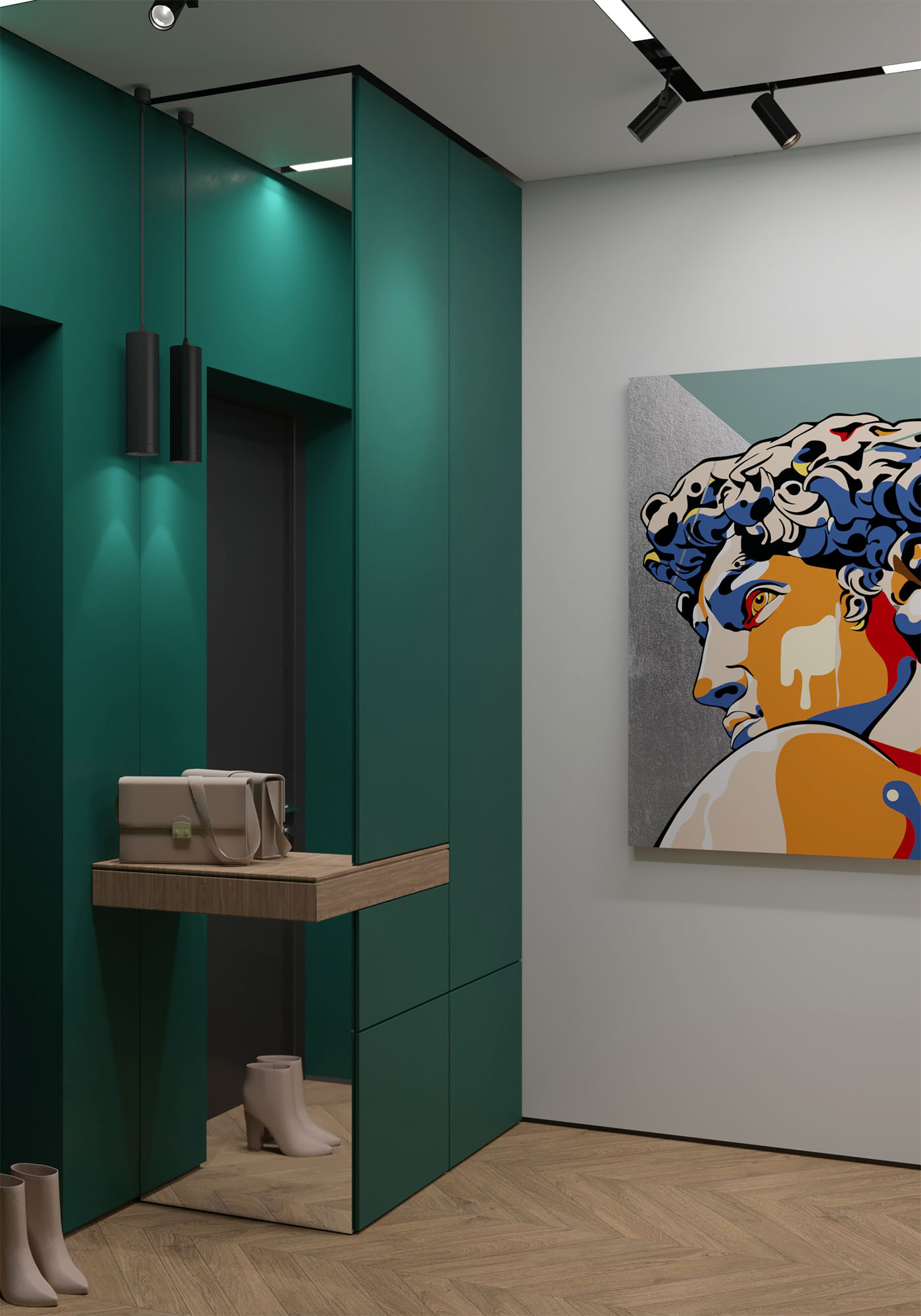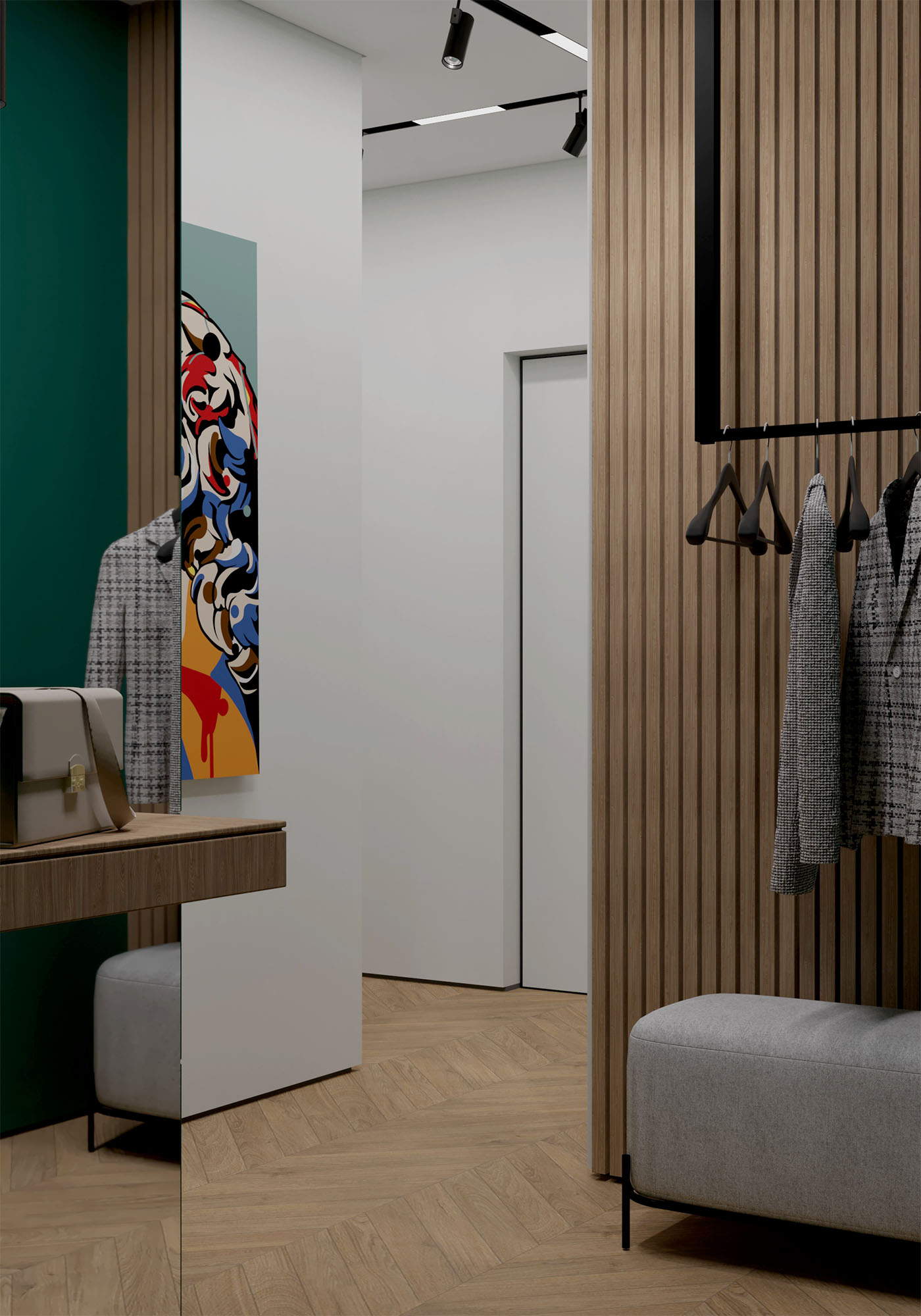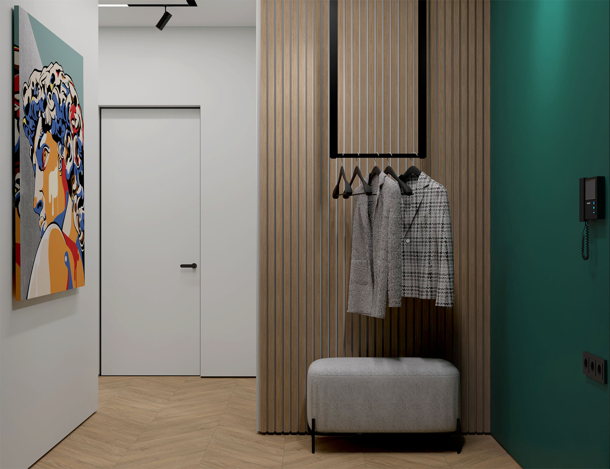 Входная зона и коридор двухкомнатной квартиры в Санкт-Петербурге. Небольшие габариты помещения удалось не перегрузить с помощью дверей скрытого монтажа и легкой системы хранения при входе в виде металлической вешалки, а также окраской встроенных шкафов в цвет стен. Картина из коллекции GOLD SET идеально выступила в качестве акцента.