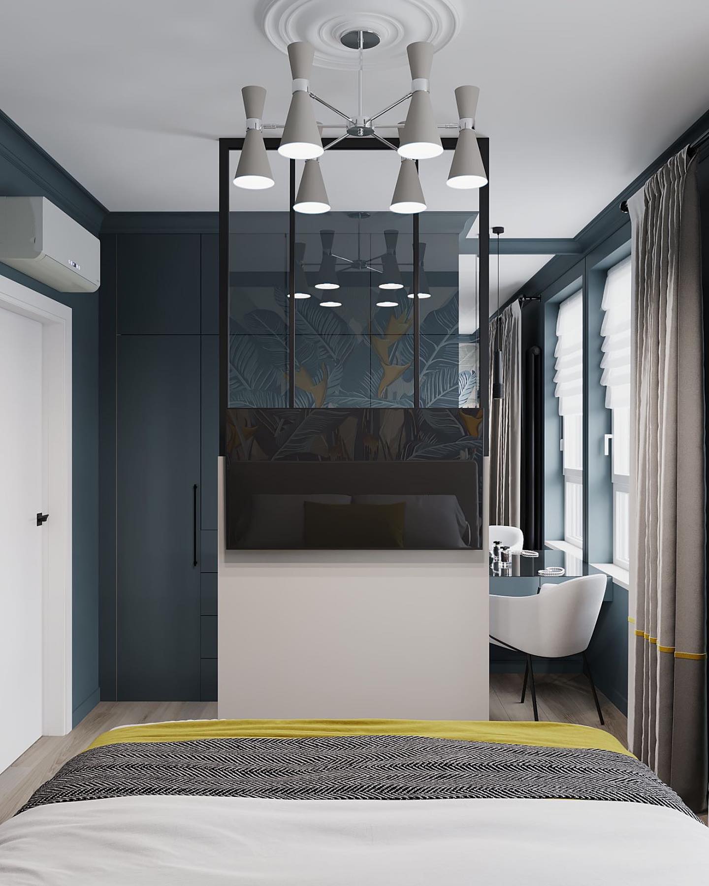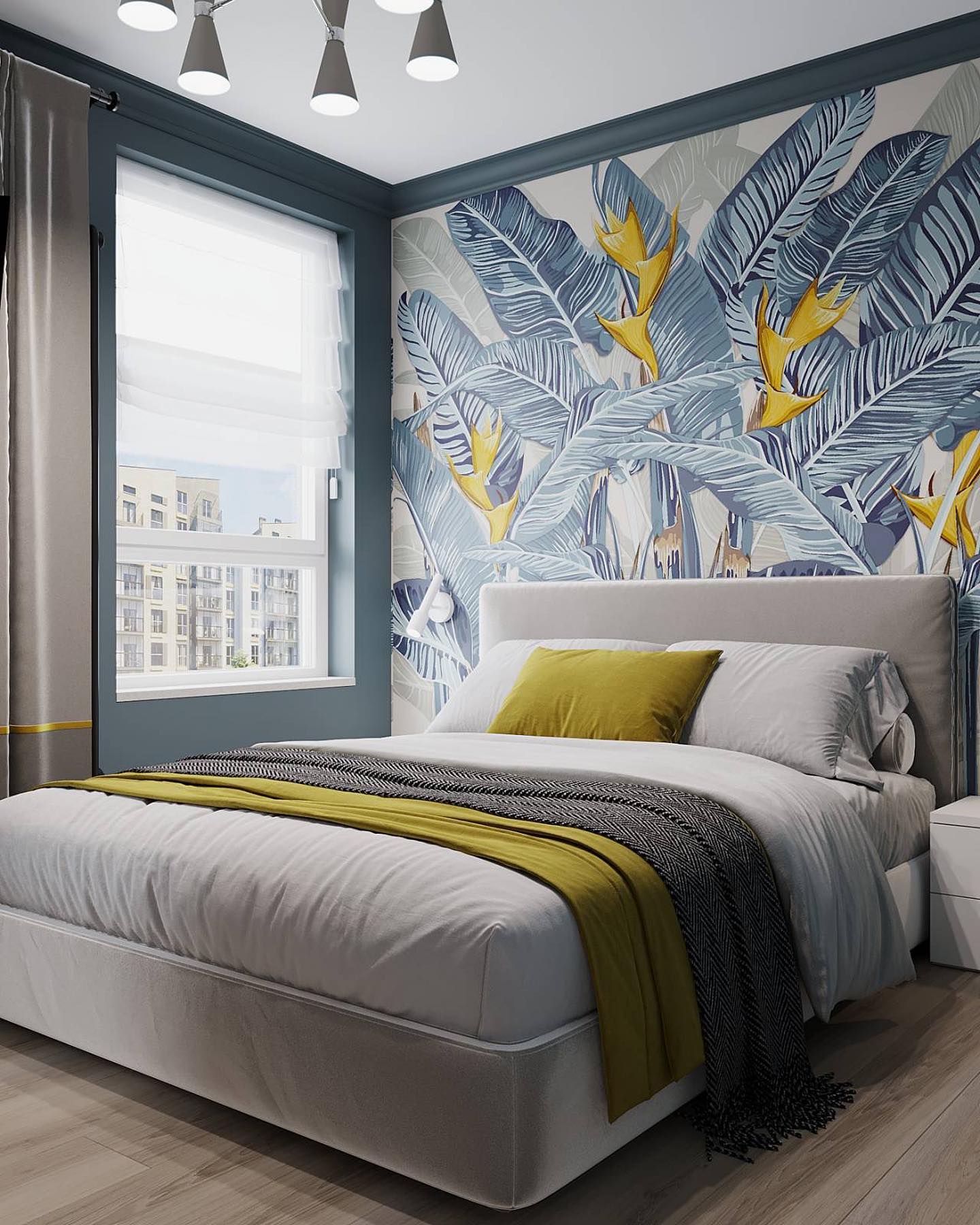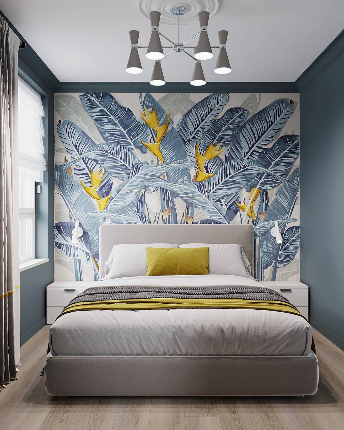 Необычный проект спальни с обоями из коллекции «Green Tropez». Наши дизайнеры создали для вас эту прекрасную коллекцию, вдохновившись чудесными тропическими пейзажами. На принтах раскинулись изумительной красоты джунгли с яркими рисованными растениями и птицами. Погрузитесь в этот удивительный мир, чтобы прочувствовать его особенную манящую атмосферу!