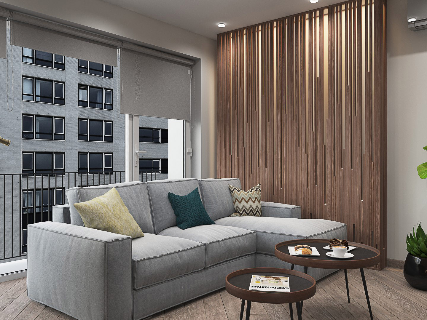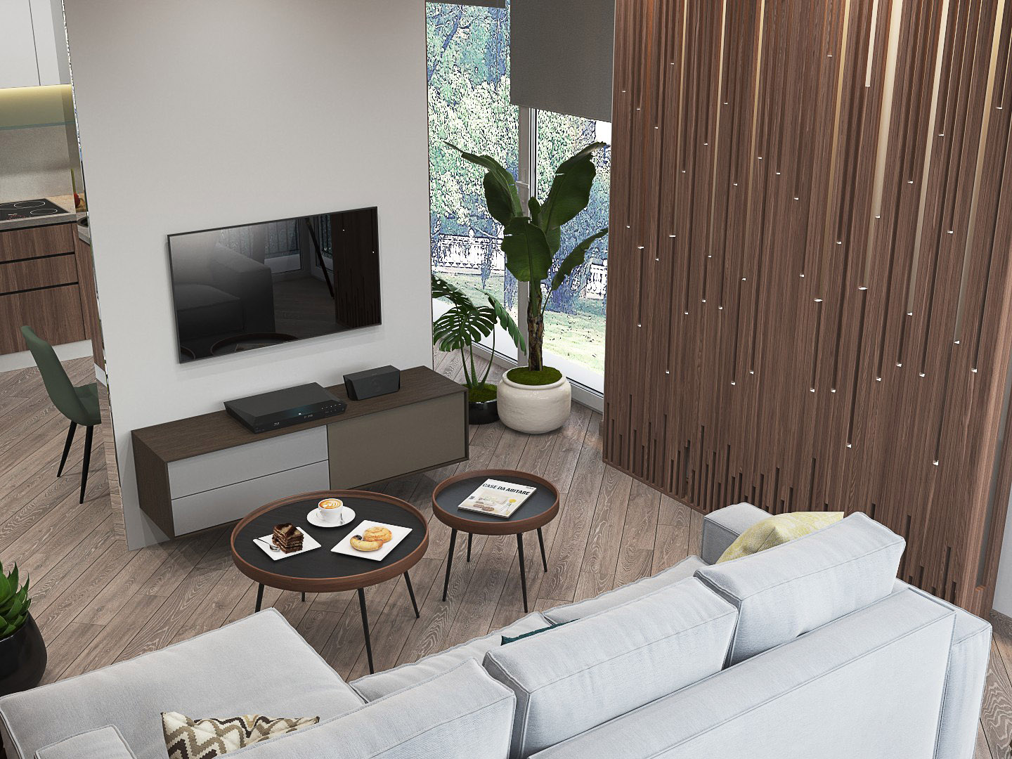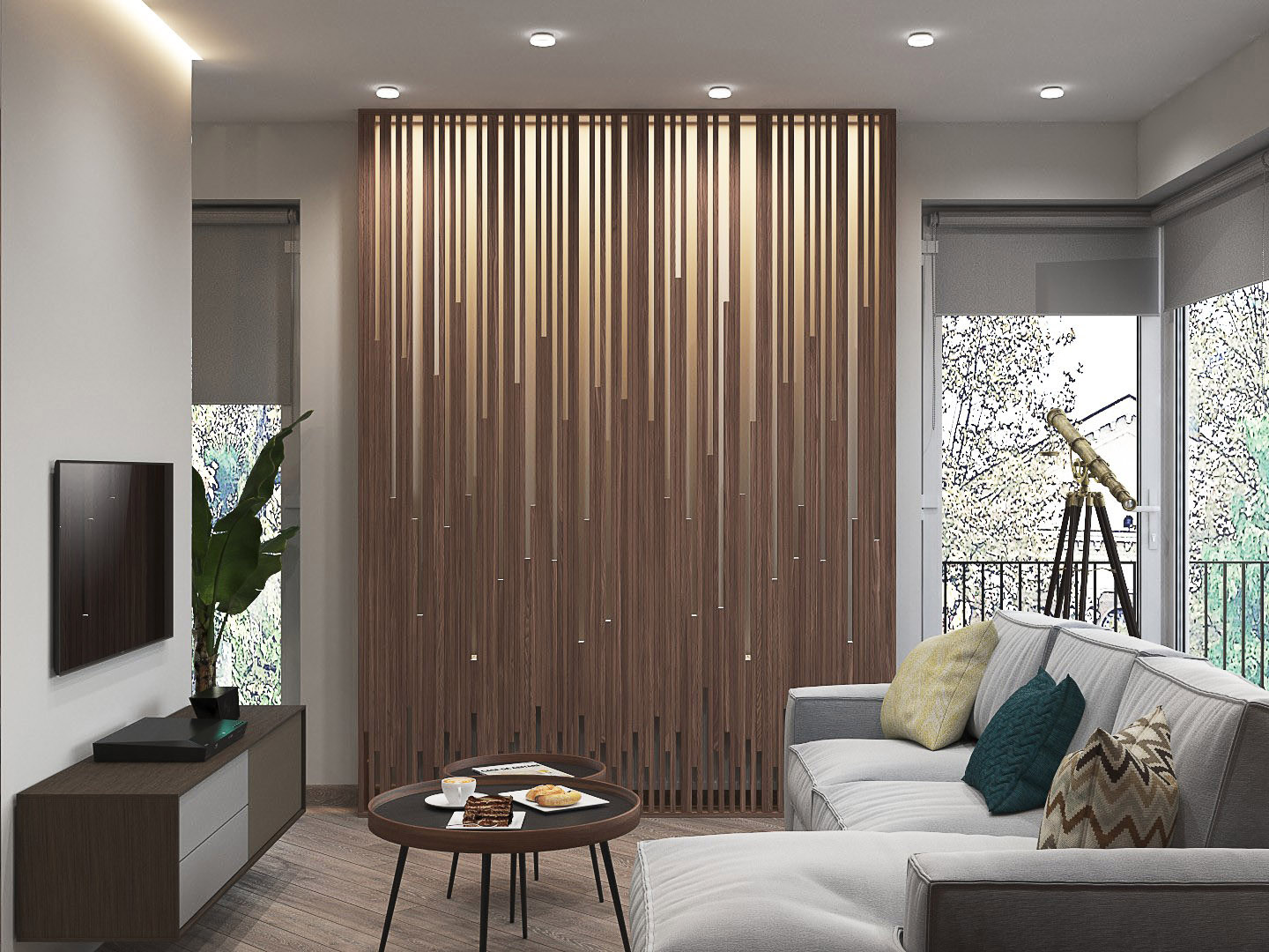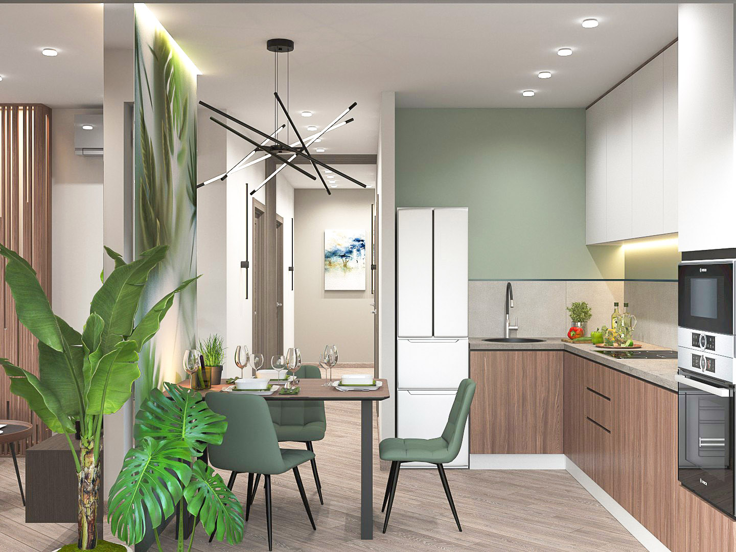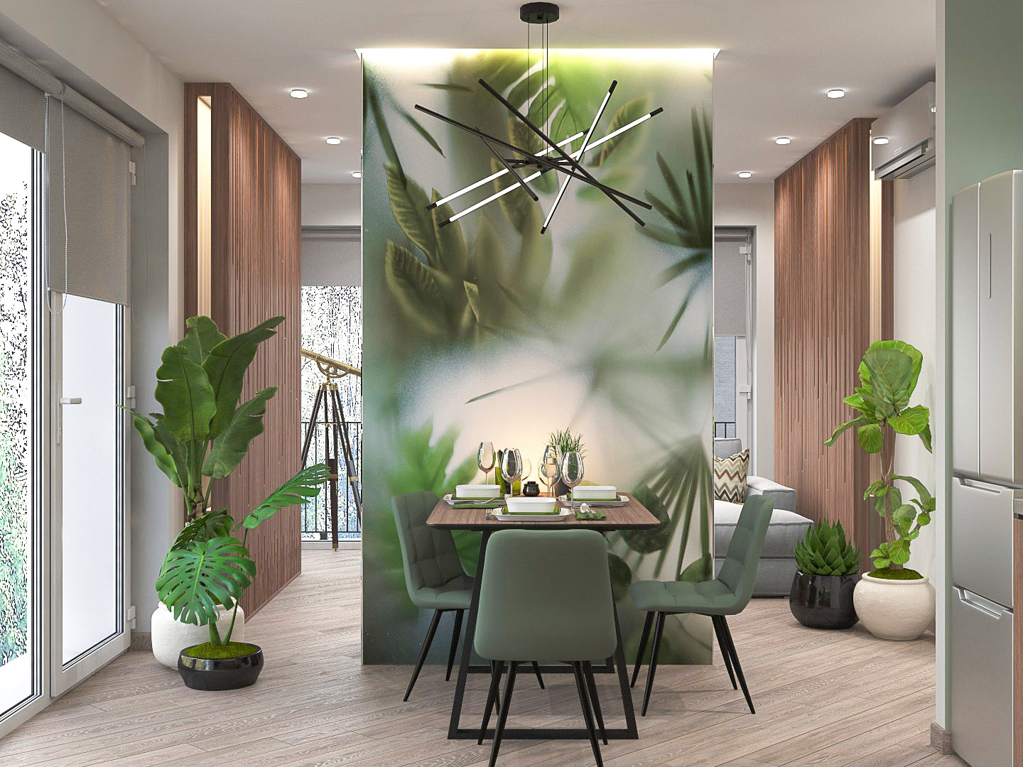 Кухня-гостиная в квартире Новосибирска. Задача стояла разделить большую комнату на две зоны: столовую и гостиную. Сложность была в том, что в квартире есть большие окна в пол и неуместные радиаторы, из-за чего оказалось очень непросто расположить мебель и при этом разделить зоны. Поэтому было принято решение закрыть радиаторы деревянной перегородкой с подсветкой, а помещению добавить легкости с помощью панно с воздушным принтом. Это также дало возможность привнести в интерьер растительные мотивы, что оказалось очень важным для клиентов.