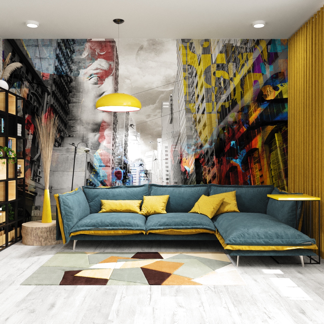 Яркий дизайн гостиной в стиле гранж, для оформления которой дизайнер выбрал коллекцию с соответствующим названием — GRUNGE. Эта коллекция создана специально для тинейджеров. Город, граффити, калиграфия, текстуры — всё это создаёт нужное настроение.