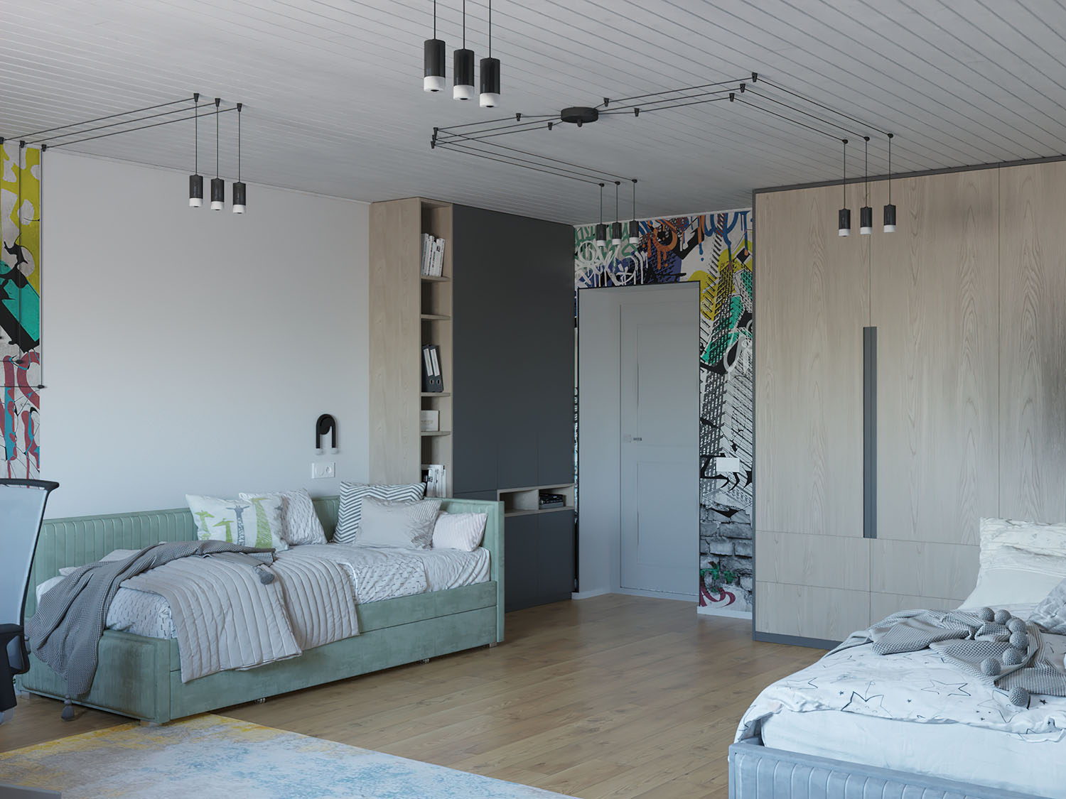Уютная и комфортная комната в частном доме для двух тинэйджеров площадью 27 м², г. Уфа. Дизайн подростковой комнаты в первую очередь должен быть направлен на определение расположения трех основных и необходимых зон: учебную, для отдыха и для досуга. Каким бы маленьким ни было помещение, но эти три так называемых кита должны обязательно присутствовать.