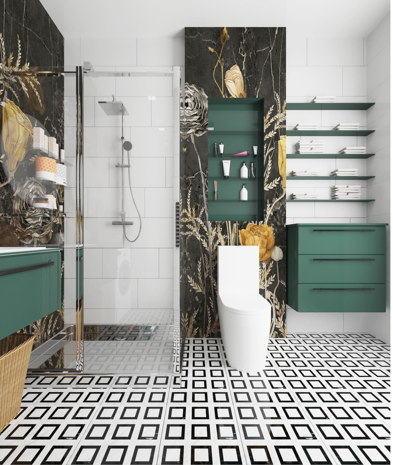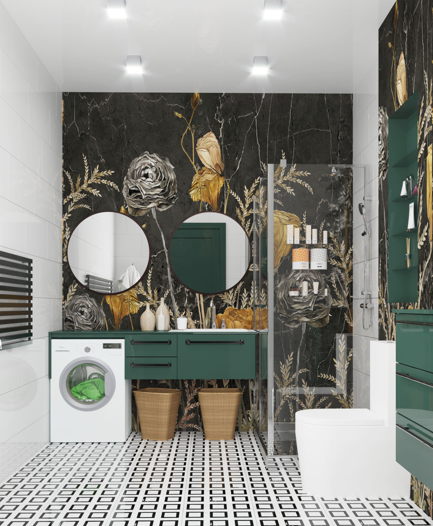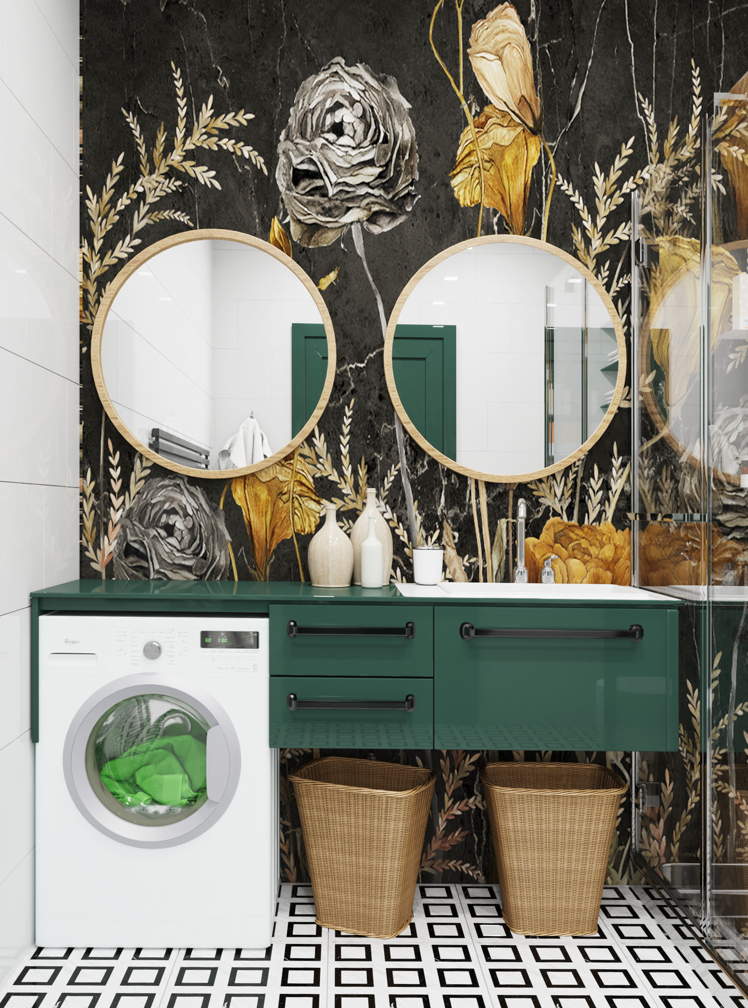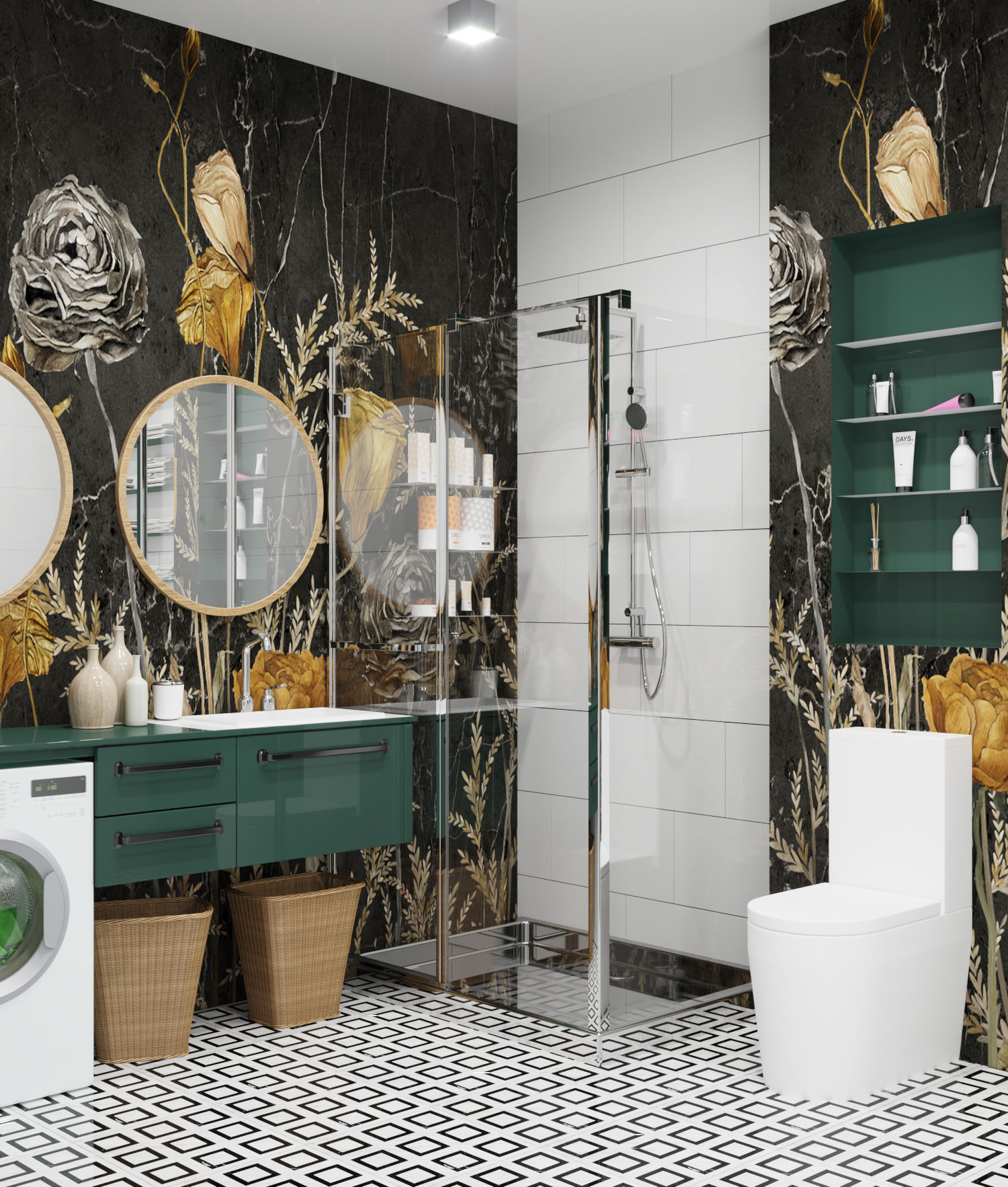 Интерьер санузла для семьи из Санкт-Петербурга. Задача была — избежать банальности, всем так надоела плитка. И сразу нашлось решение, которое удивило, а потом влюбило в себя многих знакомых заказчика — решение с дизайнерскими обоями!