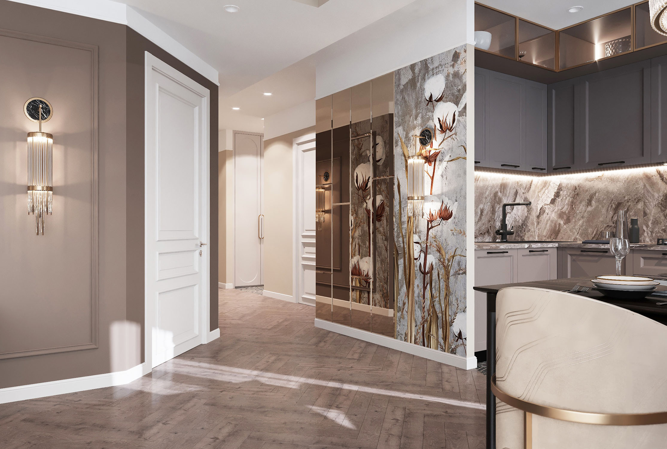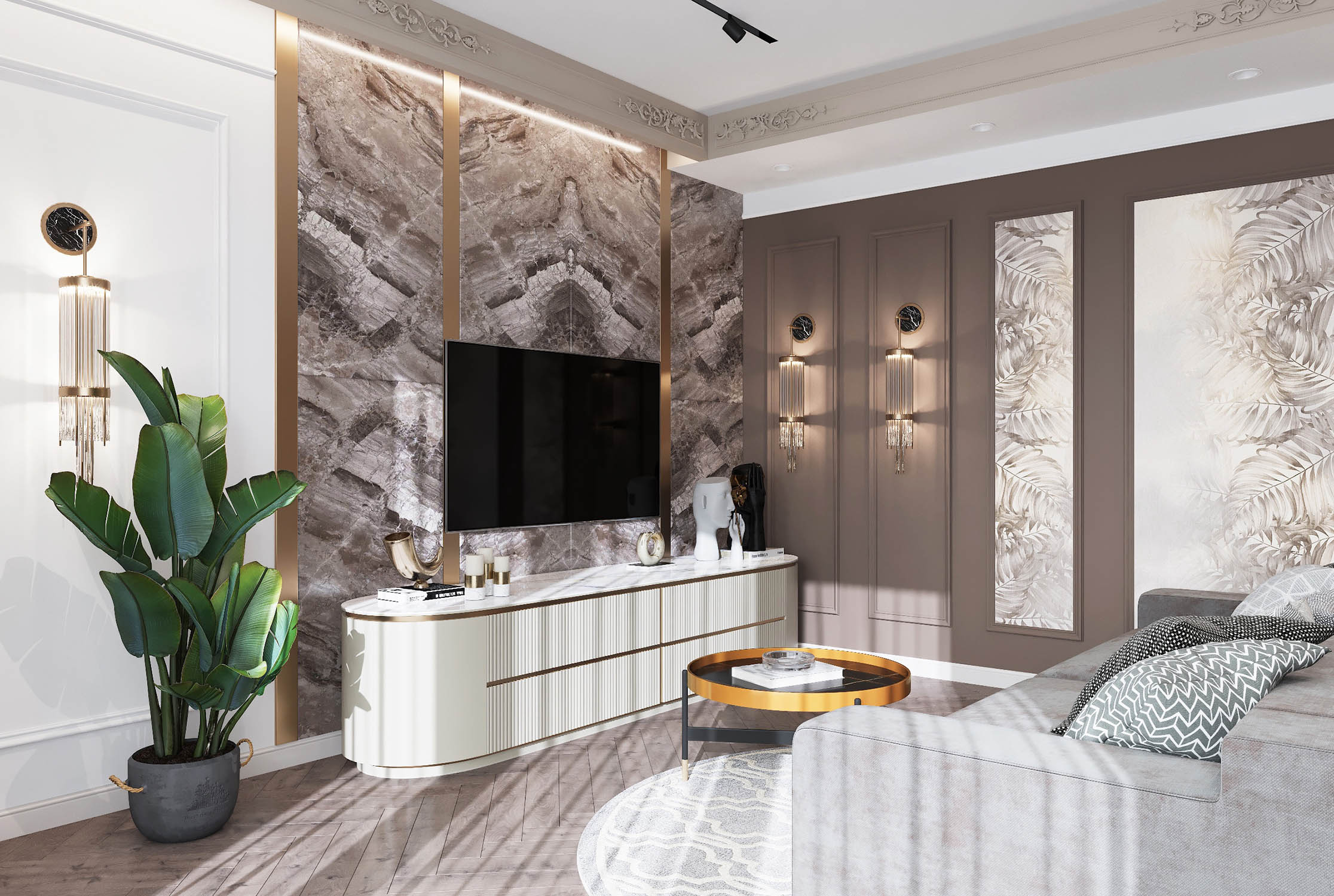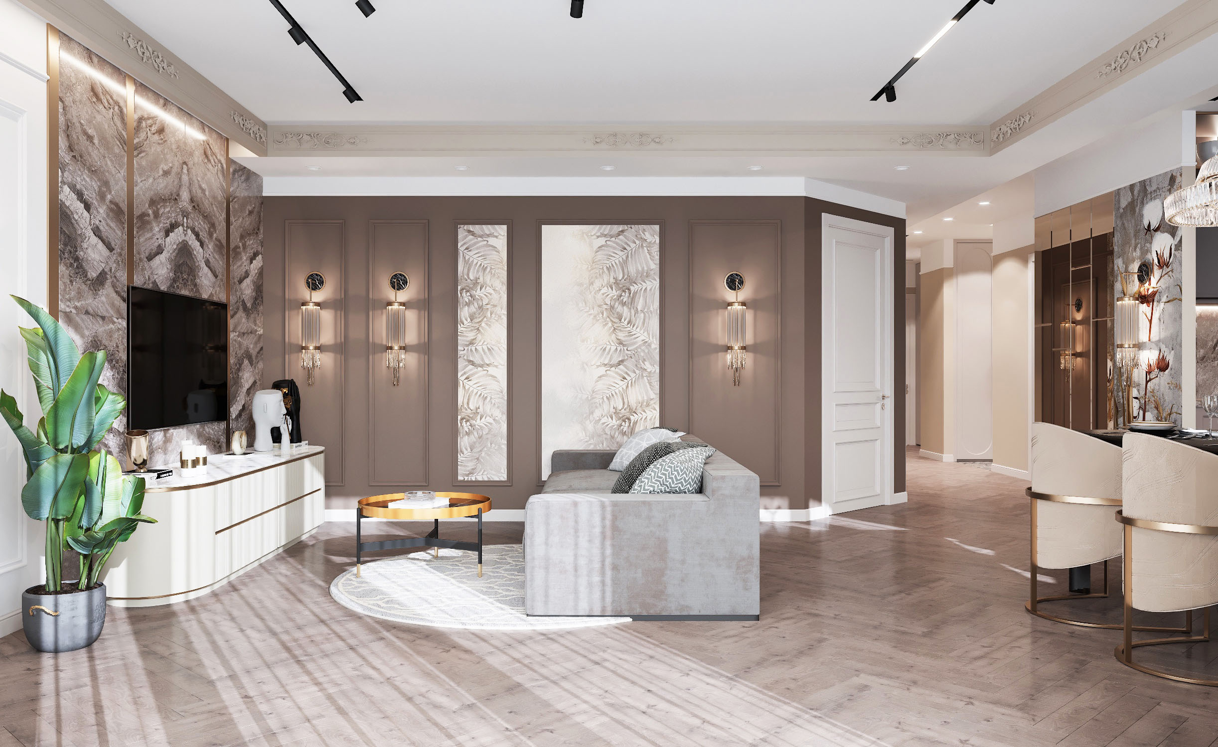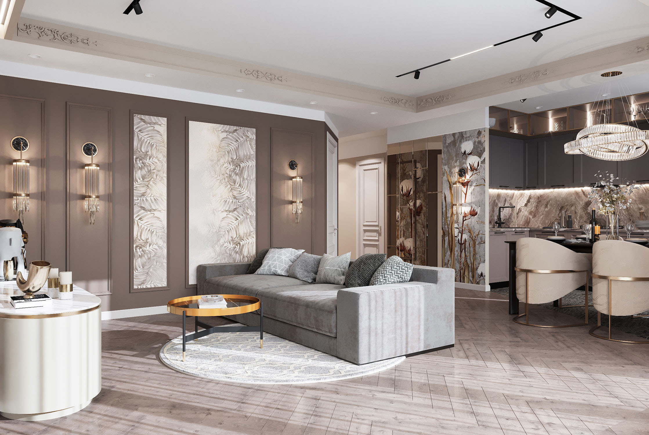 Крупный формат керамогранита в зоне ТВ в сочетании с латунными бронзовыми вставками, декоративные панно, элементы обеденных стульев и люстра над столом придают помещению особый шик, а приглушенная цветовая гамма в сложных благородных коричневых и бежевых оттенках делает освещение красивых бра на тёмном фоне ещё изящнее.