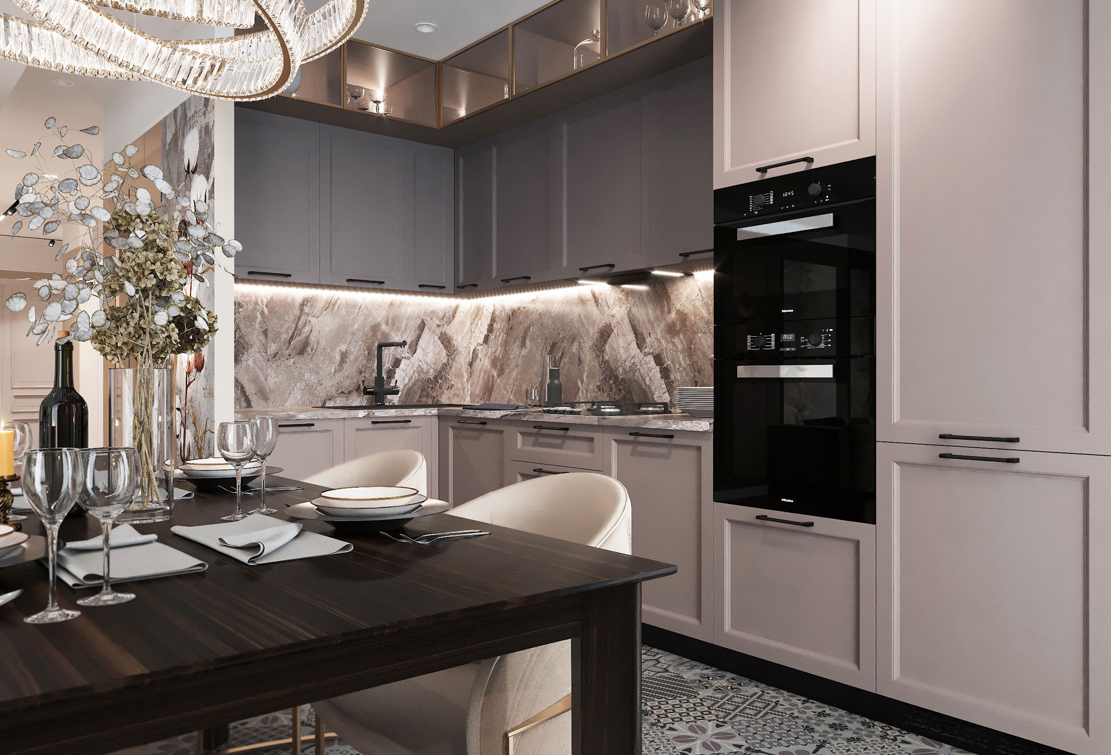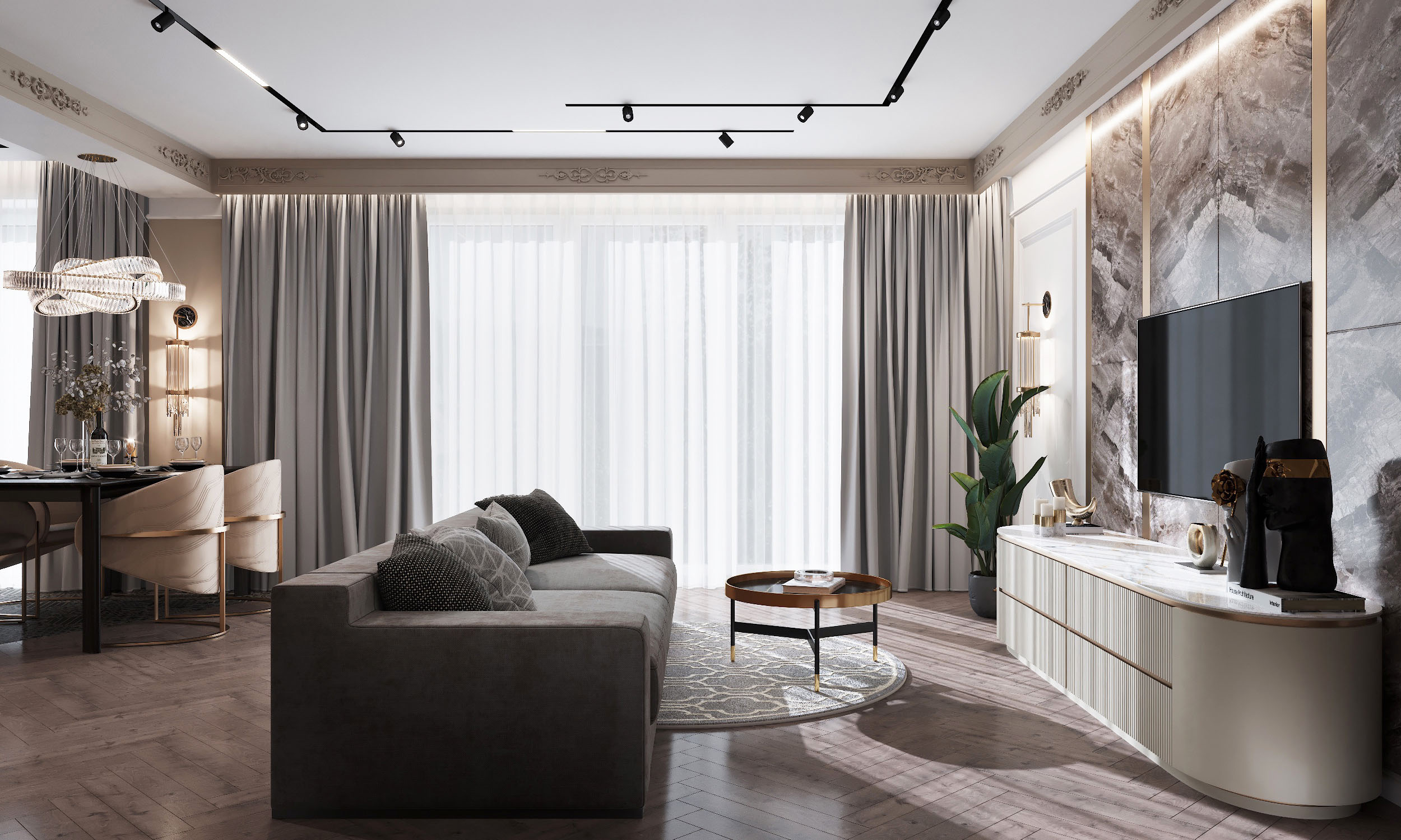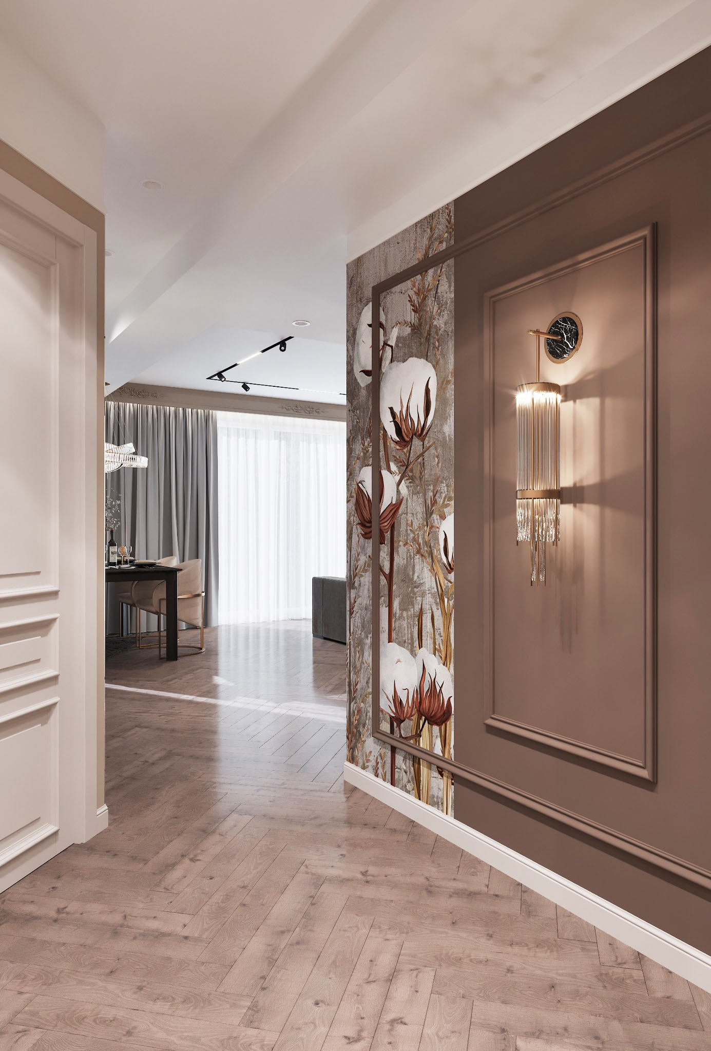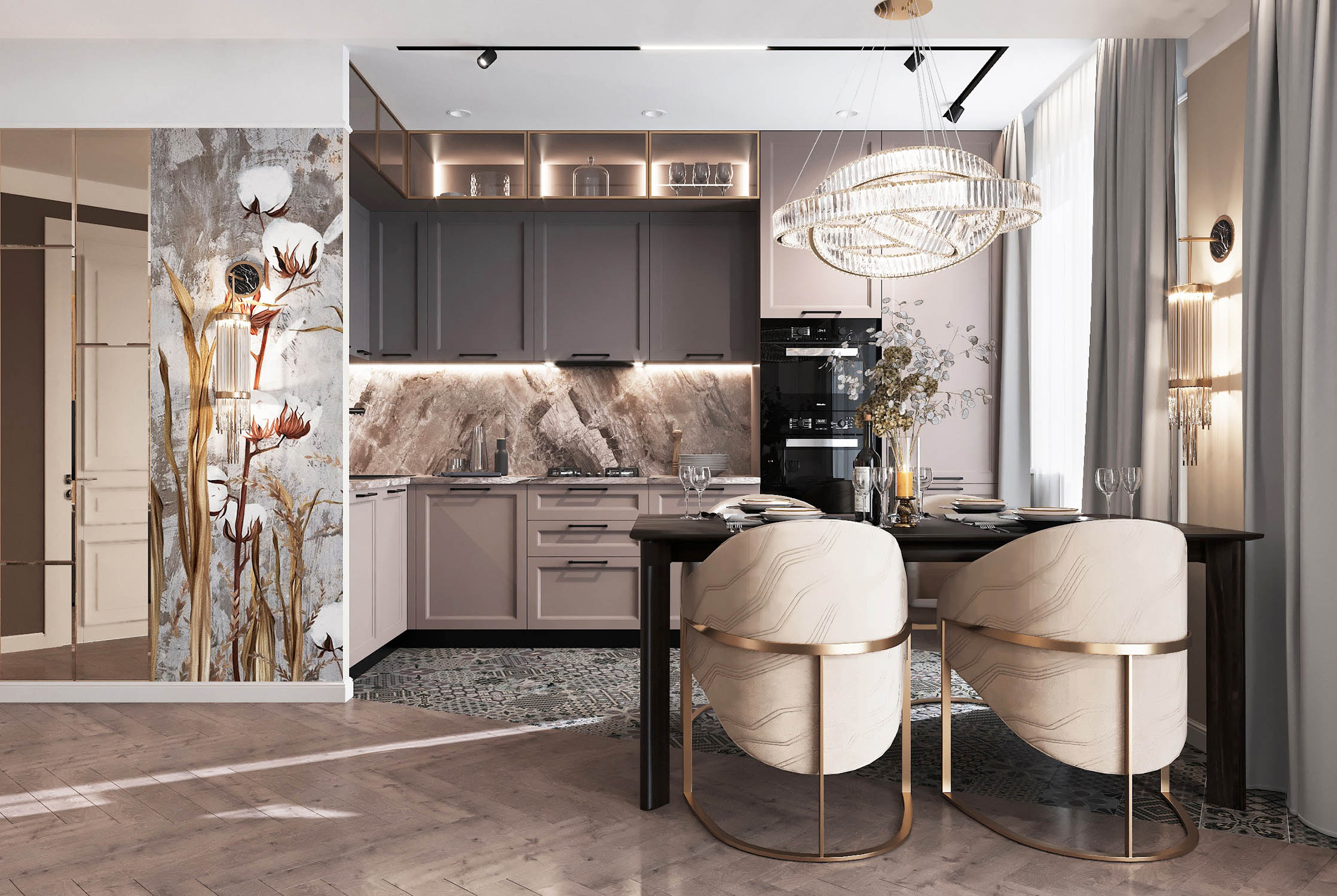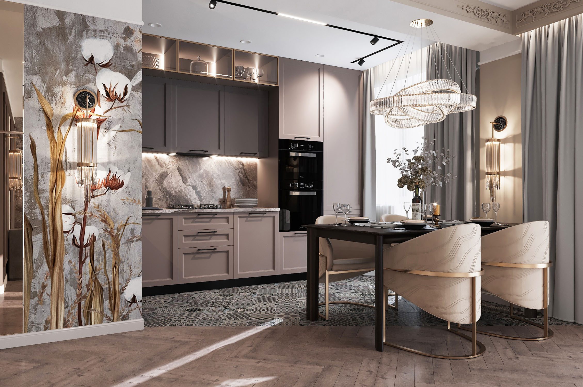 Крупный формат керамогранита в зоне ТВ в сочетании с латунными бронзовыми вставками, декоративные панно, элементы обеденных стульев и люстра над столом придают помещению особый шик, а приглушенная цветовая гамма в сложных благородных коричневых и бежевых оттенках делает освещение красивых бра на тёмном фоне ещё изящнее.