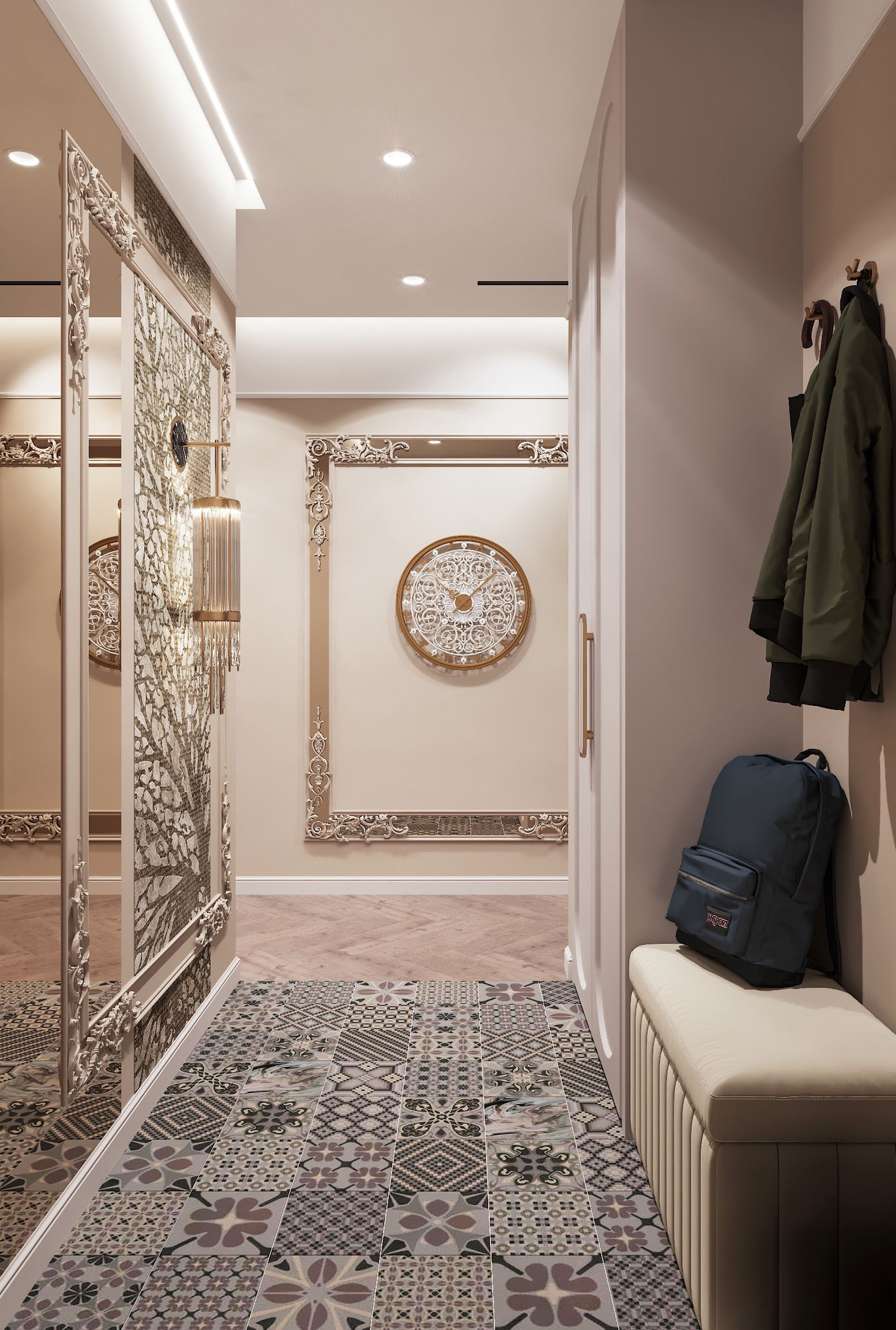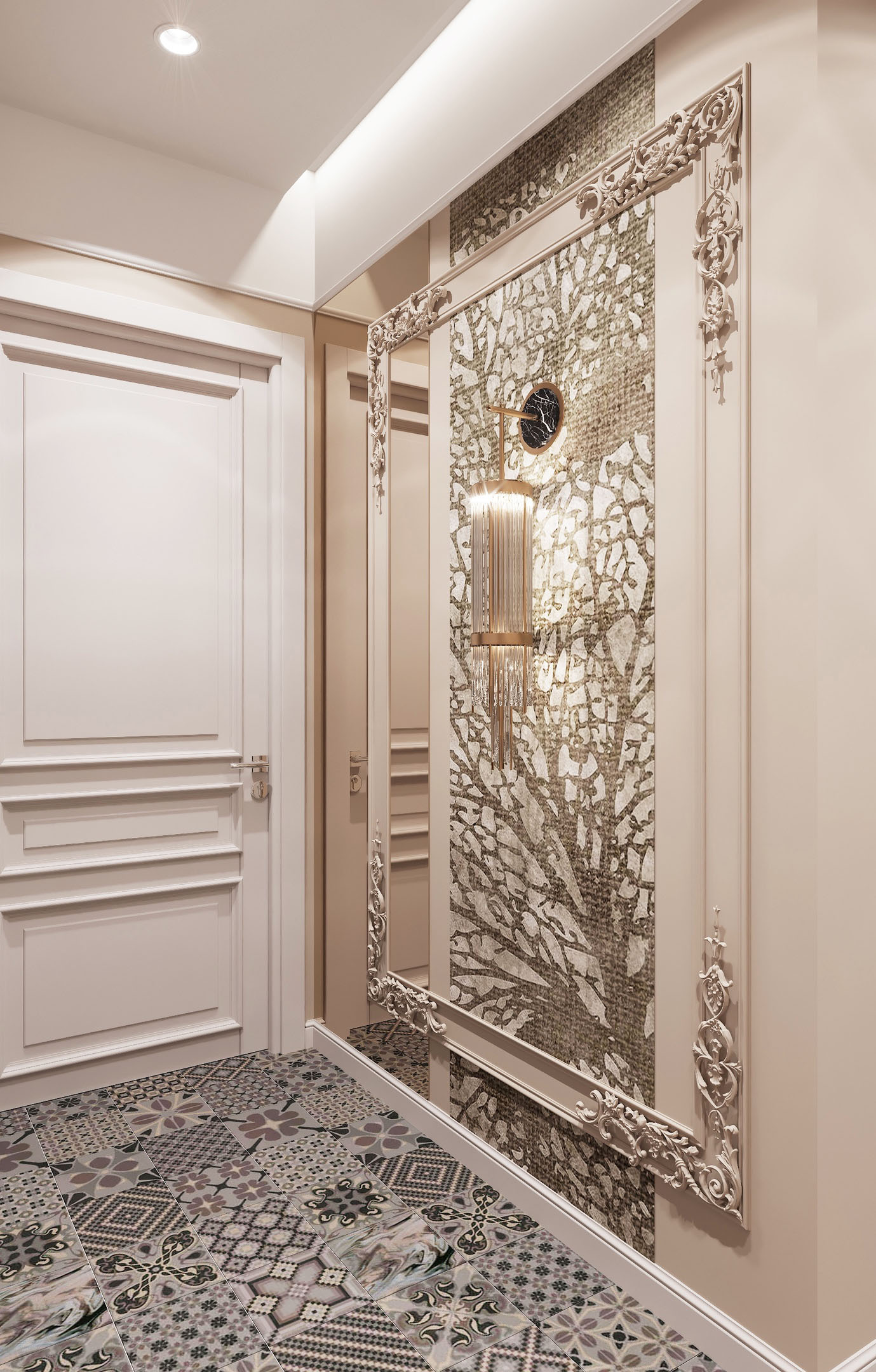Данный проект выполнен в стиле Неоклассика, и разработан он для холостяка. Классические элементы — лепнина на потолке и на стенах, светильники, бра — представлены в облегченном усовершенствованном виде. Присутствует умеренность декоров, но в то же время прослеживается роскошь каждого элемента.