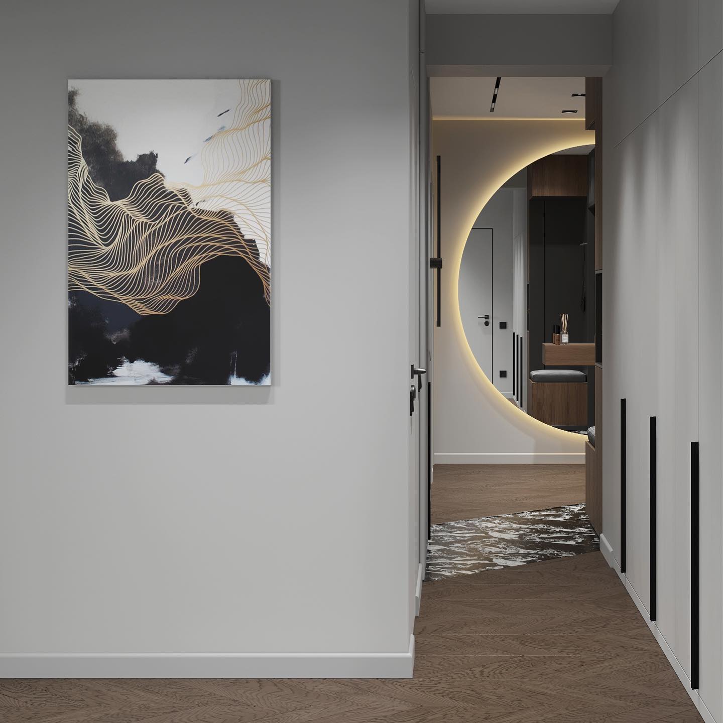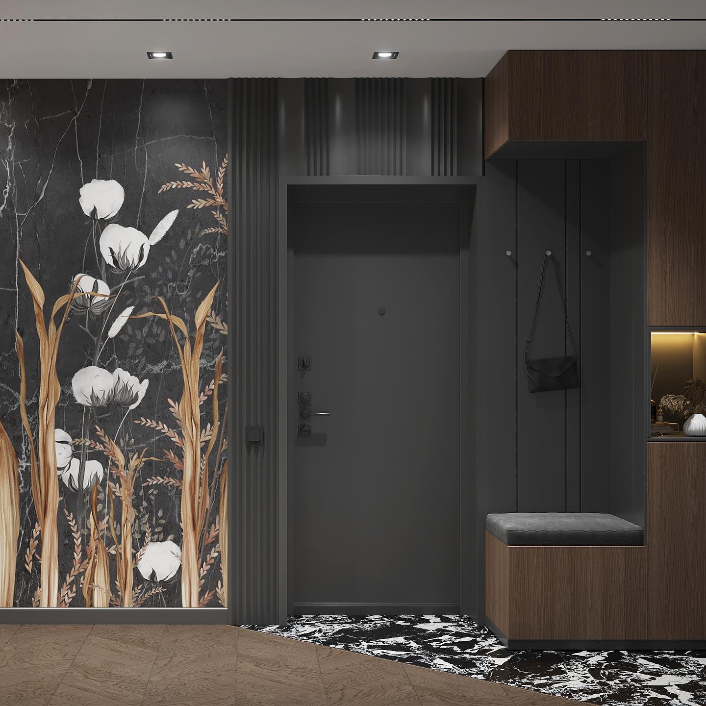 Автор этого проекта влюблен черный, акценты и контрасты, и заказчики нашли это потрясающим. Обои из коллекции HERBARIUM поддержали эту концепцию. Засушенные растения будто сохранили в себе момент жизни цветка, а мы запечатлели этот момент и перенесли на обои. «Herbarium» — это стилизация стены без излишков, создание легкой и индивидуальной нотки в интерьере.