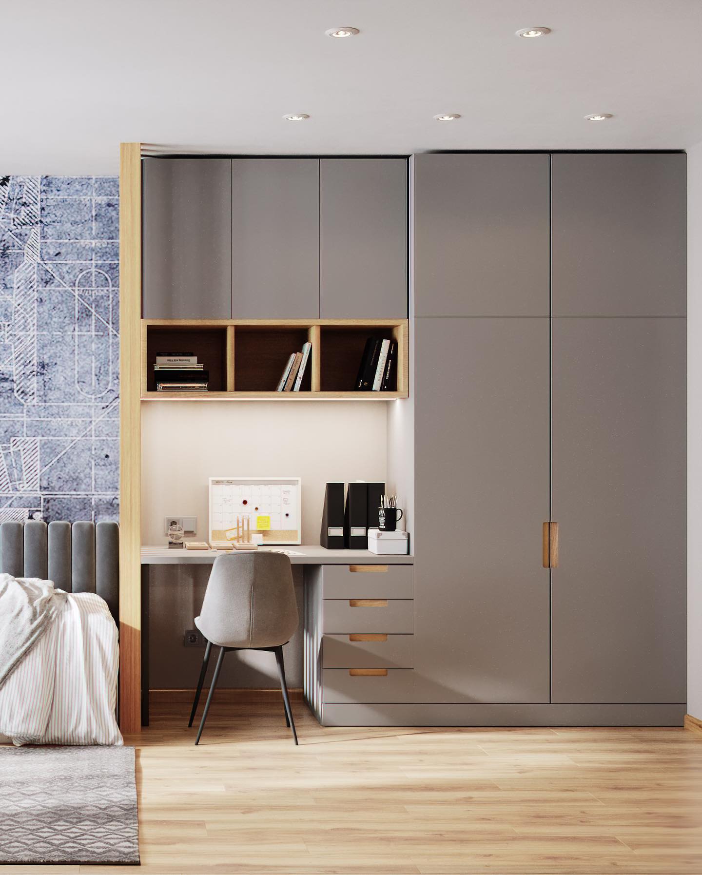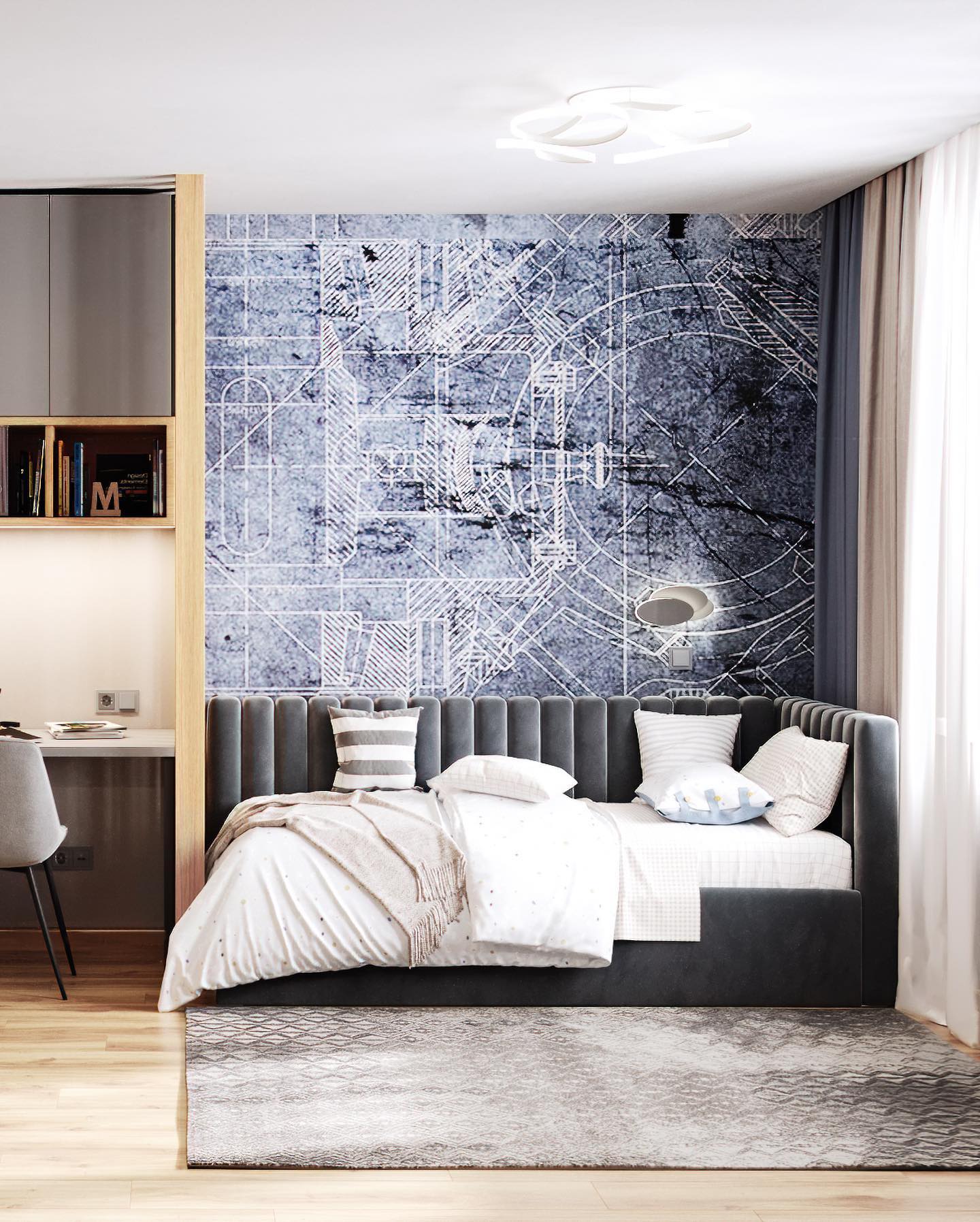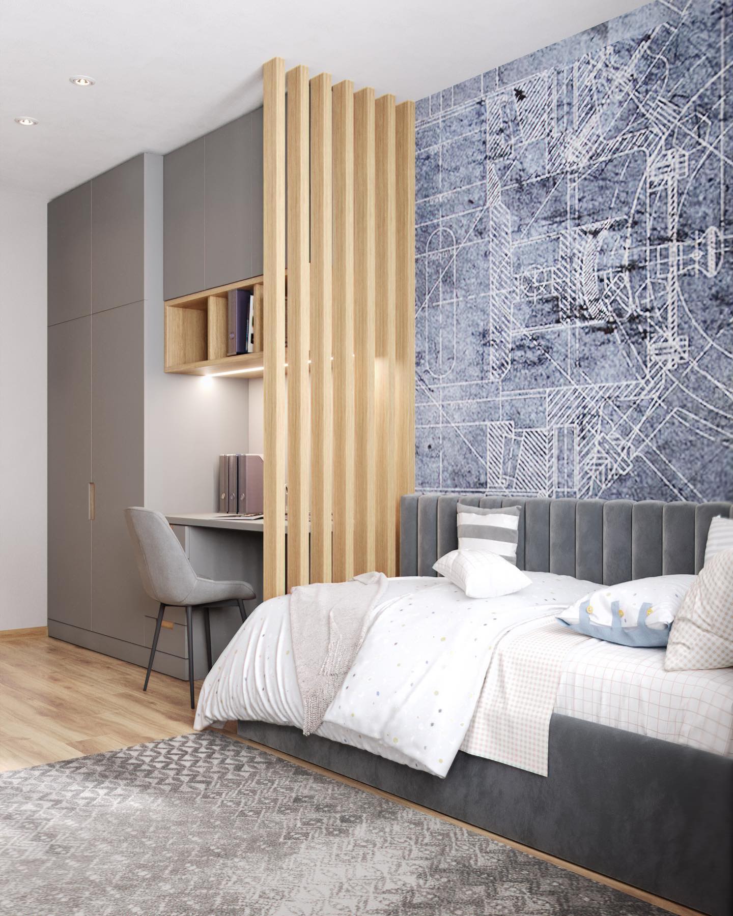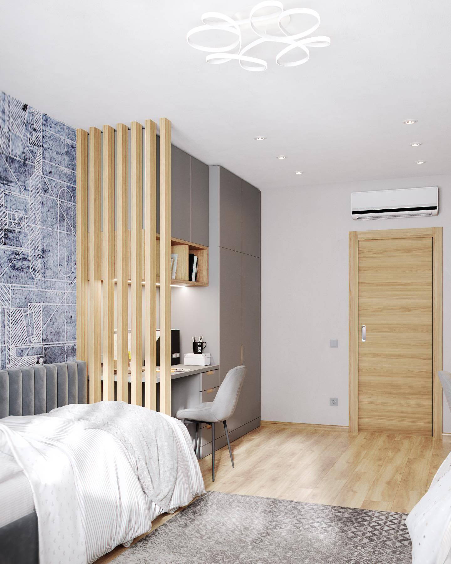 Дизайн детской комнаты для двух мальчиков с разницей в возрасте всего год. Поскольку соперничество у погодок выражено особенно ярко, заказчики переживали, что дети не смогут договориться, кто где будет спать, или поделить место в общем шкафу. Поэтому было принято решение сделать комнату симметричной, разделив абсолютно все зоны поровну.