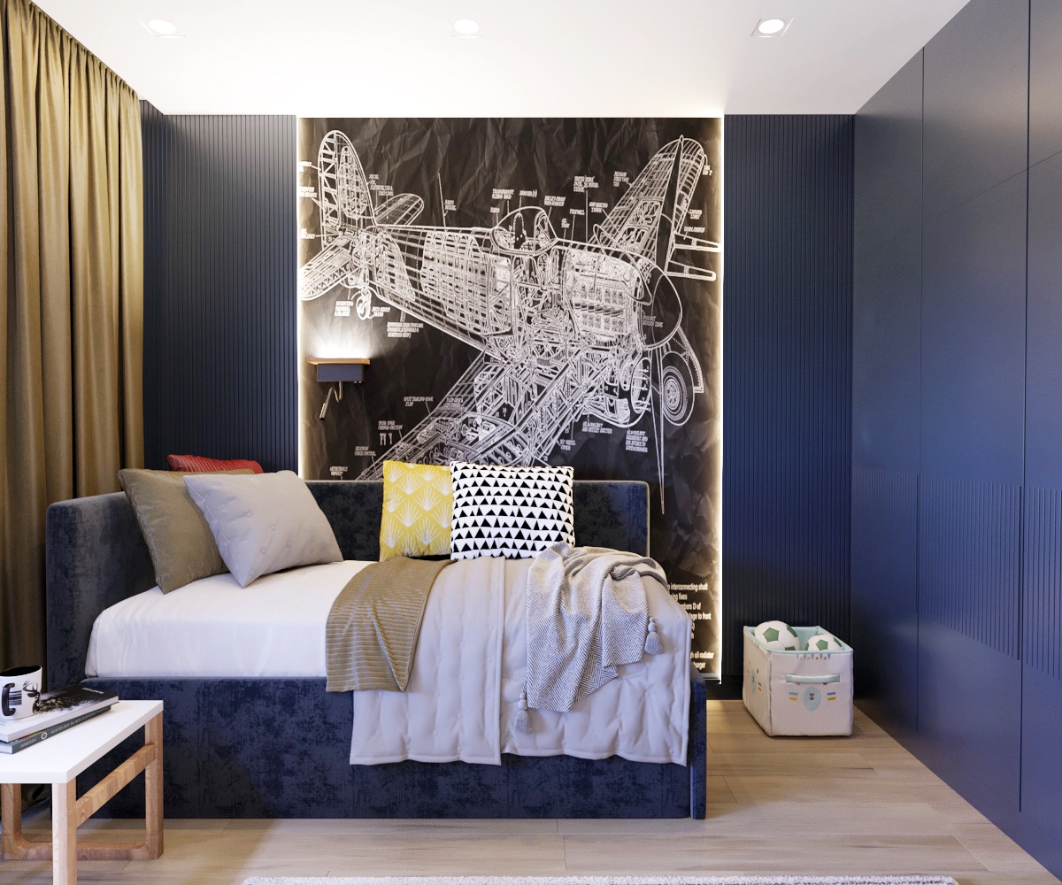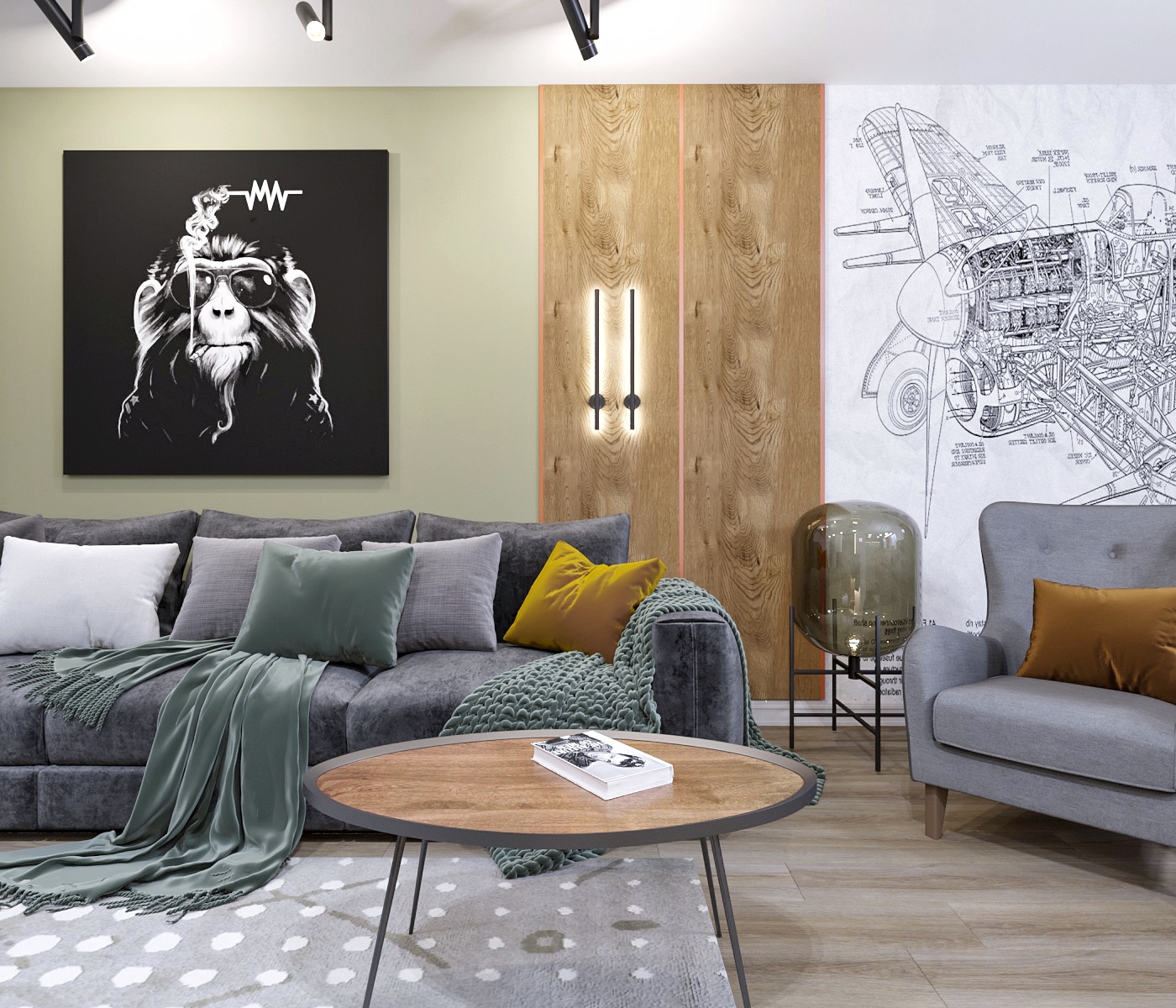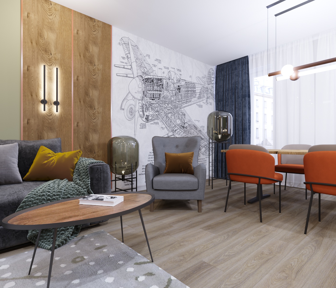 Квартира для молодого холостяка из Челябинска. Обои из коллекции INDUCTION. Коллекция создана для тех, кто не представляет своей жизни без науки и открытий. В ней собраны замысловатые чертежи, которые станут прекрасным дополнением комнаты в стиле смелого стимпанка или лофта.