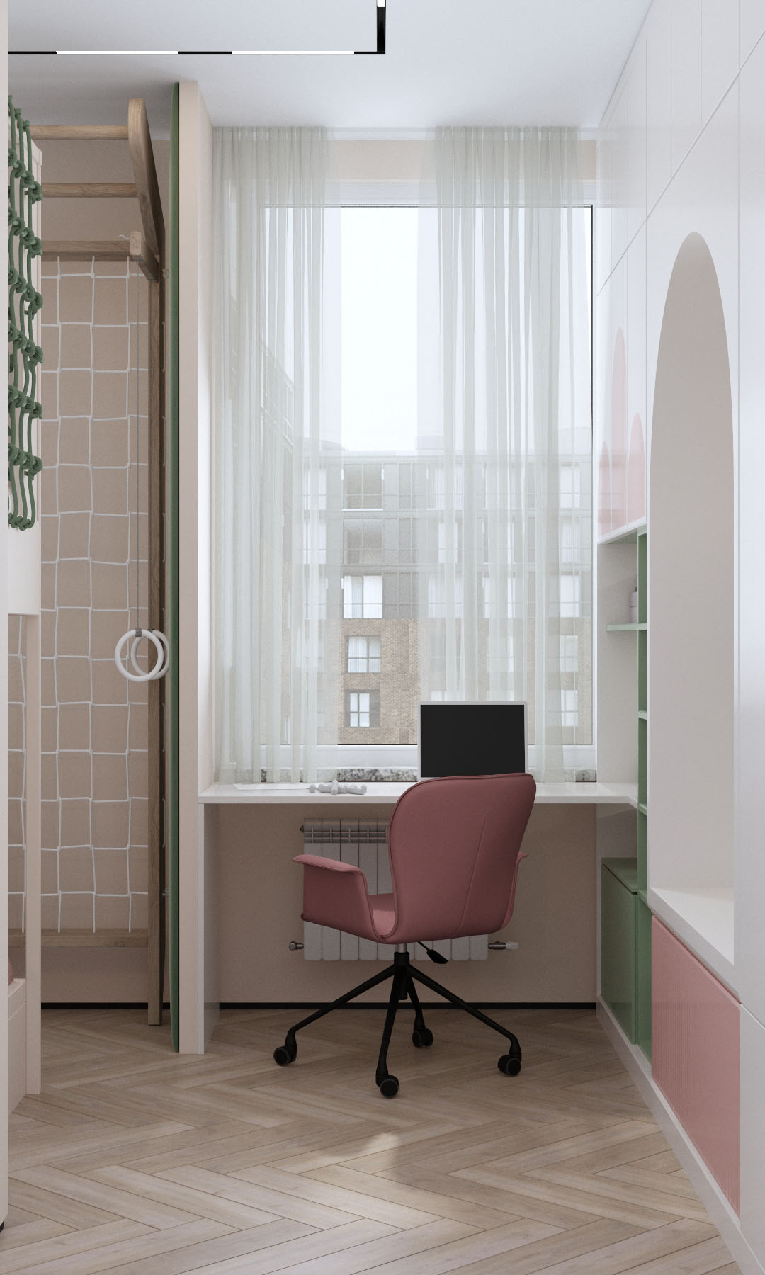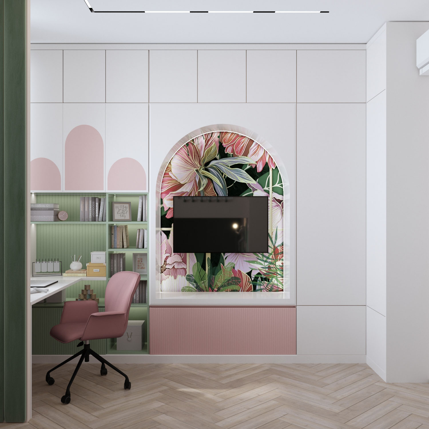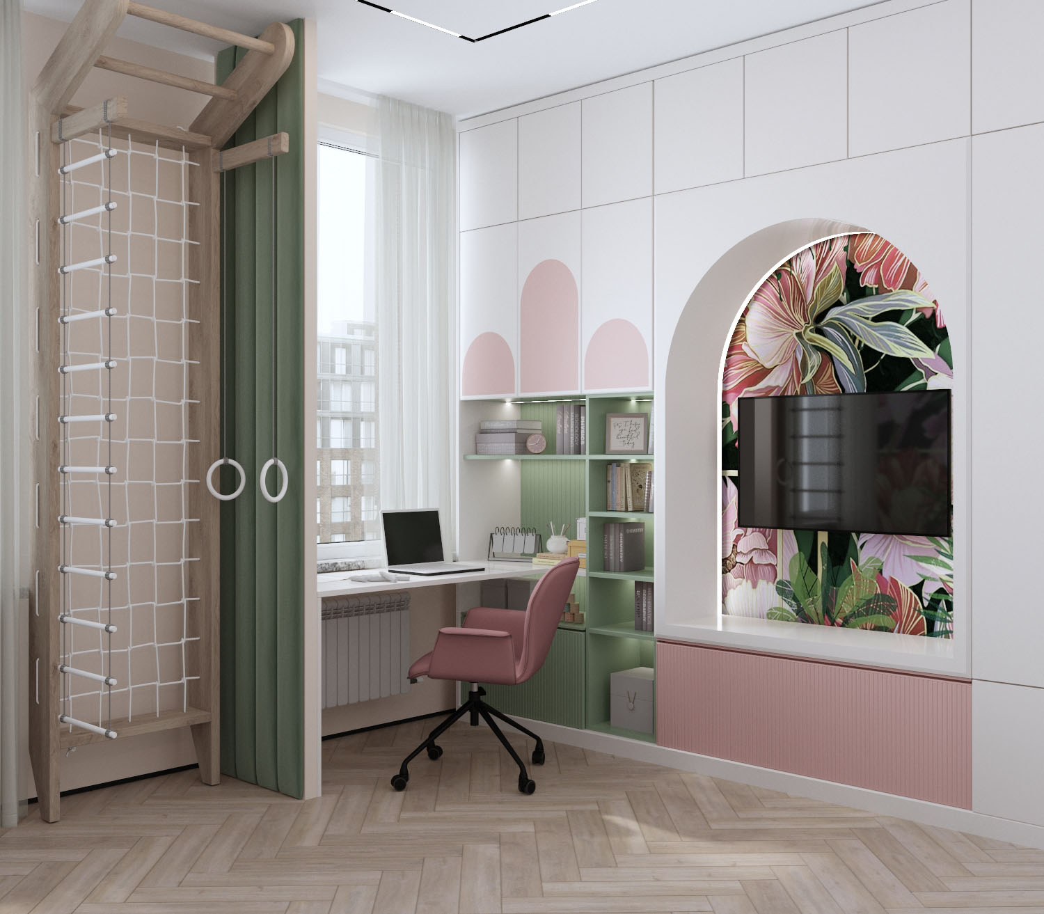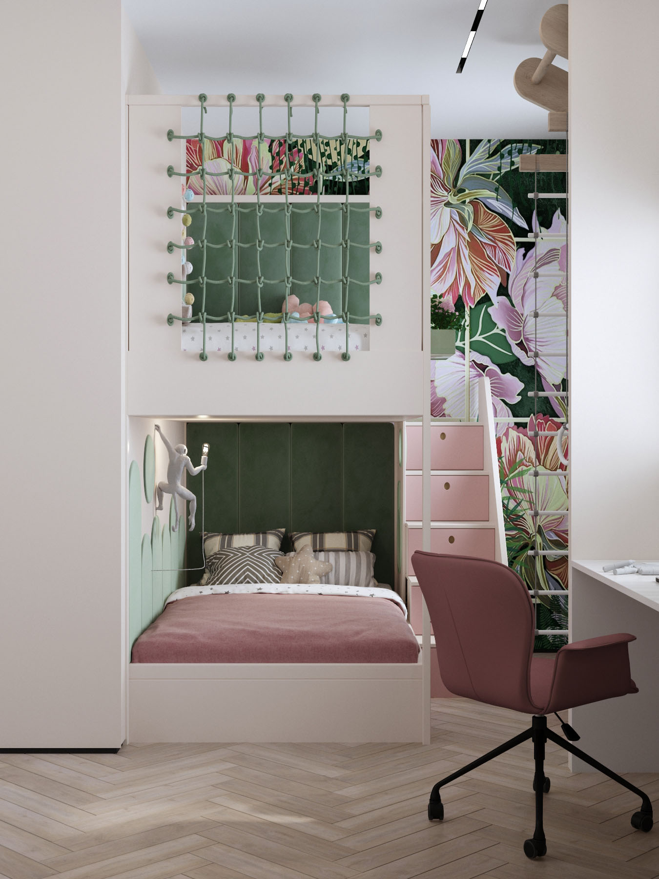 В детской площадью 12 м² обязательно должна была быть стена с цветами. Обои из коллекции Klumba подошли в интерьер идеально!