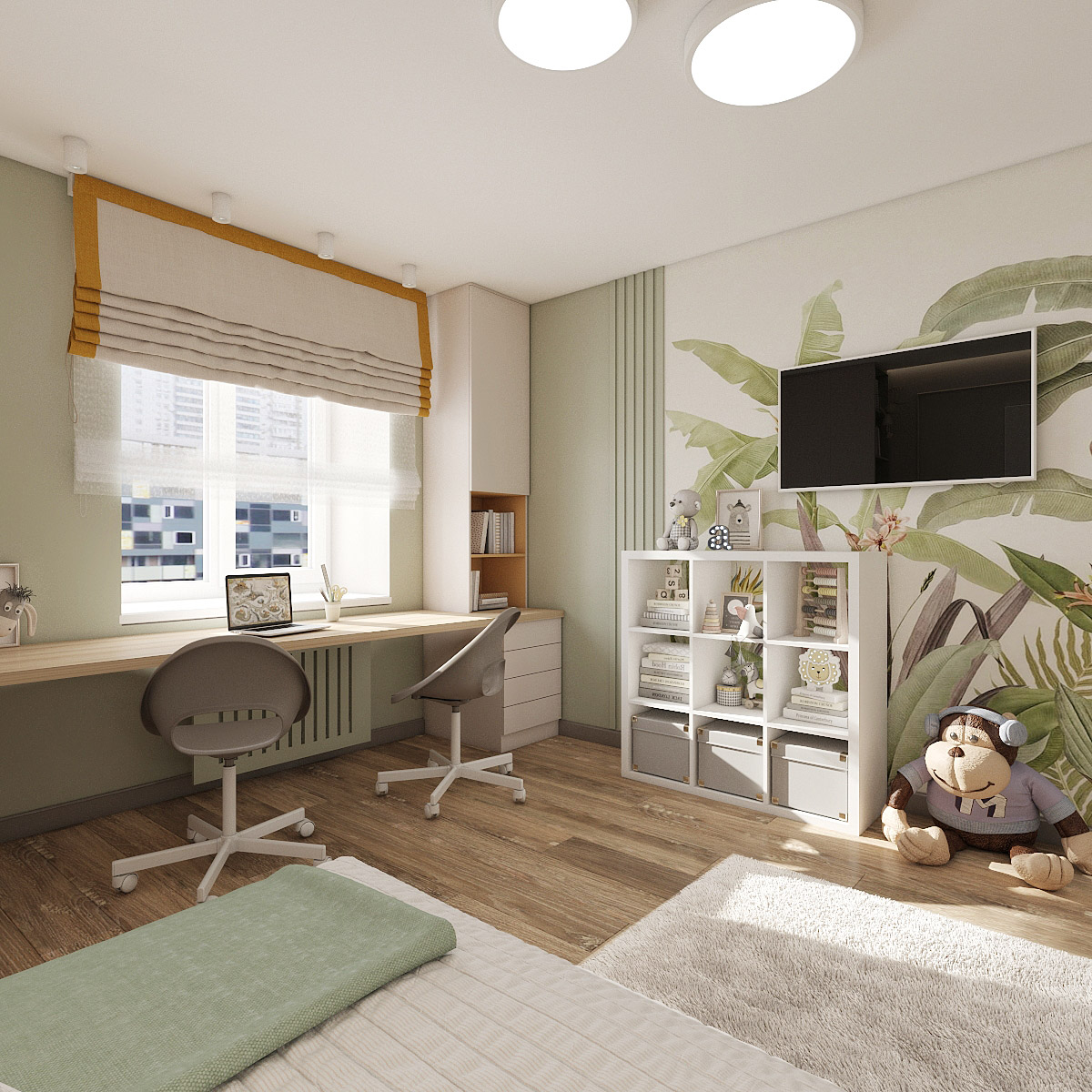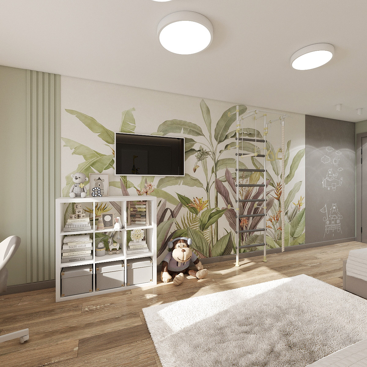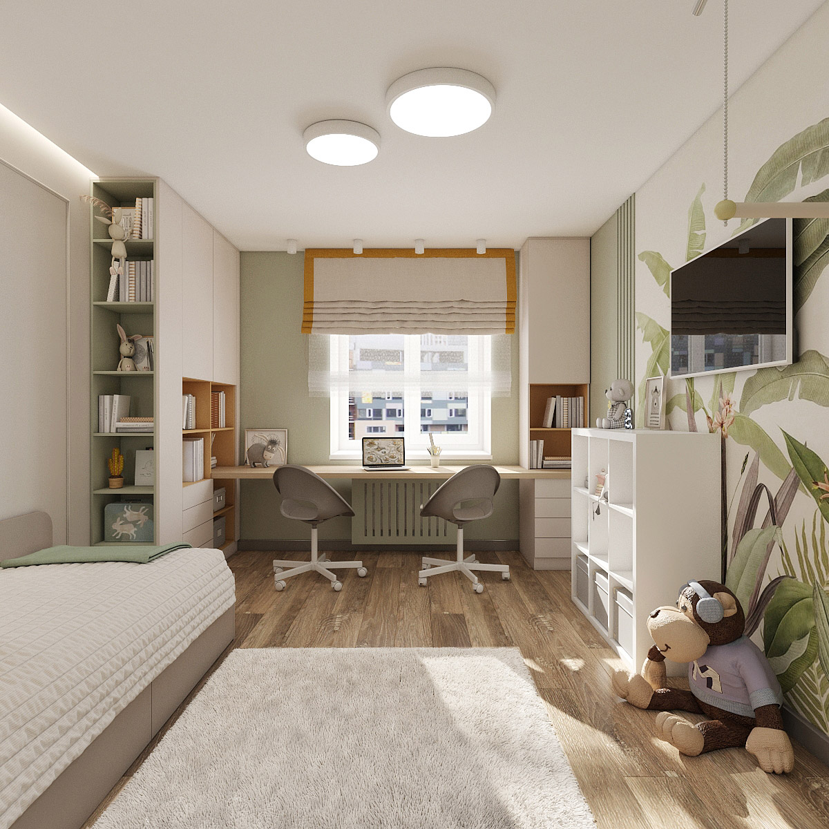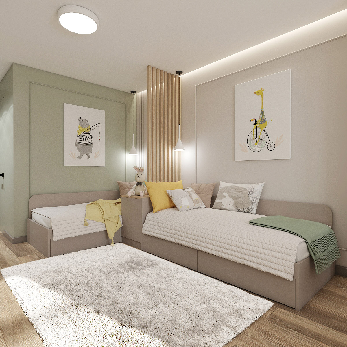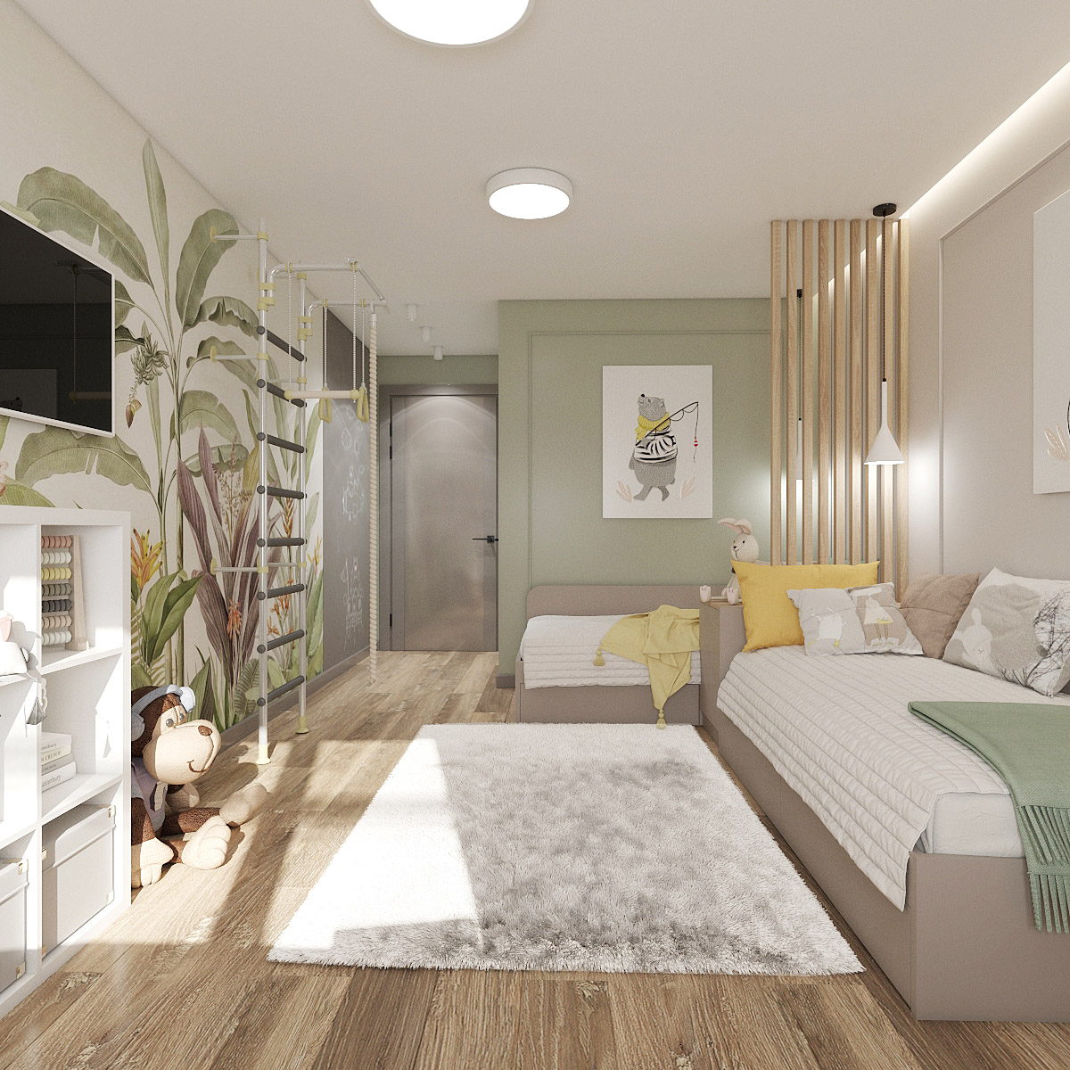 Детская комната для брата с сестрой возрастом 4 и 6 лет. Цветовое решение интерьера в пастельных тонах задала фреска из коллекции Eden-21. В качестве акцента также выделили некоторые элементы желтым и охрой. В таких цветах будет комфортно находиться и мальчику и девочке.