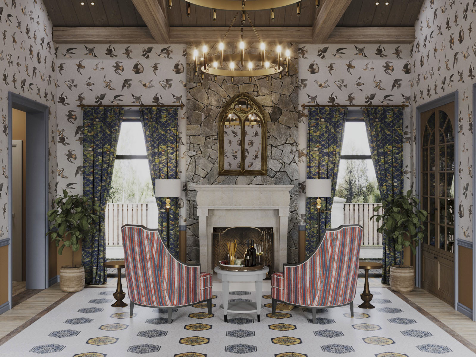 Гостиная-шкатулка с птичьими обоями по настроению отсылает к прогулке по бескрайним полям, где слышно пение птиц. Деревянные потолки, неотесанные камни, растительные детали напольного покрытия погружают в атмосферу природы и расслабленности. Можно зажечь камин и окунуться в чайный свет в комнате, где пахнет пряностями и старыми книгами. Мягкий сочный диван и цветные кресла подчеркнули общую концепцию. Особое место в сердце занимают винтажные предметы интерьера и декоры.