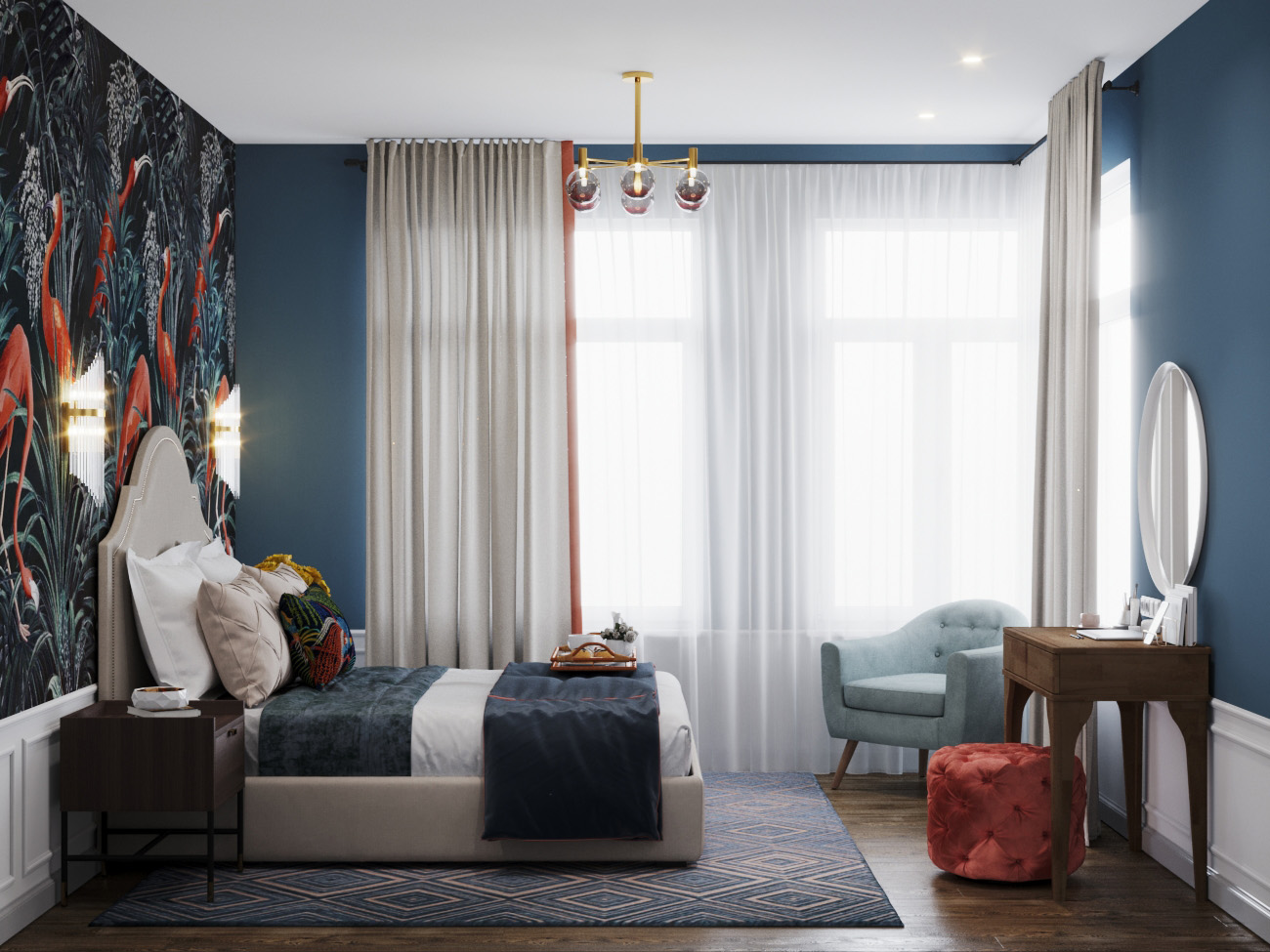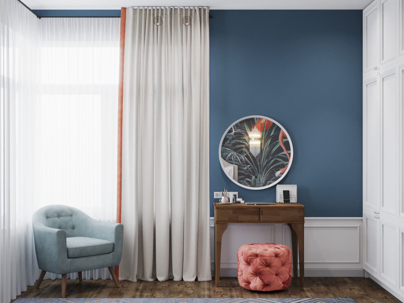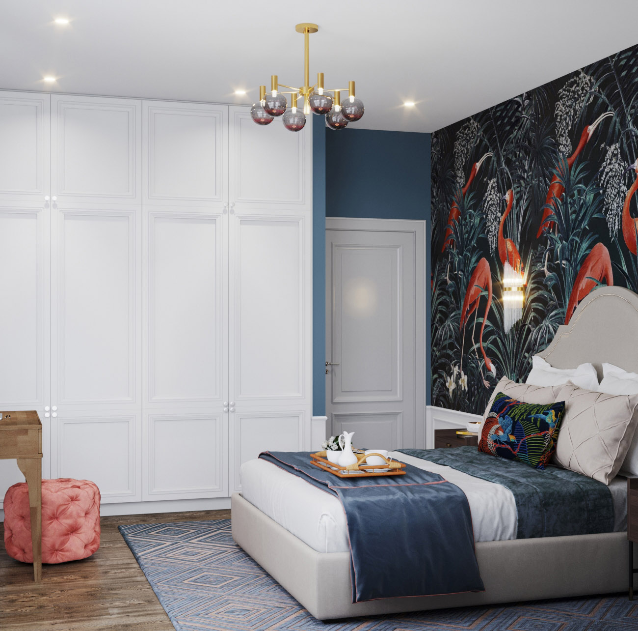 Спальня для молодой девушки. Комната площадью 15 квадратных метров. Пожелания заказчицы были сформированы довольно общие: создать нежный интерьер с яркими акцентами. Дизайнеры полностью справились с поставленной задачей. В интерьере чувствуются нежность и уют, при этом комната получилась очень насыщенной и элегантной.