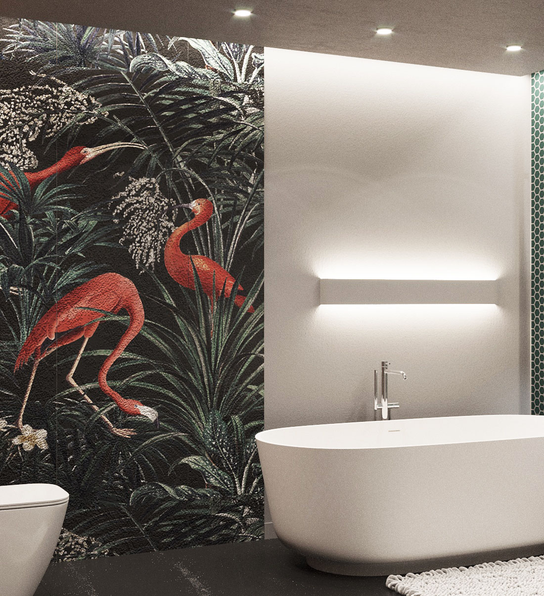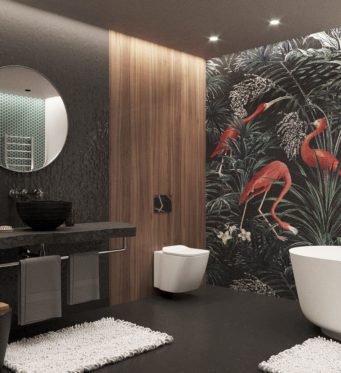 Интерьер у дизайнера начался с того, чтобы найти на складе мастерской по камню кусок, который был изготовлен самой природой. Решено было взять его и очень бережно, сохраняя форму, изготовить из этого природного камня столешницу под раковину. Именно отсюда появилась штукатурка за зеркалом, имитирующая этот камень. Потом нашелся подходящий пол, деревянные панели и рейки для разделения зоны душа. И когда встал вопрос о том, что нужно добавить цвета — выбор пал на обои Wall Street с птицами из коллекции Eden-21. Они явились связующим звеном между деревом, камнем, изумрудной мозаикой цвета листьев и общим настроением комнаты. Теперь фламинго от Wall Street будут радушно встречать хозяев в этом интерьере.