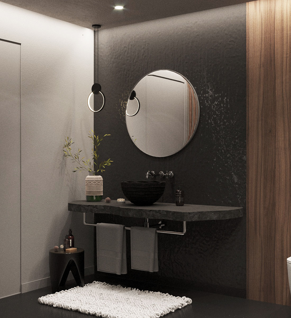 Задачи для этого помещения было поставлено две: во-первых, использовать минимум покрытий из плитки или керамогранита, совсем уйти от глянца. Во-вторых, обязательно добавить дерево для уюта.
