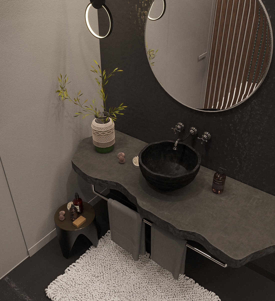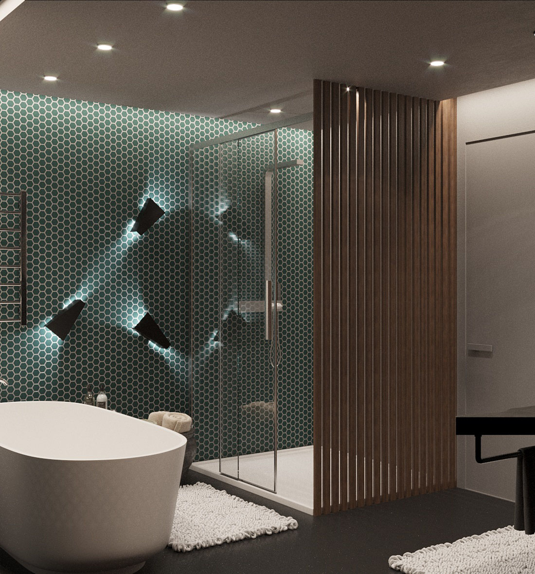Проект ванной комнаты в частном доме, г. Калининград. Заказчики — пара средних лет, которая строит уже не первый свой дом и устала от традиционных интерьеров.