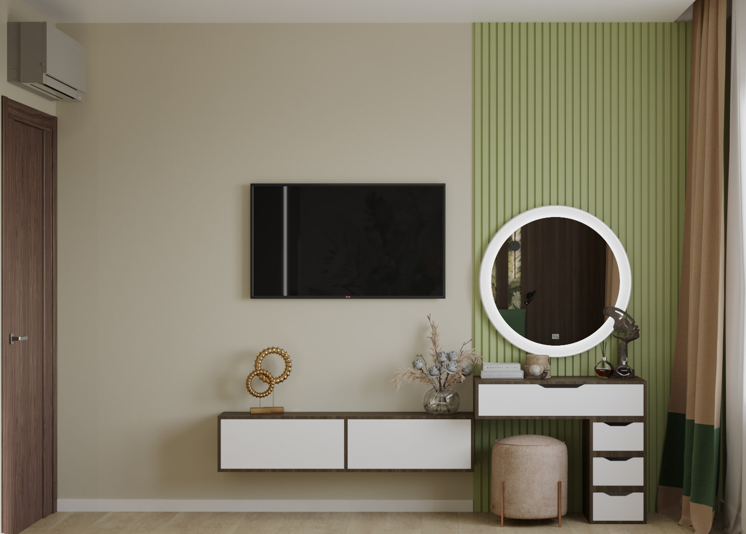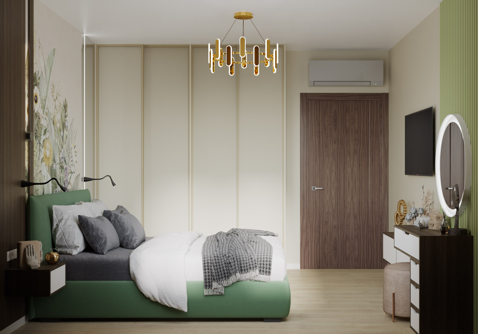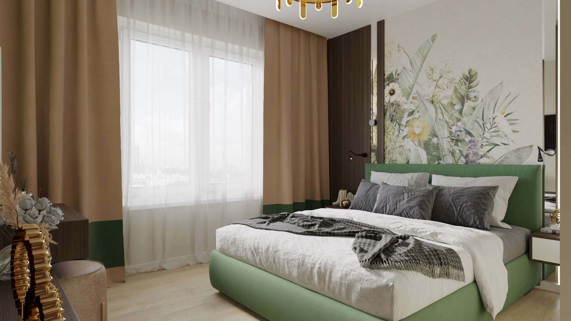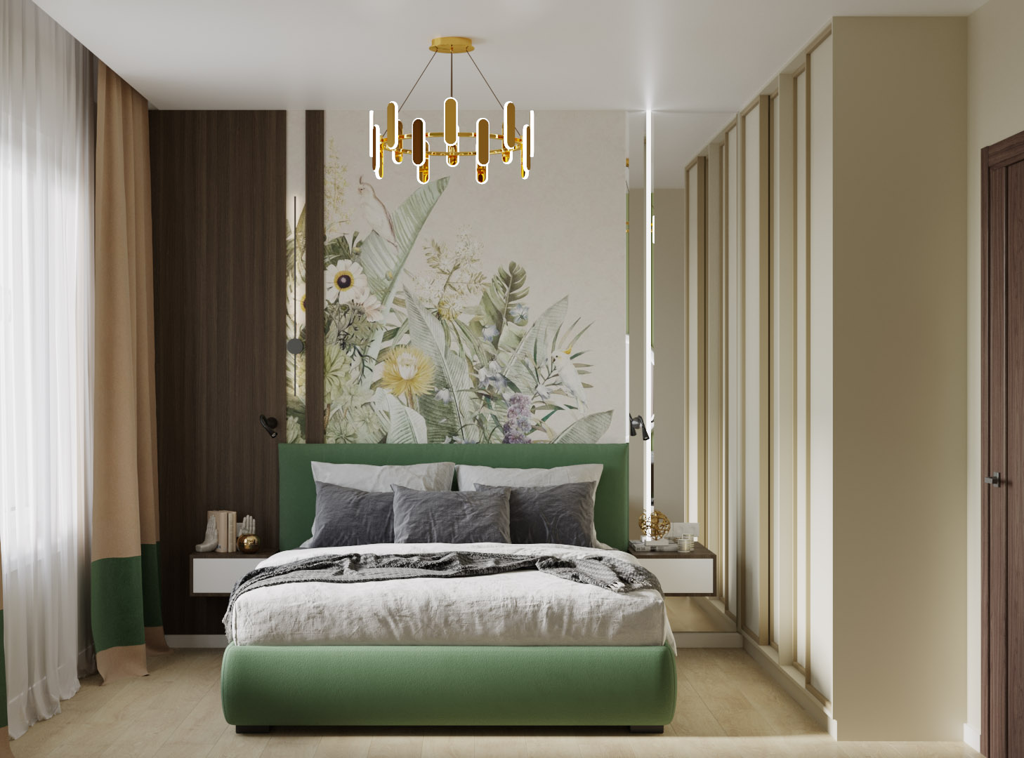 Спальня из проекта для молодой семьи в Москве. Основными пожеланиями заказчиков были: ориентация на природную составляющую при выборе материалов, ощущение спокойствия и свежести, возможность использования обоев-панно со стилизованными природными, растительными пейзажами.