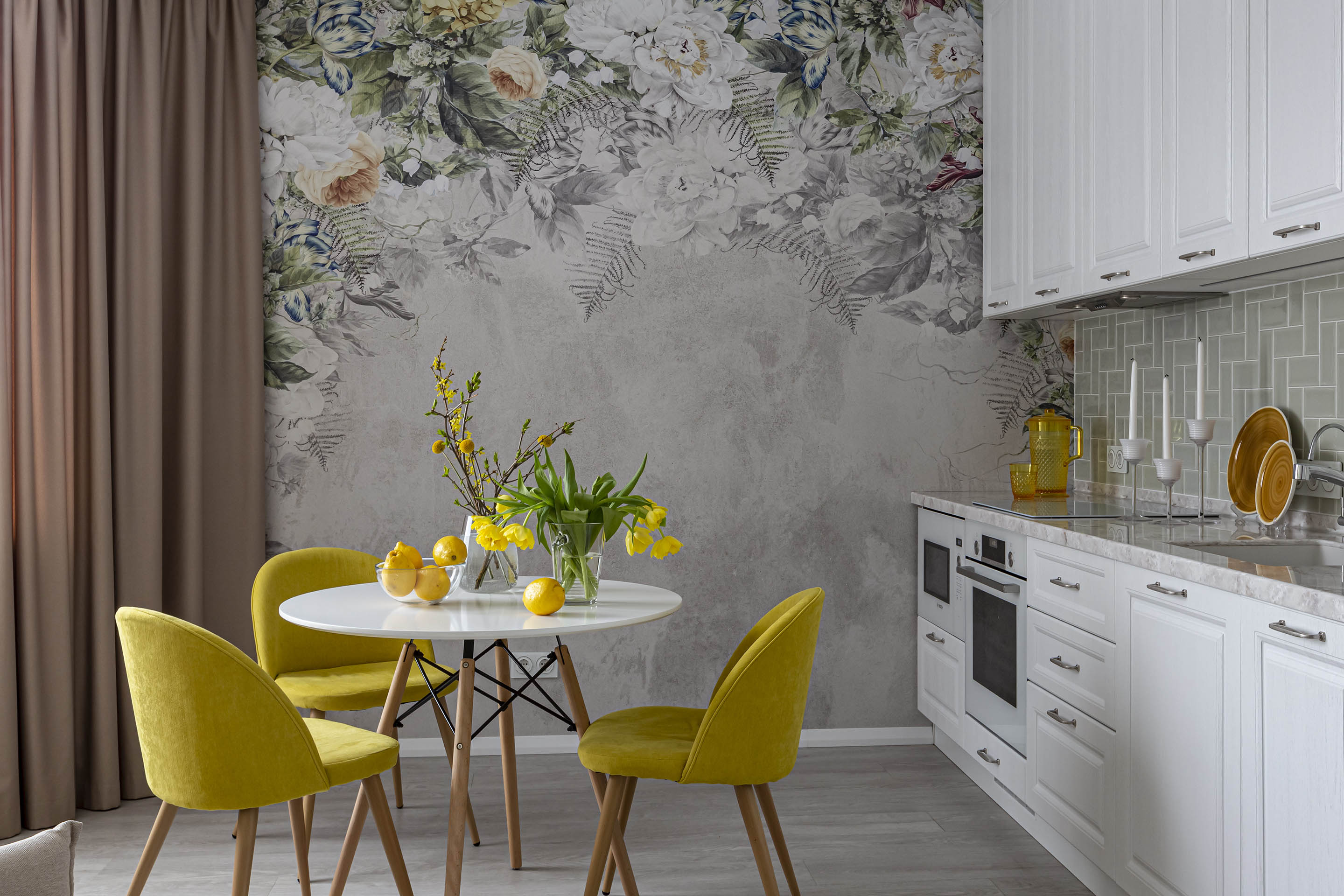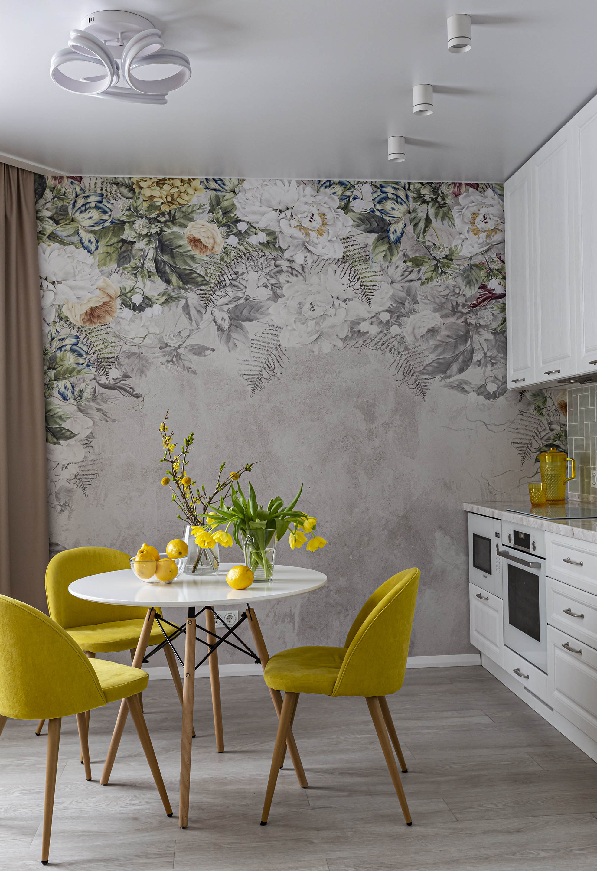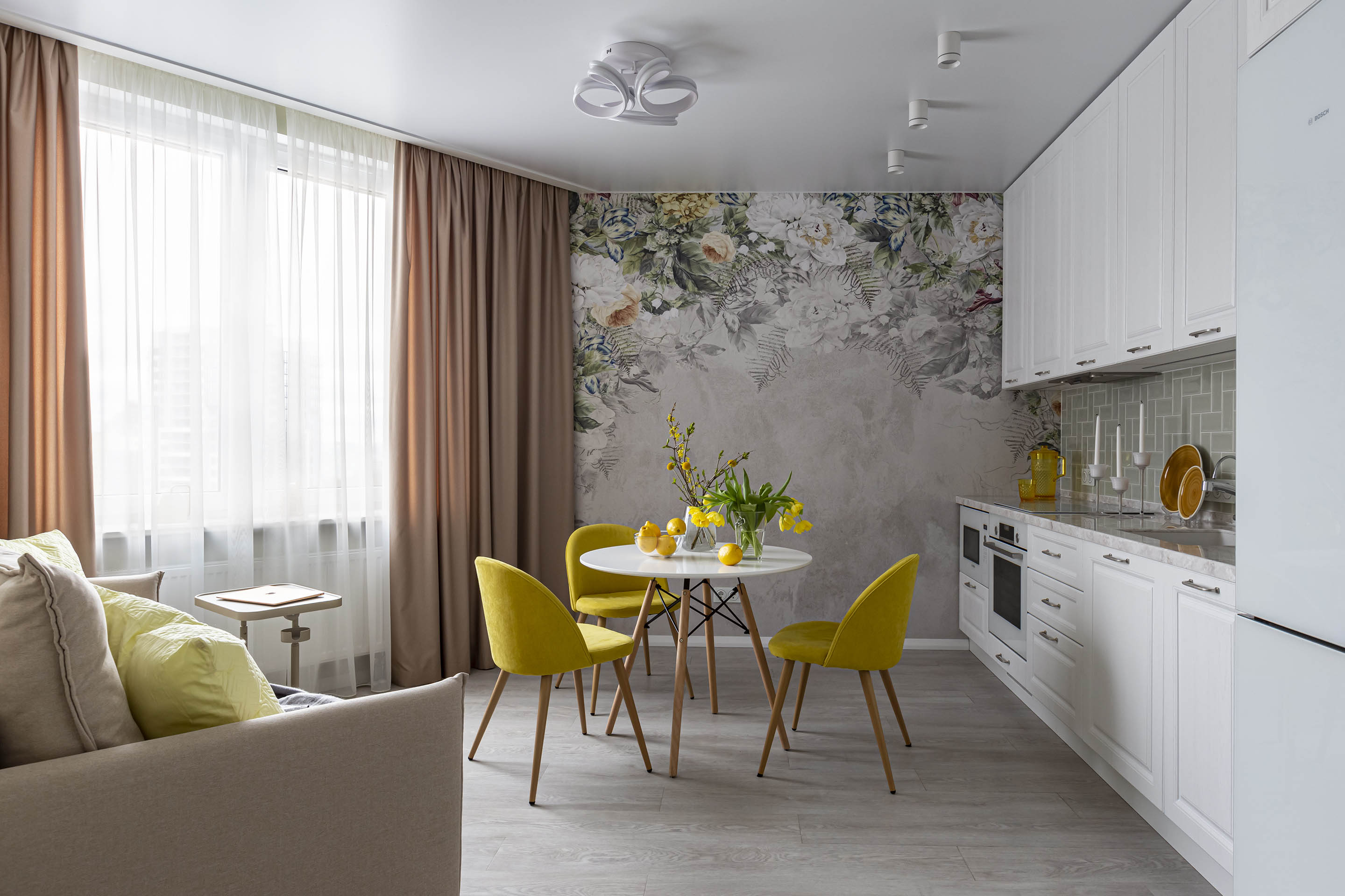 Однокомнатная квартира для молодой девушки, которая не боится ярких оттенков. Для оформления кухни выбрали обои из коллекции «La Fioritura». Главным действующим лицом коллекции стали воздушные цветочные композиции.