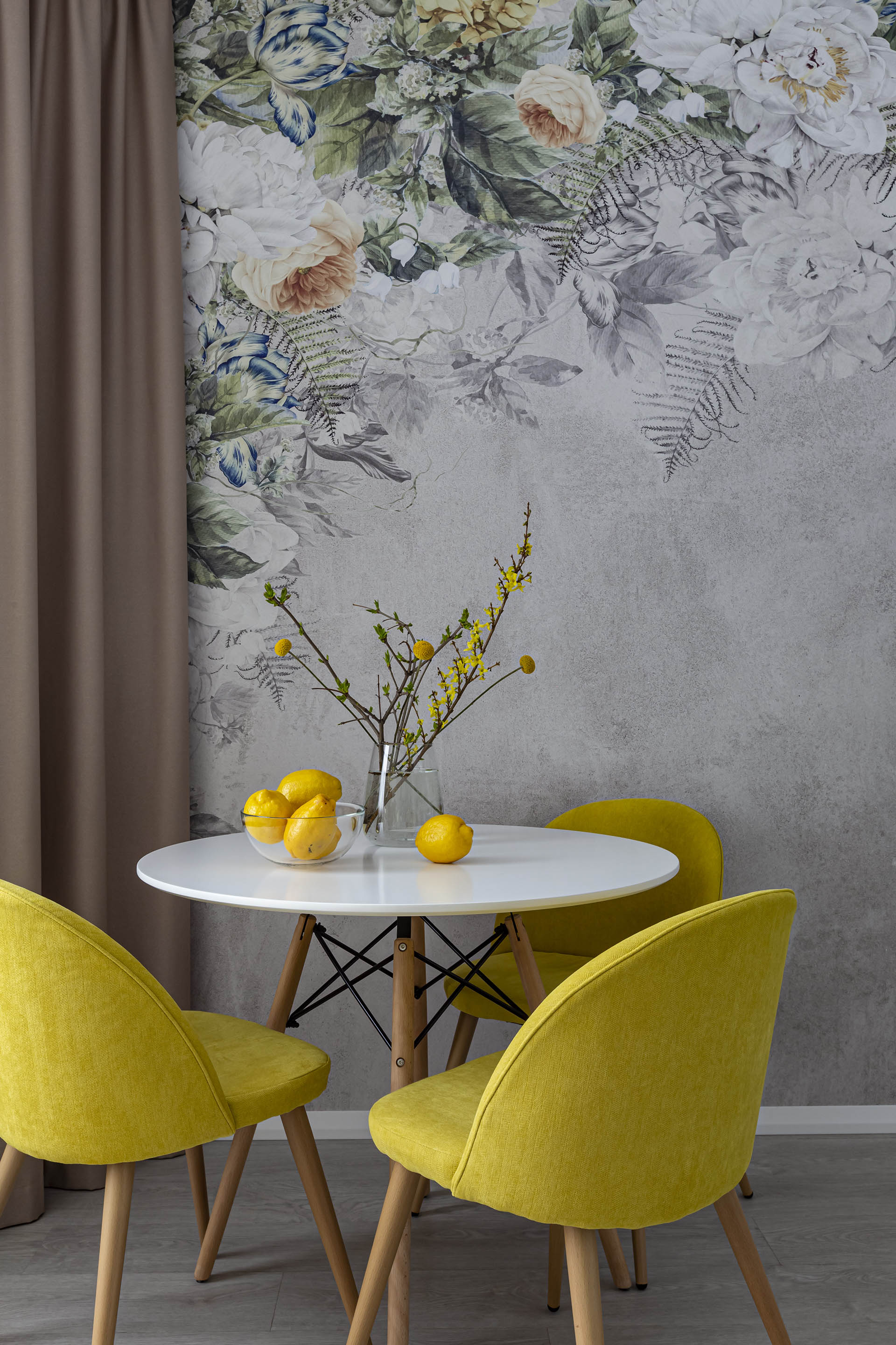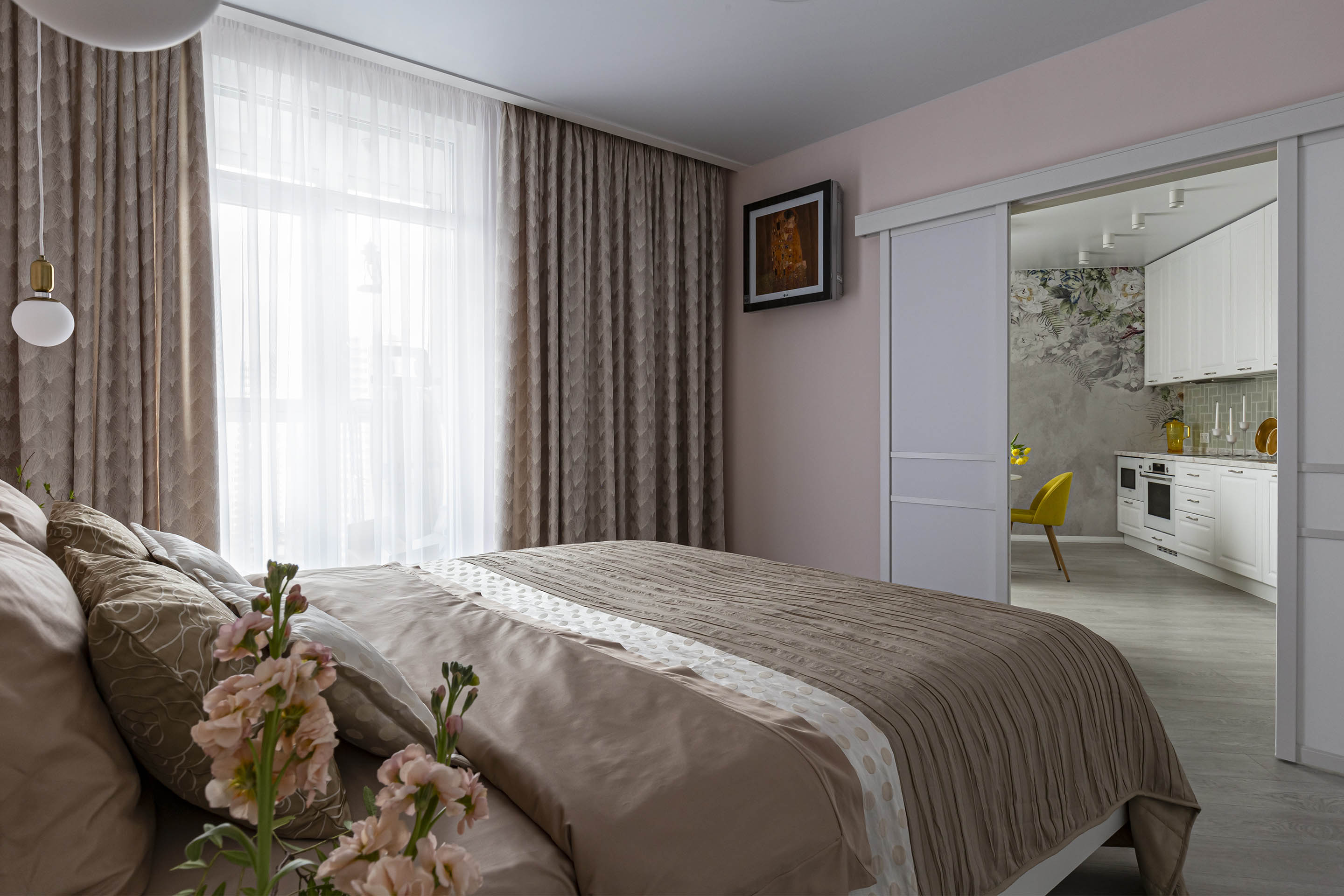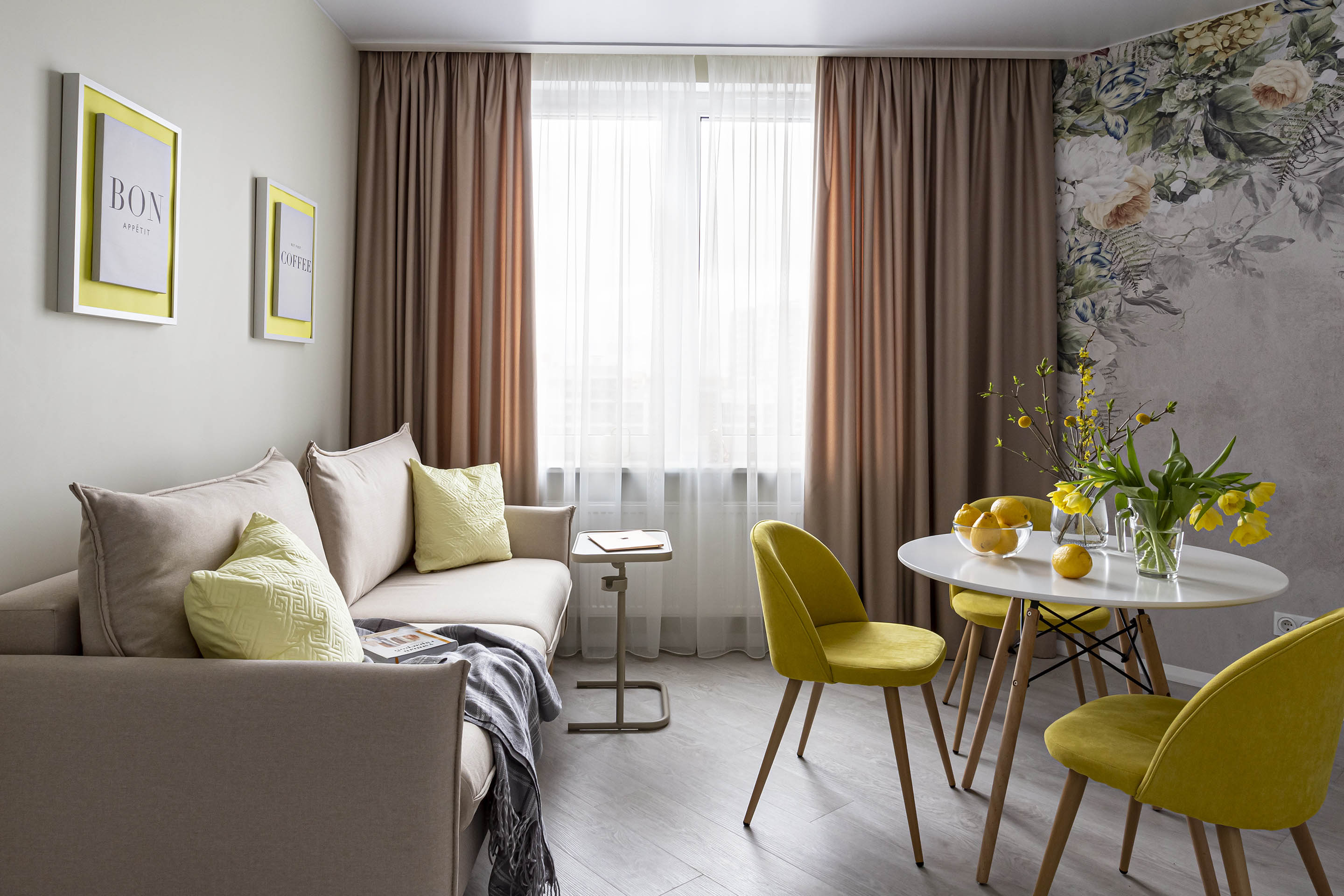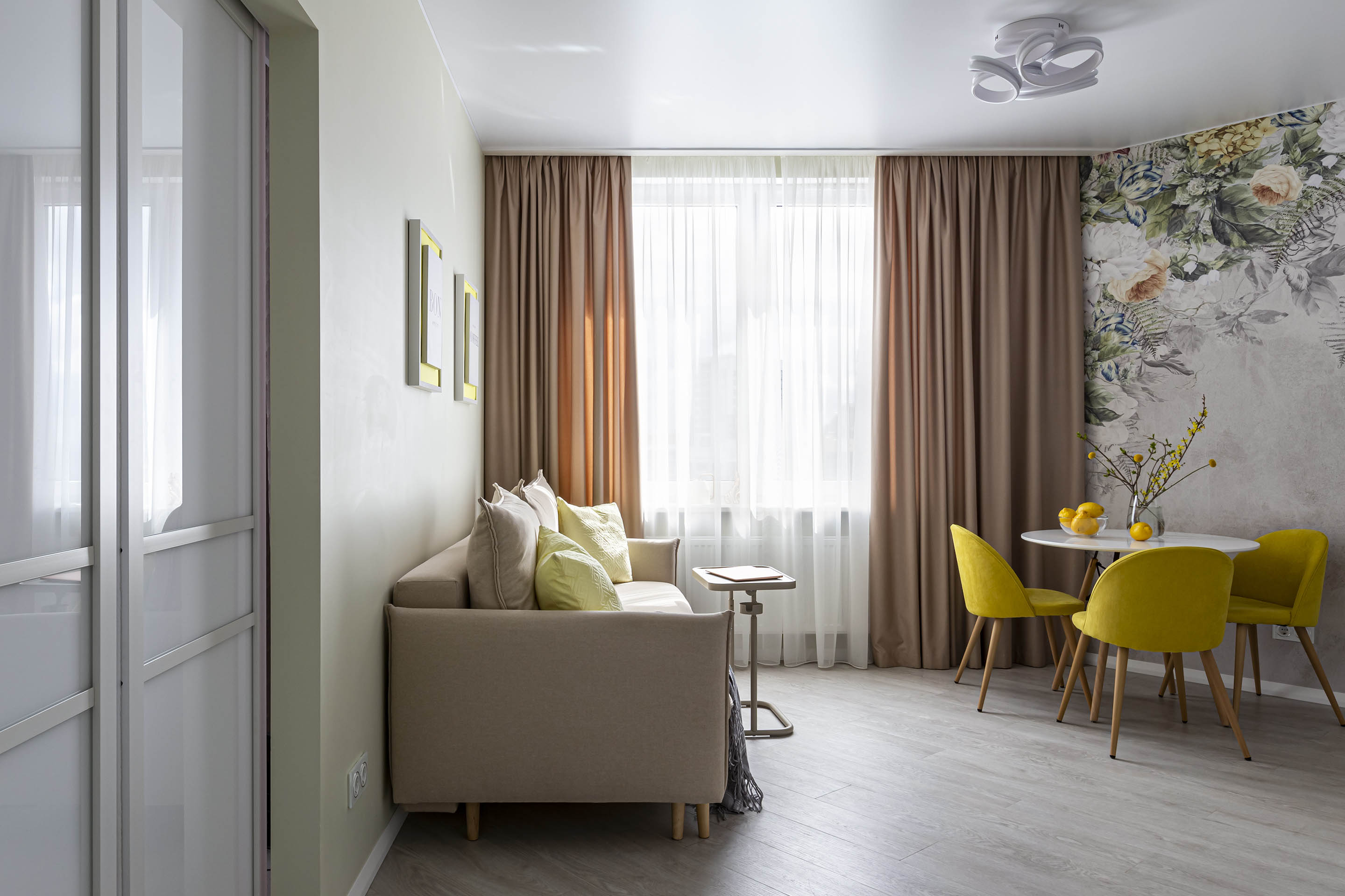Однокомнатная квартира для молодой девушки, которая не боится ярких оттенков. Для оформления кухни выбрали обои из коллекции «La Fioritura». Главным действующим лицом коллекции стали воздушные цветочные композиции.