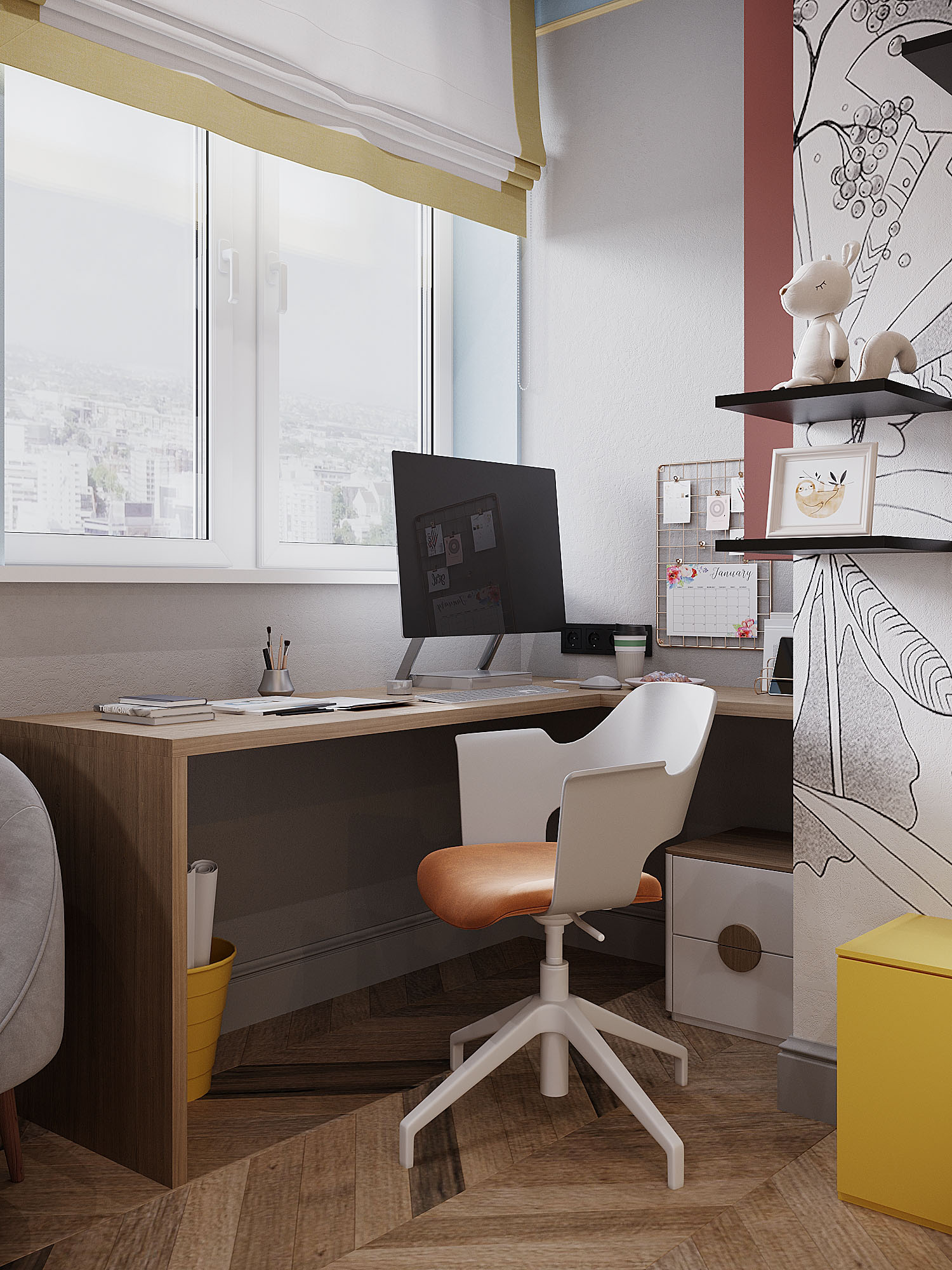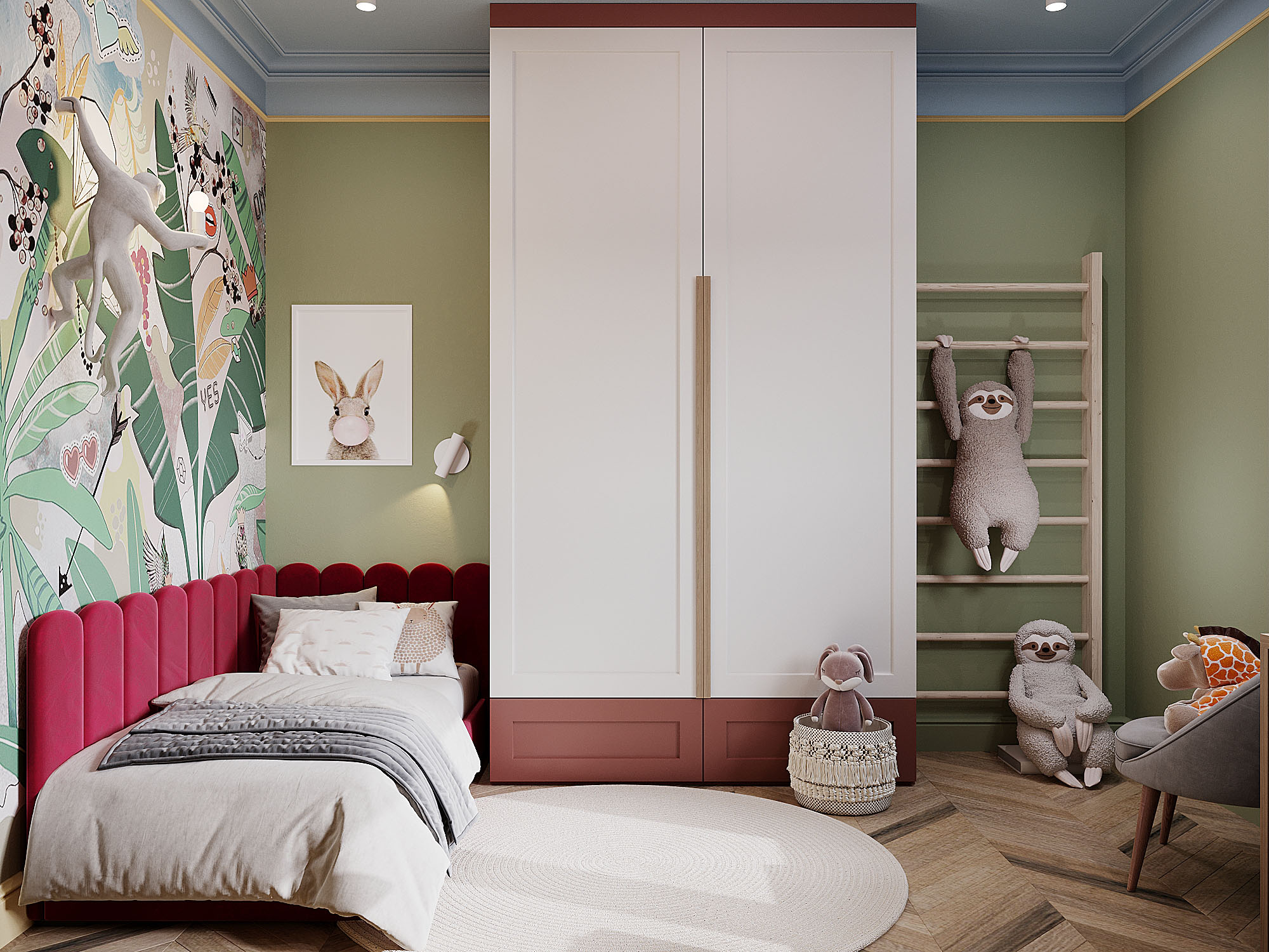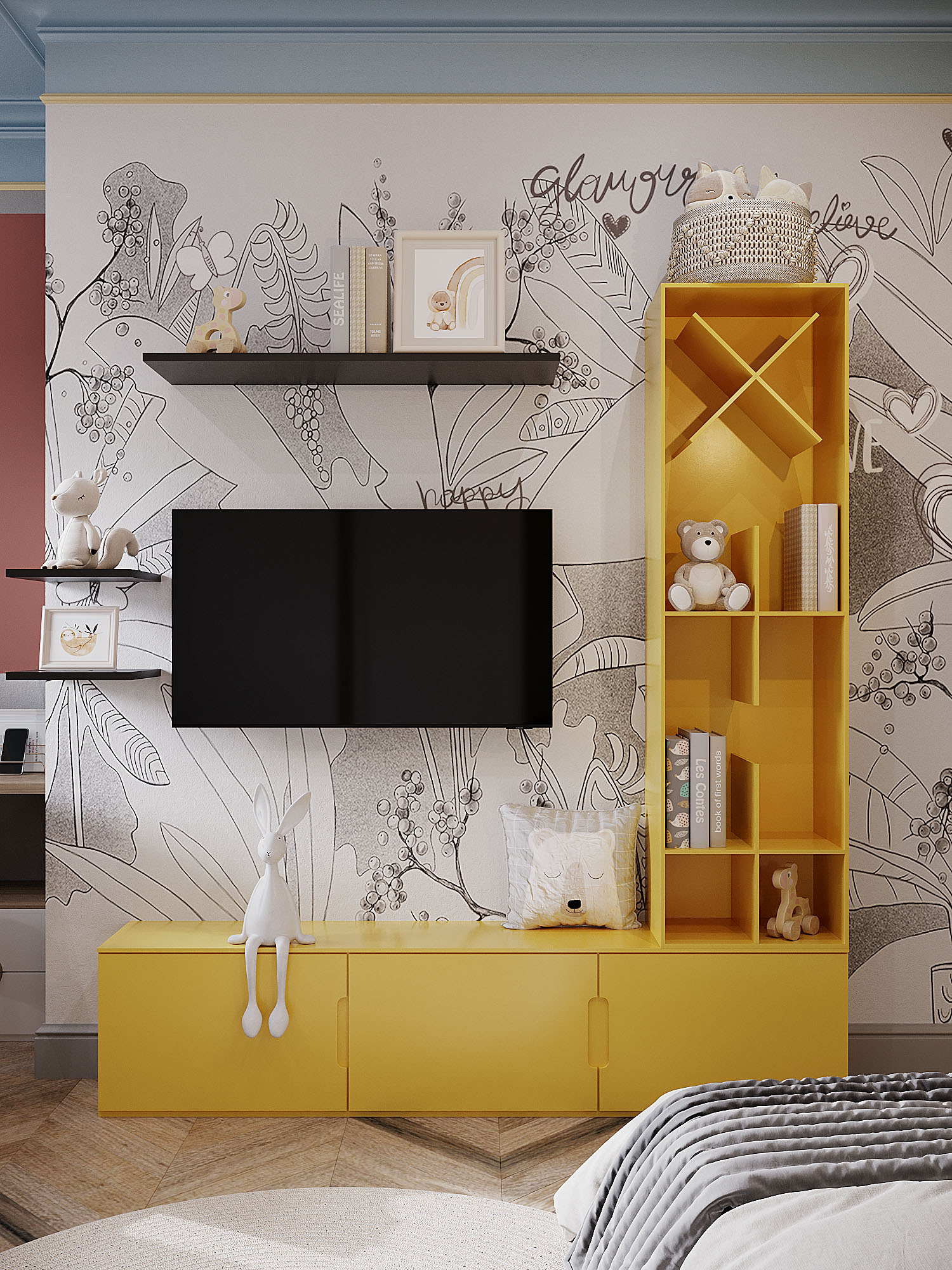 Смелый, яркий и эклектичный интерьер детской в квартире для мамы и дочки, ЖК Вестердам. Обои La-La-Land.