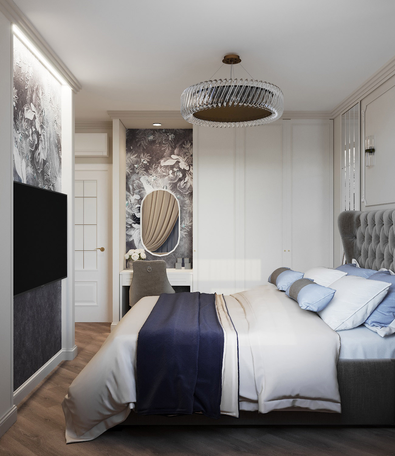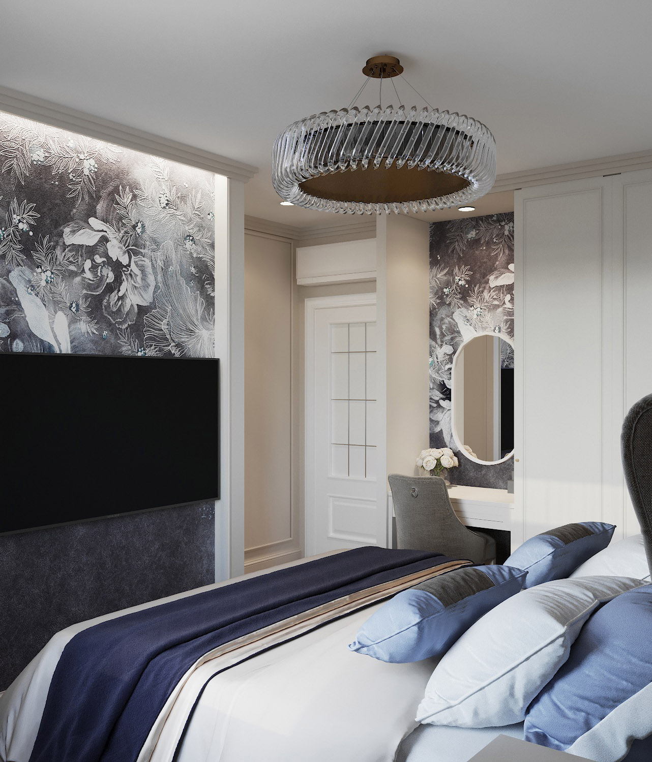 Спальня в современной классике для пары в возрасте, г. Калуга. Площадь комнаты — 15,3 м². Обои из коллекции «La Prima». Цветы лотоса поистине удивительны. Вырастая из болотной тины, они при этом являются идеалом совершенства и изящества. С ними связаны тысячи легенд и мифов, вы всегда найдёте их на изображениях Богинь в Азии и Индии. Покорённые простотой и безупречностью водяной лилии, мы создали для вас эту изящную утонченную коллекцию. La Prima — символ совершенства у вас дома!