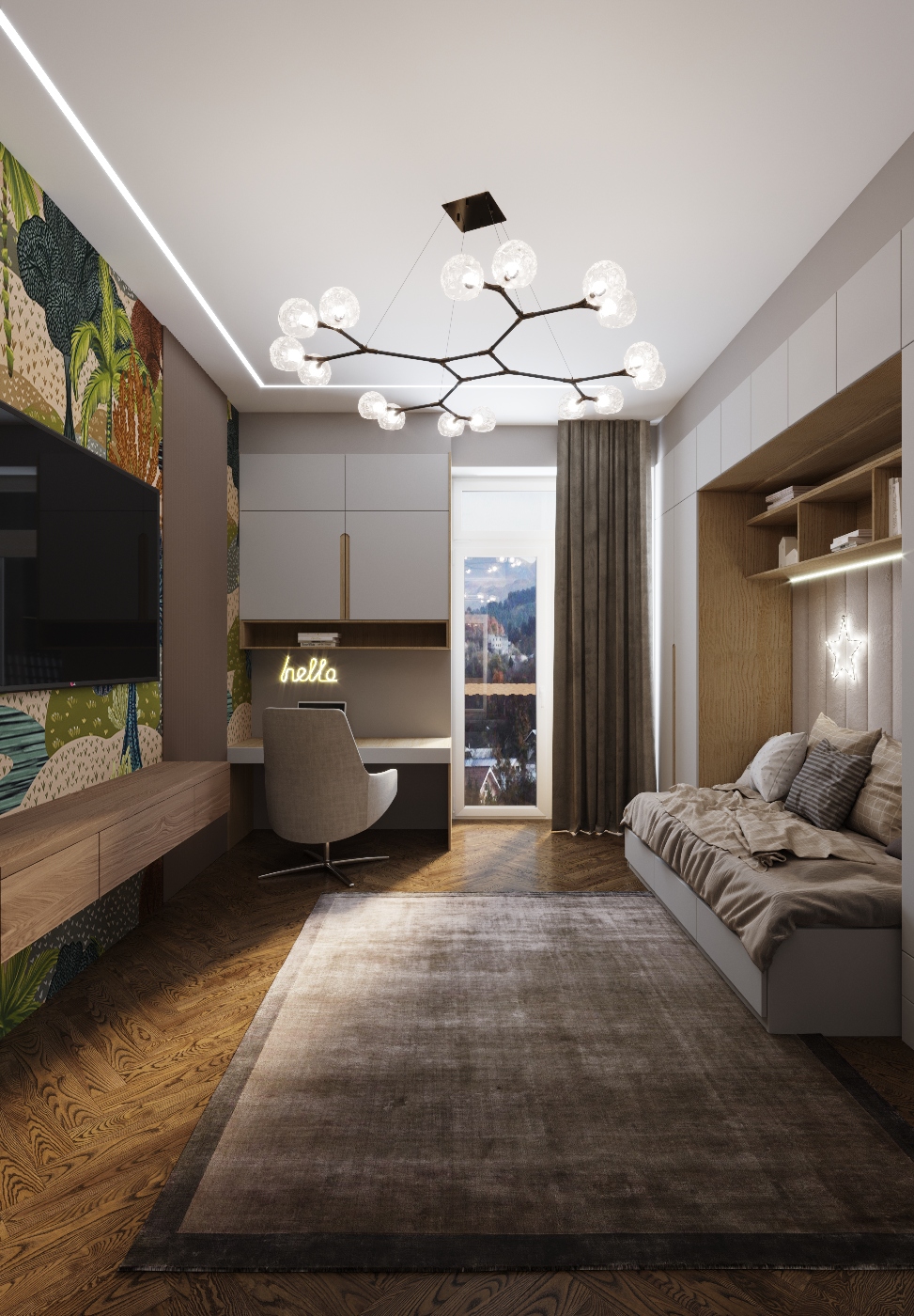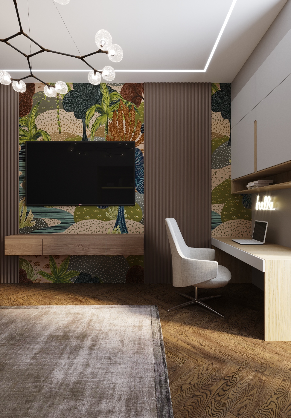 Дизайн детской комнаты, где акцентом стали обои из коллекции «Limpopo». Та самая Лимпопо, на которой жили зверята-пациенты доктора Айболита. Сказочные джунгли с приглушенными тонами для детской, в которой будет расти отзывчивый, мечтательный и добрый малыш.