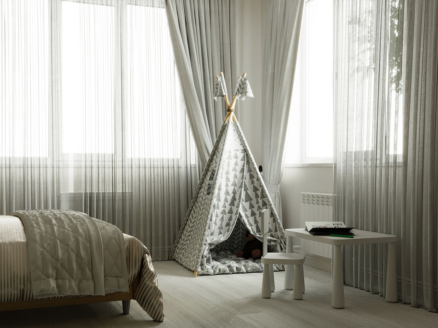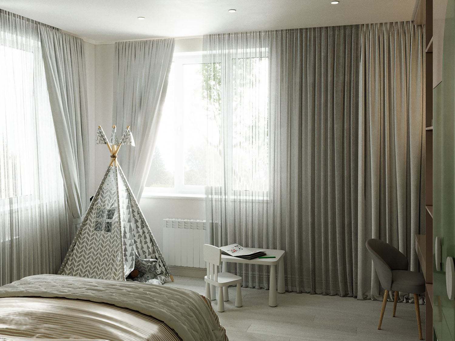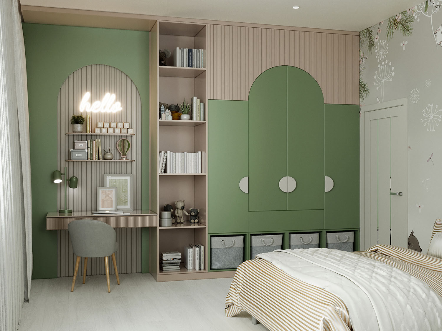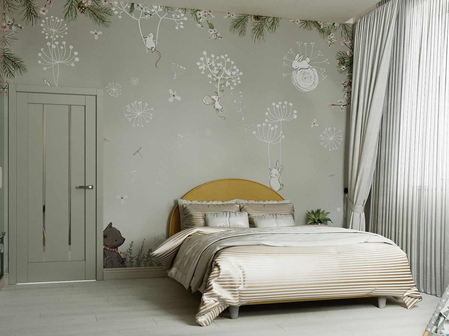 Детская спальня для будущего ребёнка. Сложность возникала в том, что ребёнок только планируется и пол пока неизвестен. Нужно было создать гендерно-нейтральную комнату. Получилась отличная детская с большой системой хранения, рабочим местом и местом для игр. Обои идеально подходят как мальчику так и девочке.