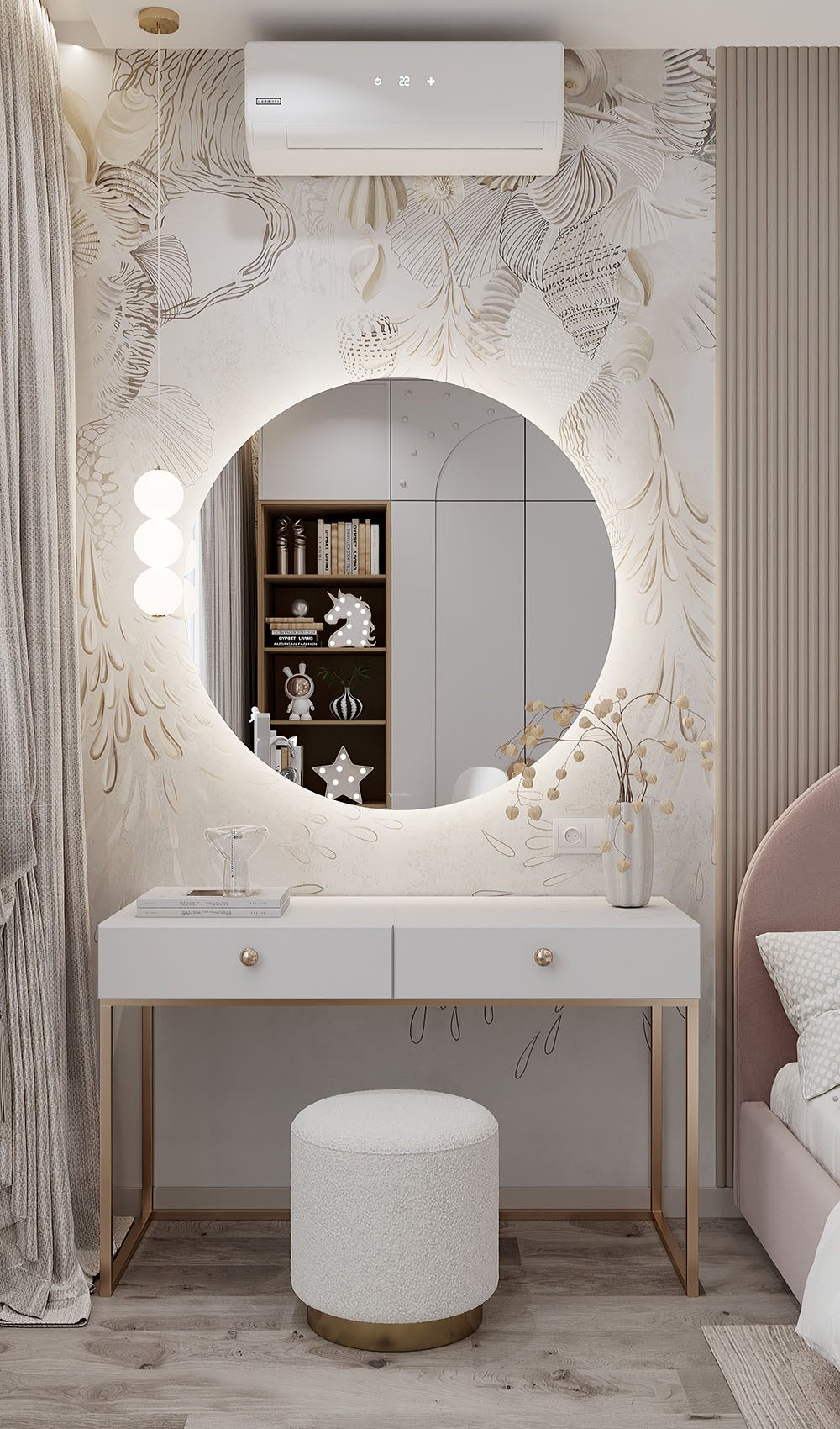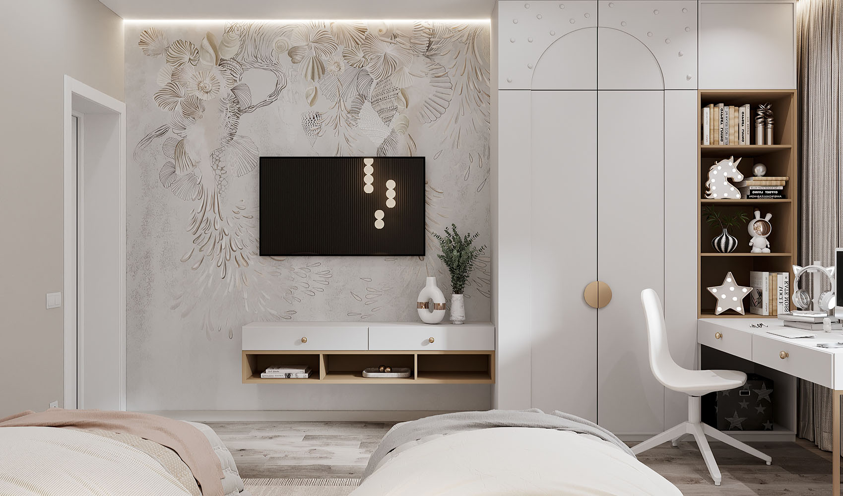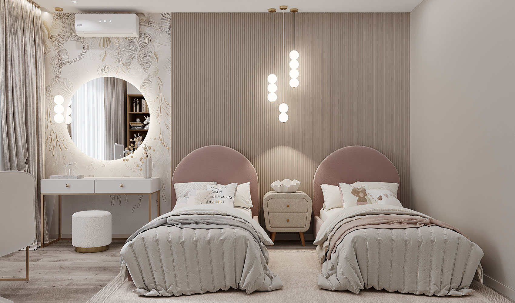 Двухэтажный дом находится в городе Тюмень. У главы семейства было пожелание — сделать эстетичные пространства, которые по мере взросления девочек не потеряют актуальность. И бонусом — одна комната должна была быть в любых цветах, кроме розового! На площадях 18 м² расположились две детские со спальными местами, а также игровая, площадью 16 м².