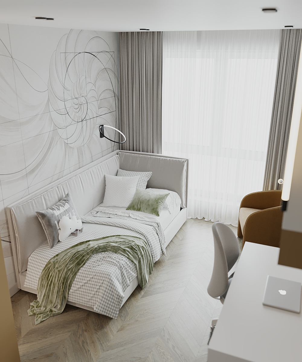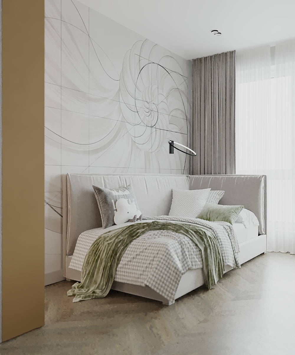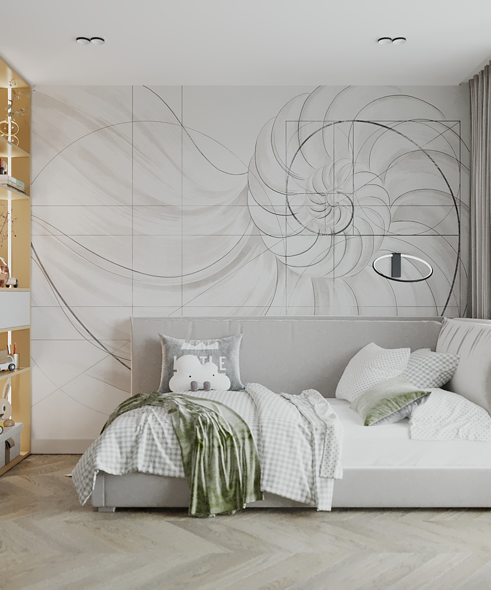 Зачастую при ремонте ребенок у заказчиков только в планах. И, конечно, никто не знает, мальчик это будет или девочка. В таком случае дизайнер либо делает гостевую комнату или кабинет, который легко можно будет переделать в детскую, либо сразу планирует детскую унисекс. Обои из коллекции MARINA отлично подходят под любой вариант.