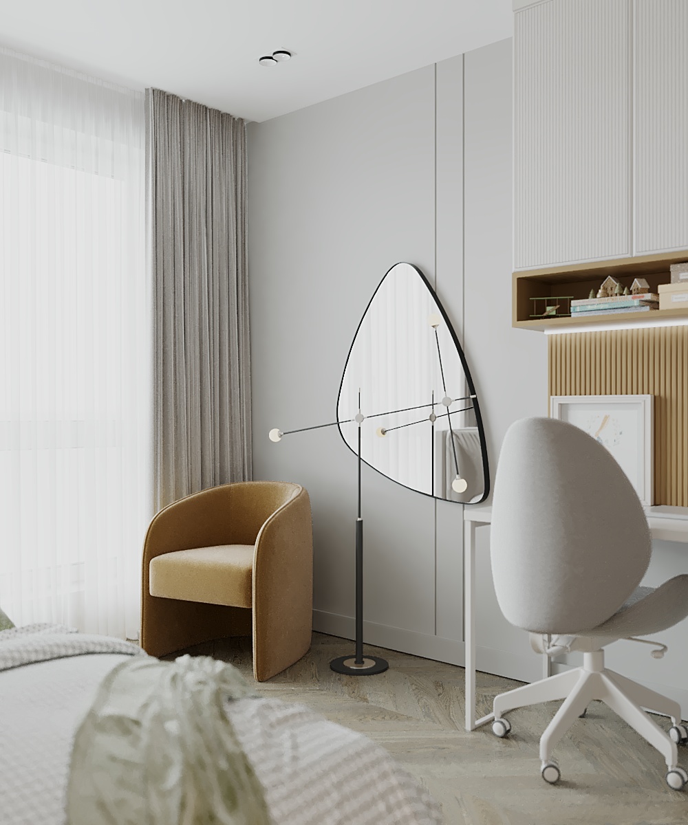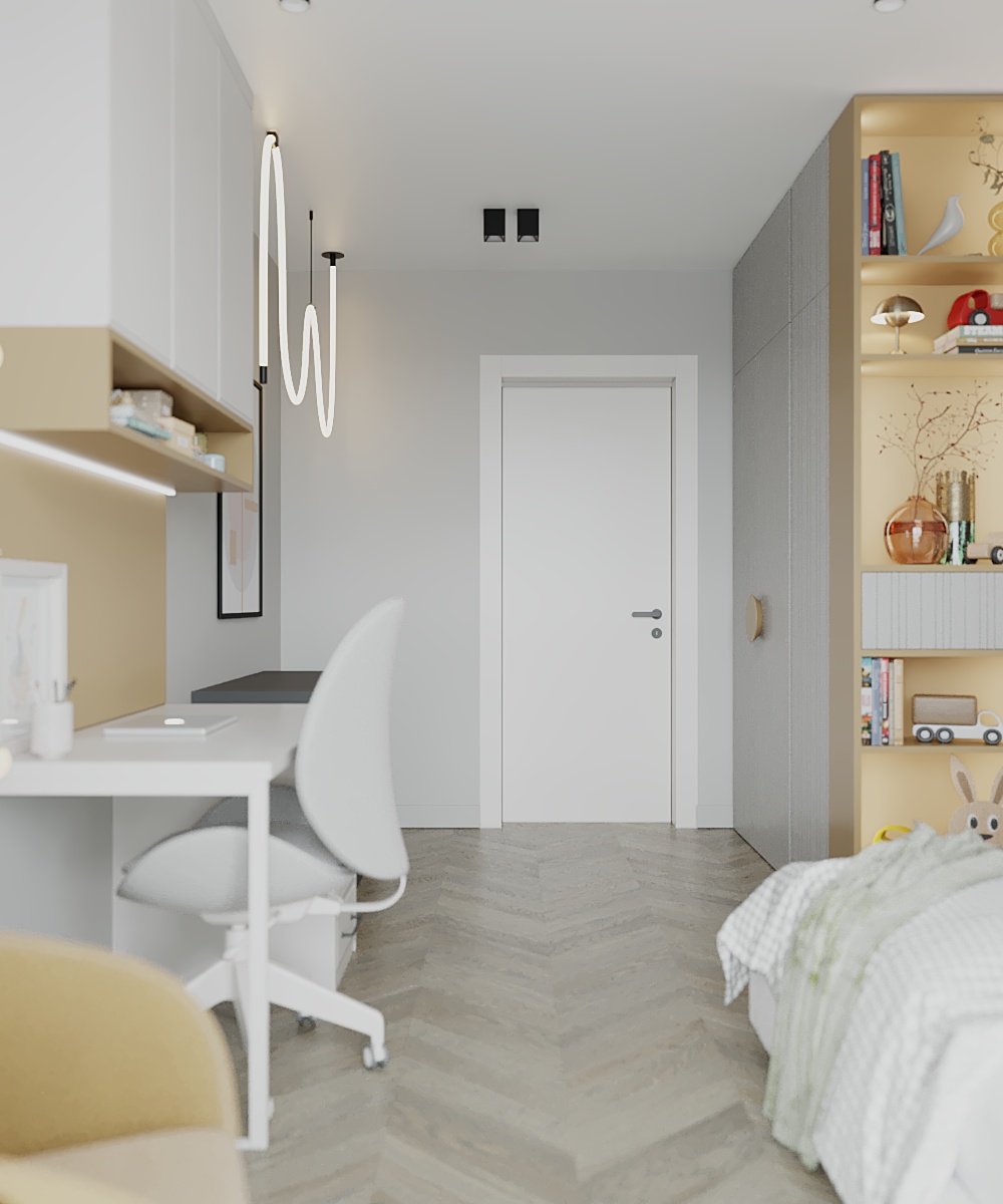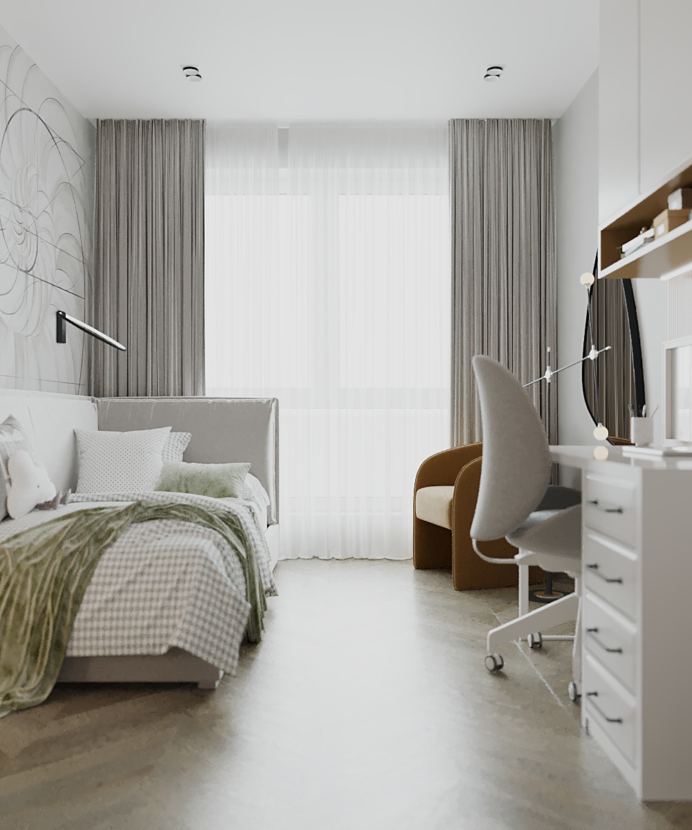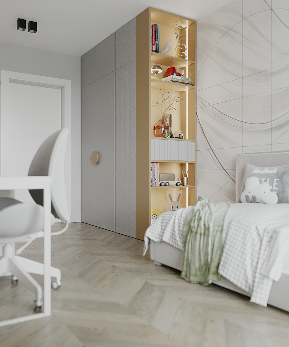 Зачастую при ремонте ребенок у заказчиков только в планах. И, конечно, никто не знает, мальчик это будет или девочка. В таком случае дизайнер либо делает гостевую комнату или кабинет, который легко можно будет переделать в детскую, либо сразу планирует детскую унисекс. Обои из коллекции MARINA отлично подходят под любой вариант.