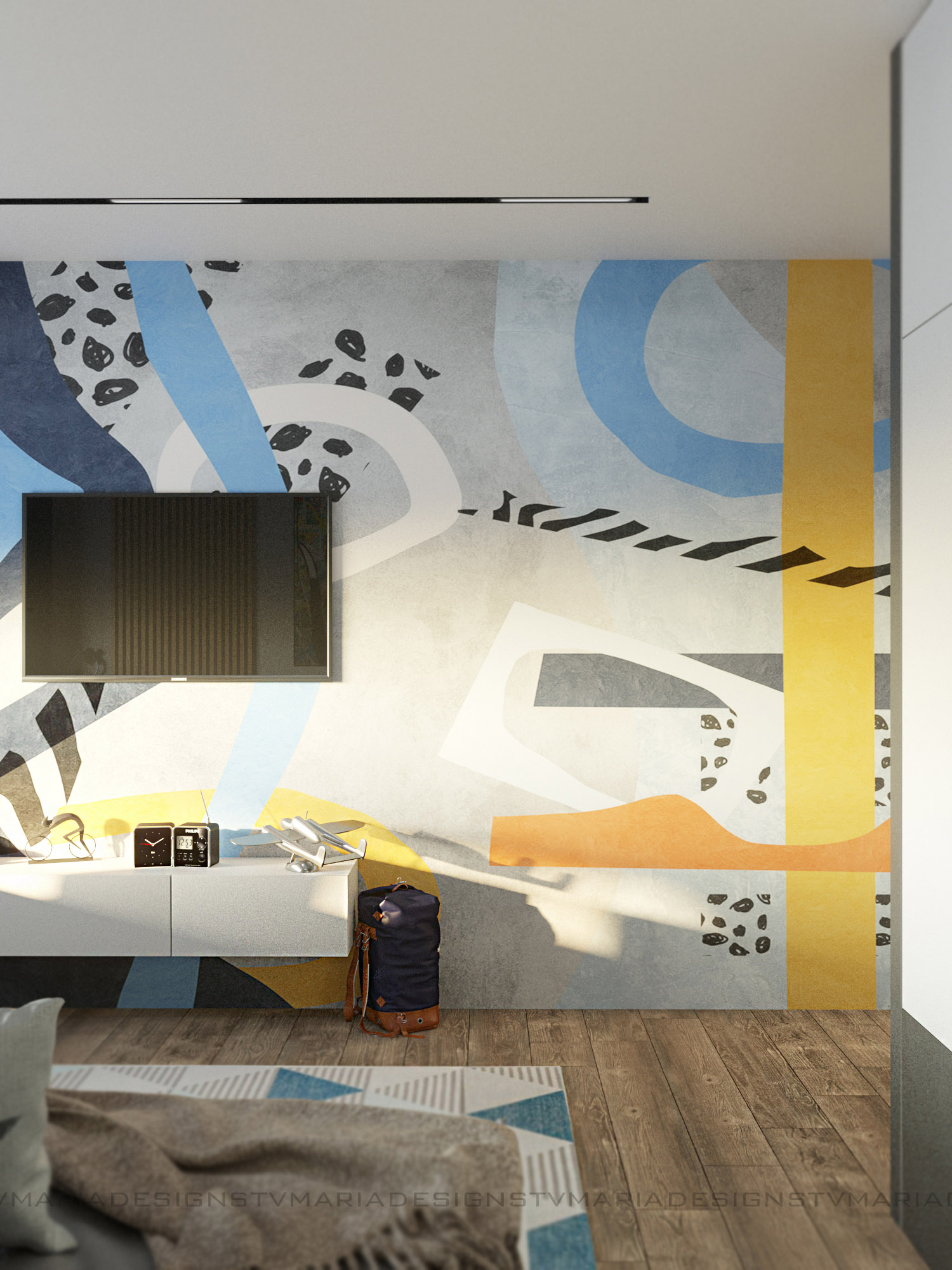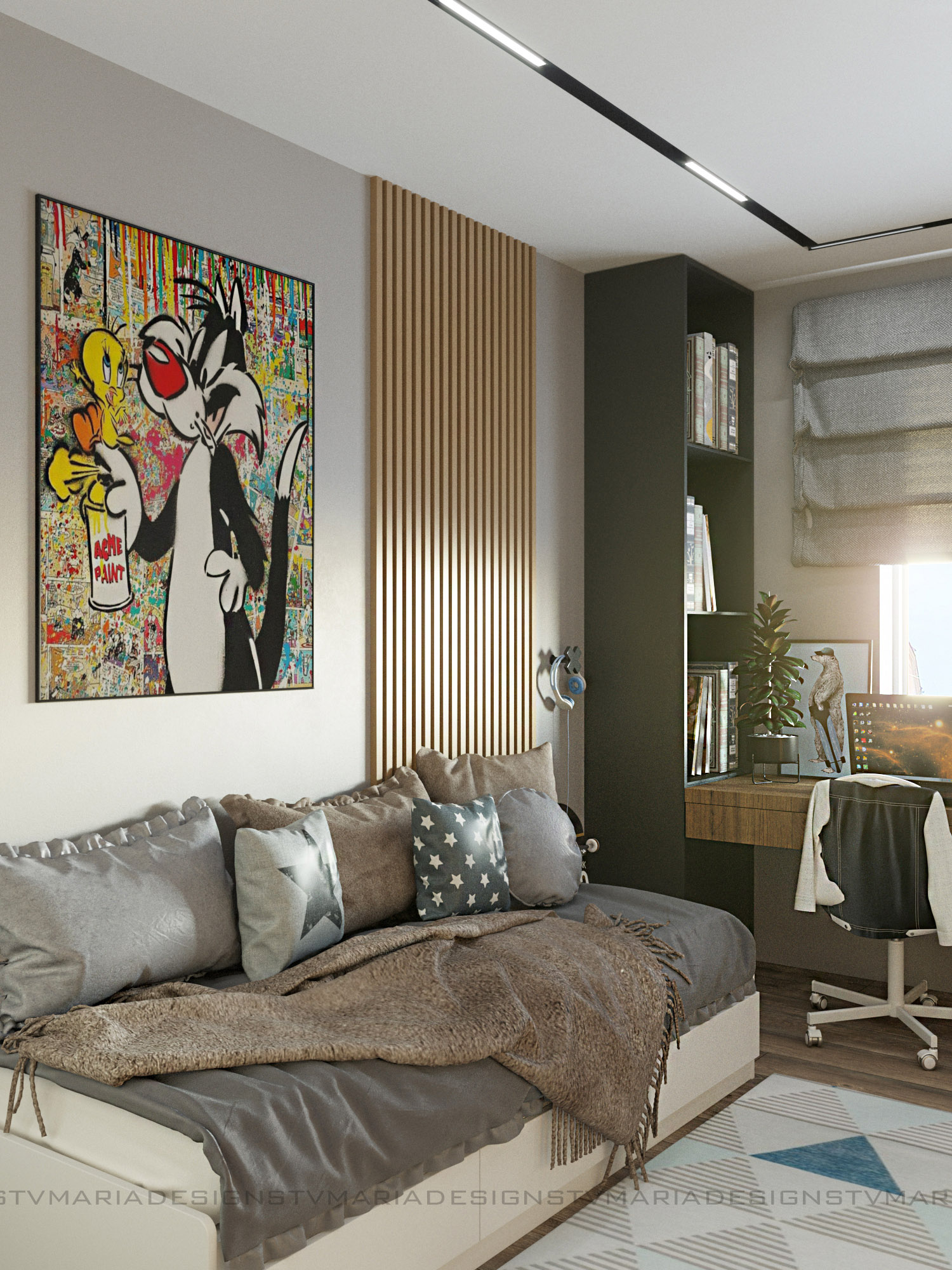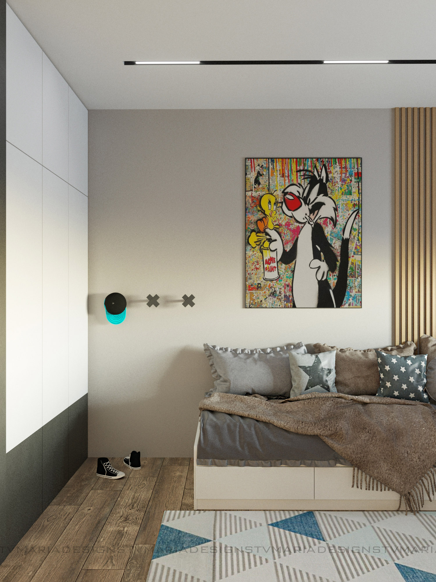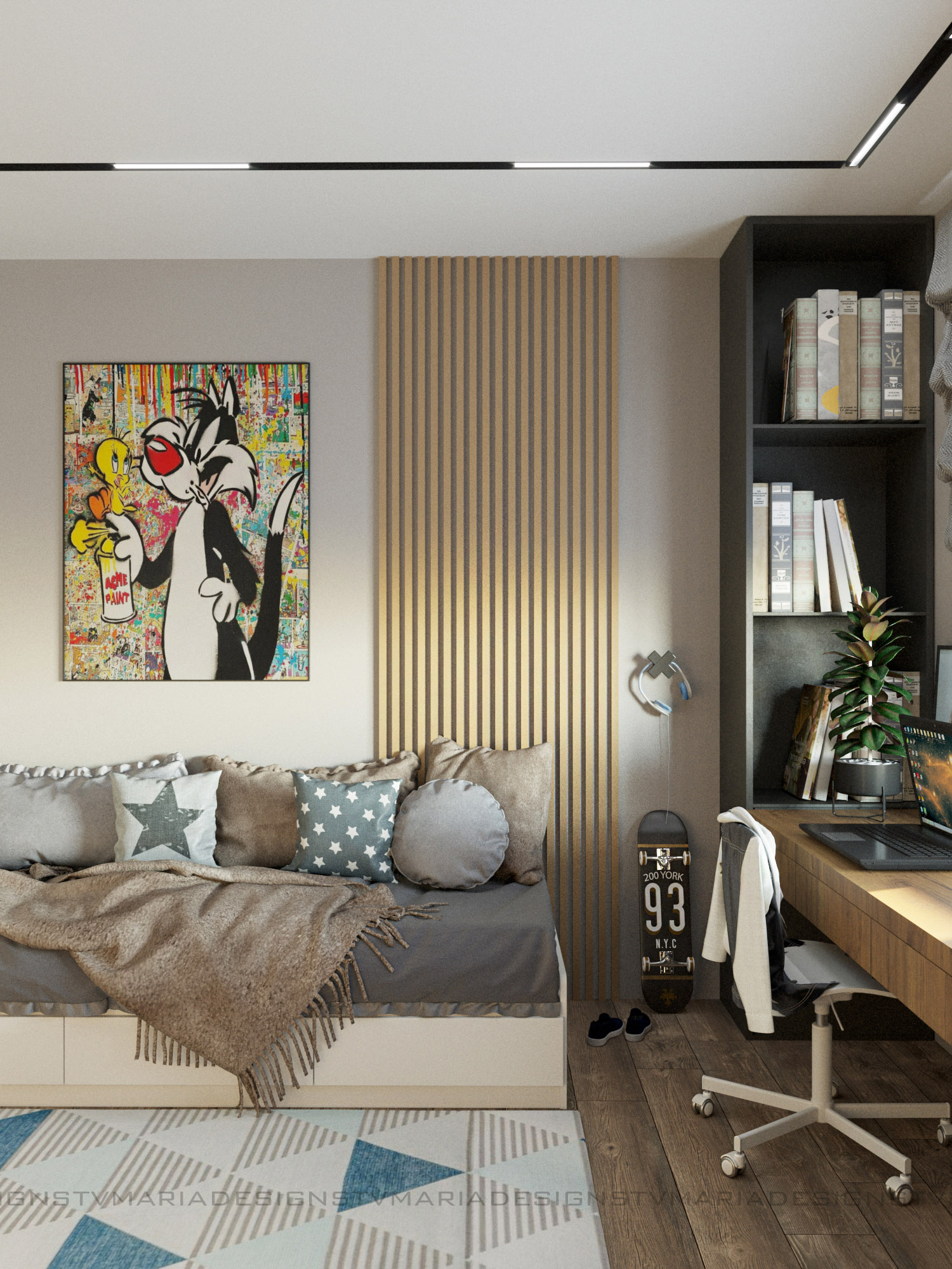 Дизайн детской комнаты для мальчика-подростка, г. Ставрополь. Заказчики — молодая семья, хотели современный и яркий дизайн. Одним из пожеланий было сделать детскую в стиле лофт, так как и вся квартира поддерживает этот стиль.