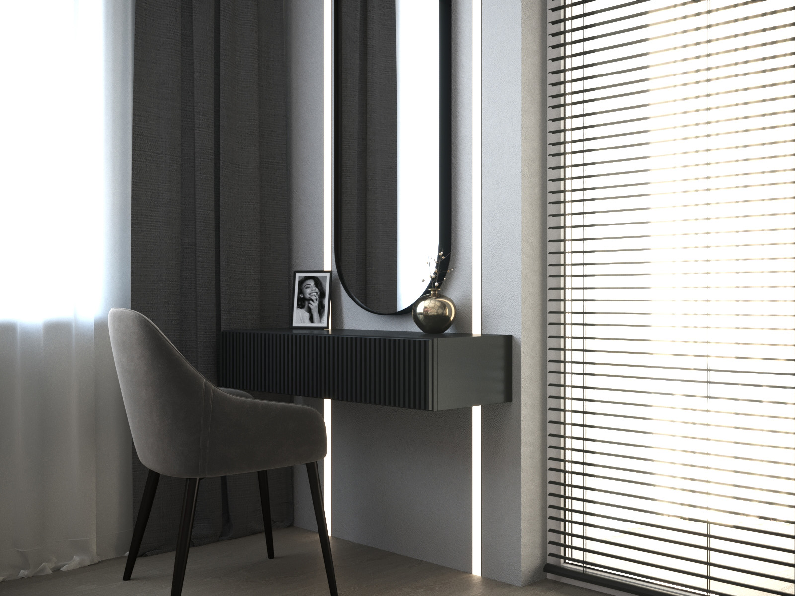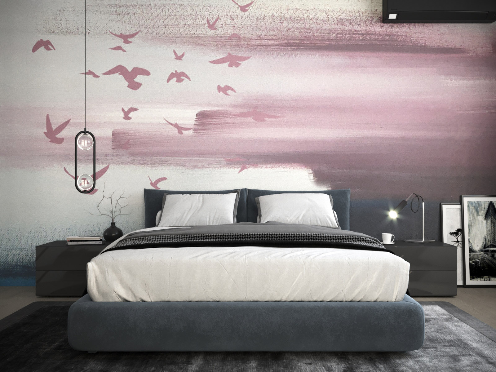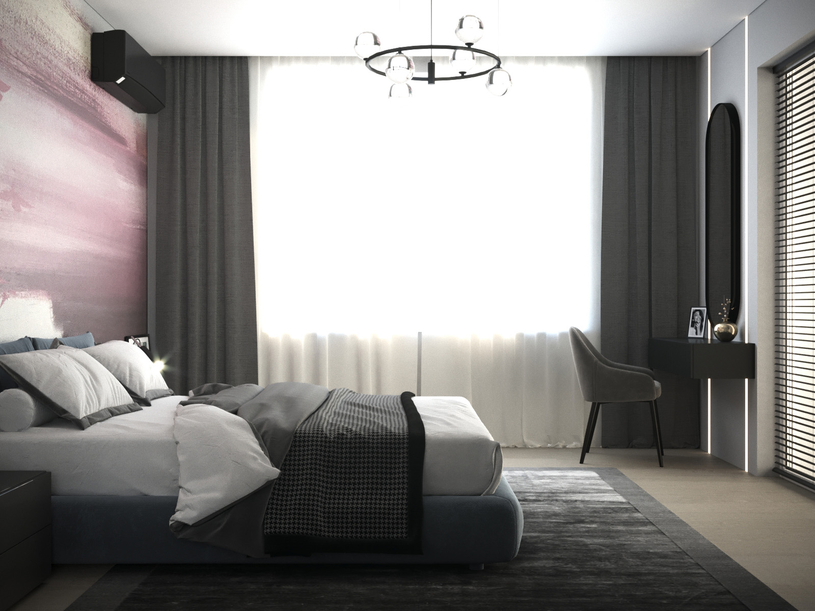 Проект спальни площадью 18,5 м² разрабатывался для холостяка, но в будущем планируется семья. Из пожеланий были серые тона и за кроватью обои с розовыми оттенками. Коллекция «Мужской сет» подошла сюда как нельзя кстати.