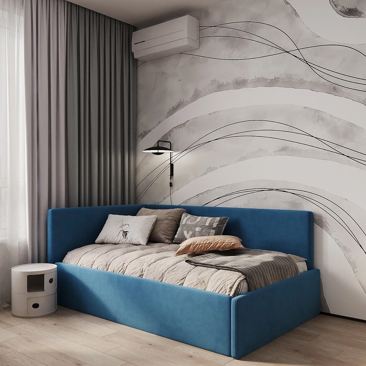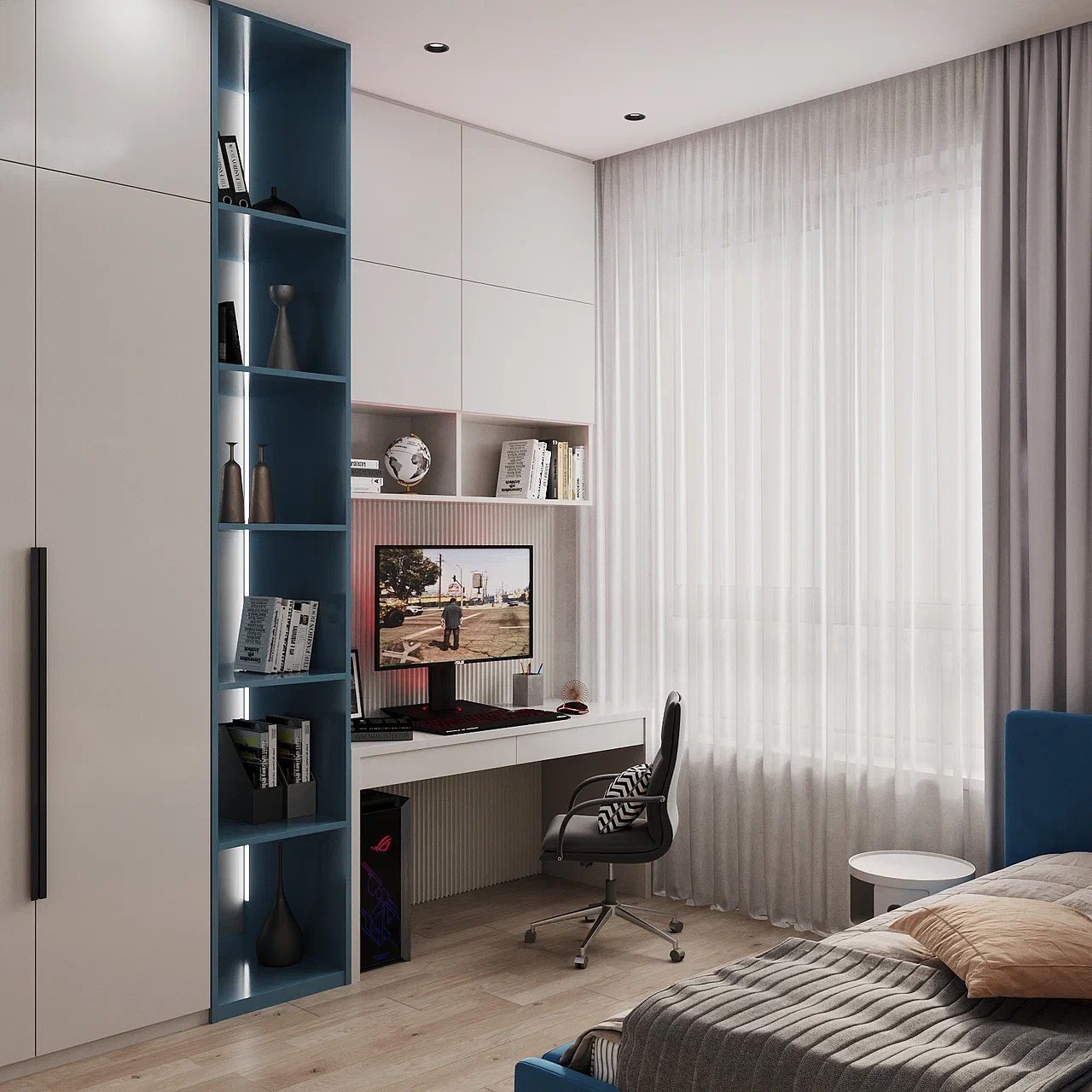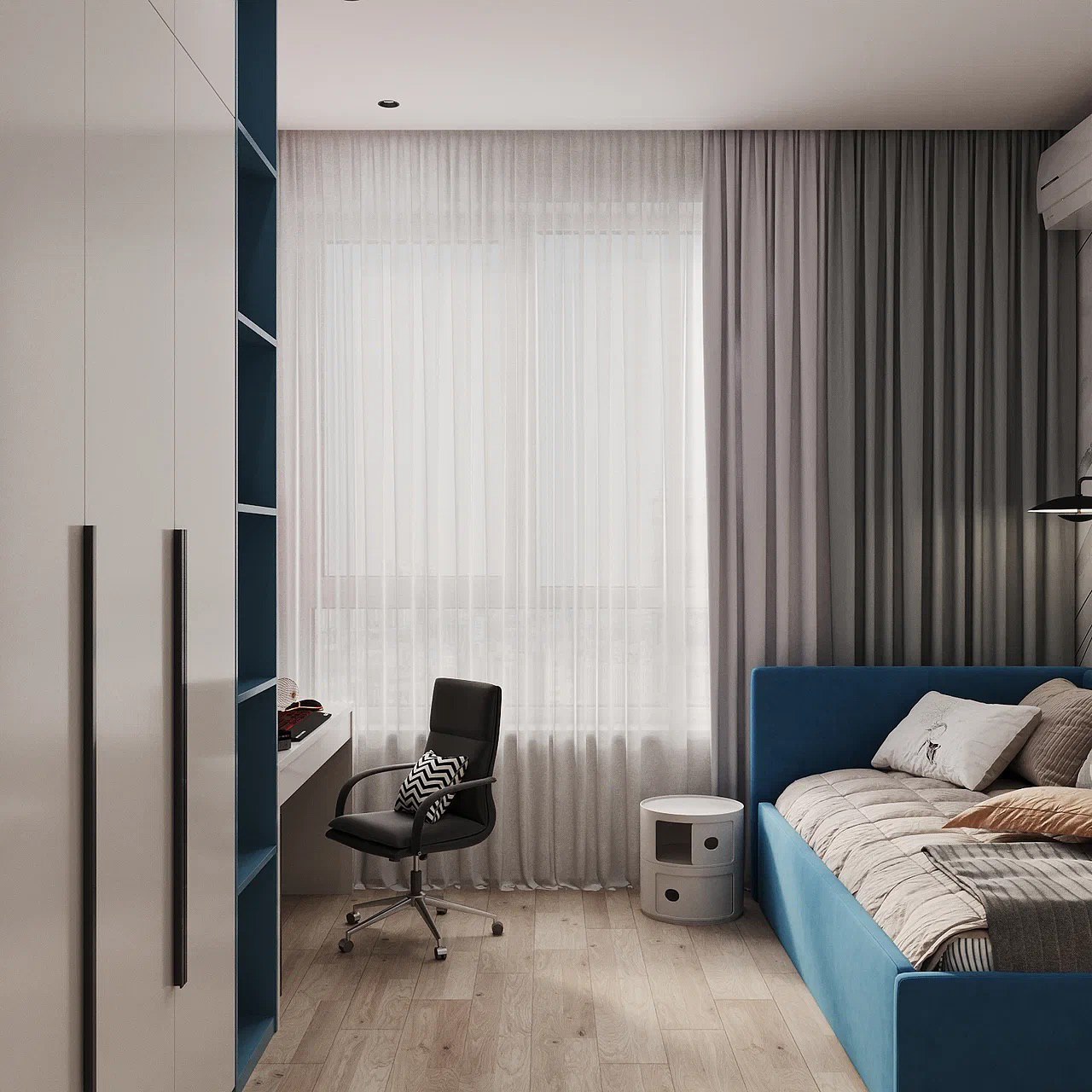 У заказчиков трое детей — три мальчика возрастом 14, 7 и 5 лет. Проект выполнен для старшего сына — отдельная комната площадью 12,5 м². Здесь предусмотрели спальное место, тв-зону, рабочее место с функциональными полками и шкафчиками и, конечно же, зону хранения вещей.