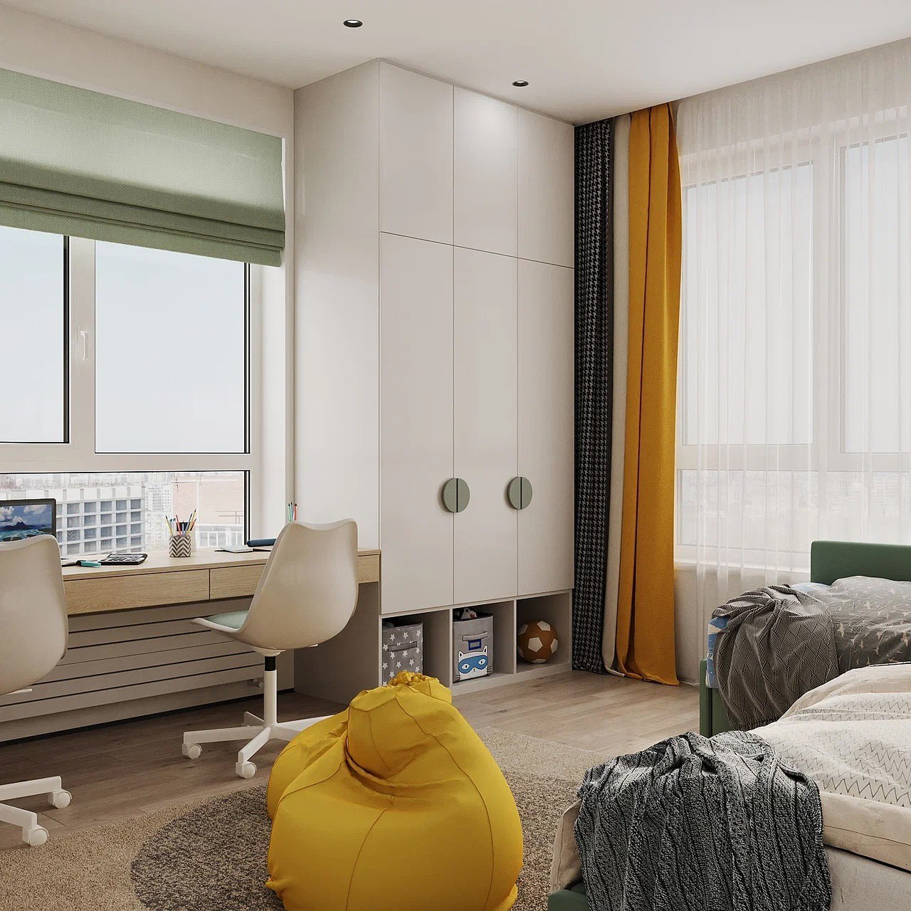 У клиентов трое детей: мальчики возрастом 14, 7 и 5 лет. Эта детская комната площадью 18,4 м² предназначена для двух ребят.