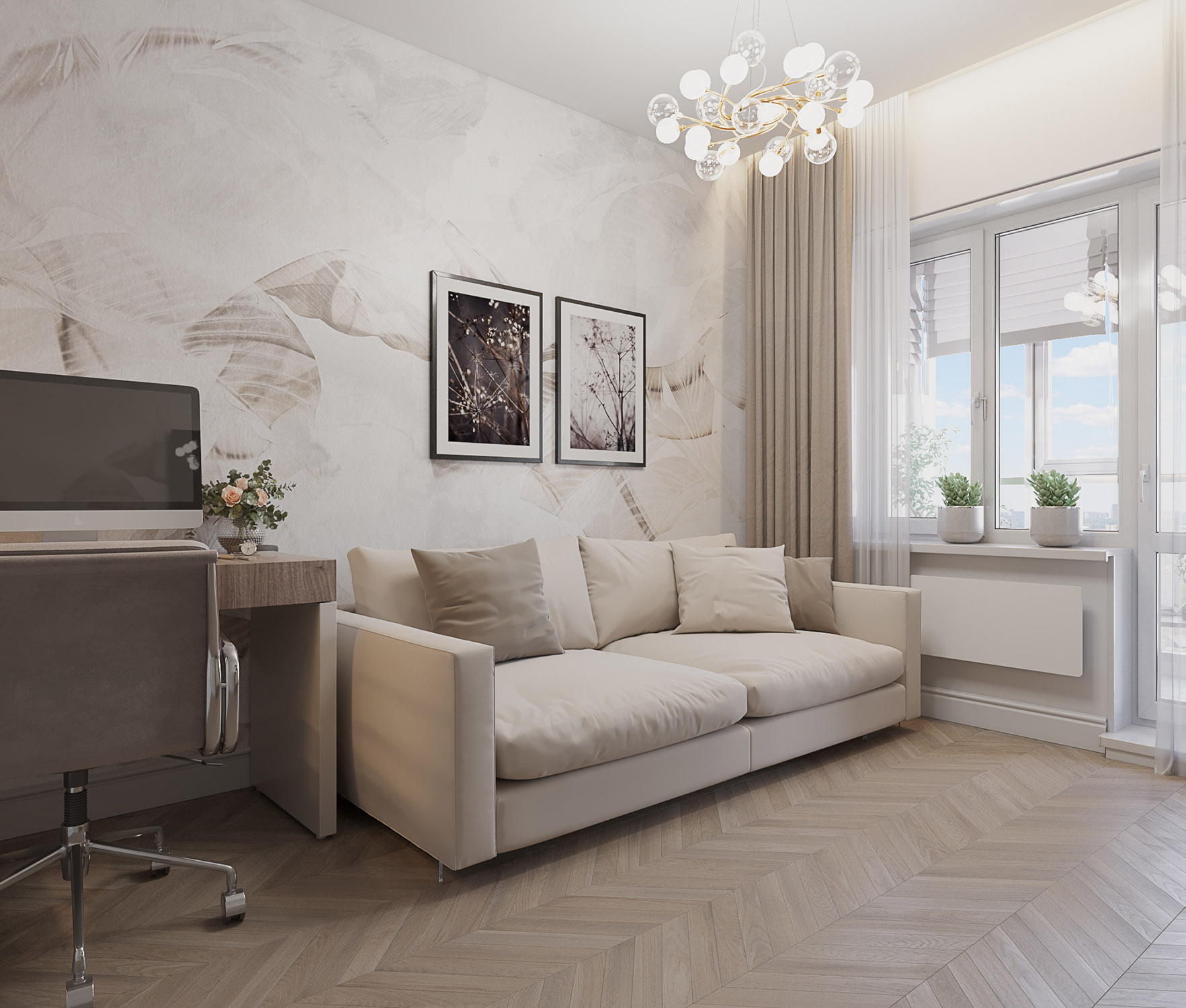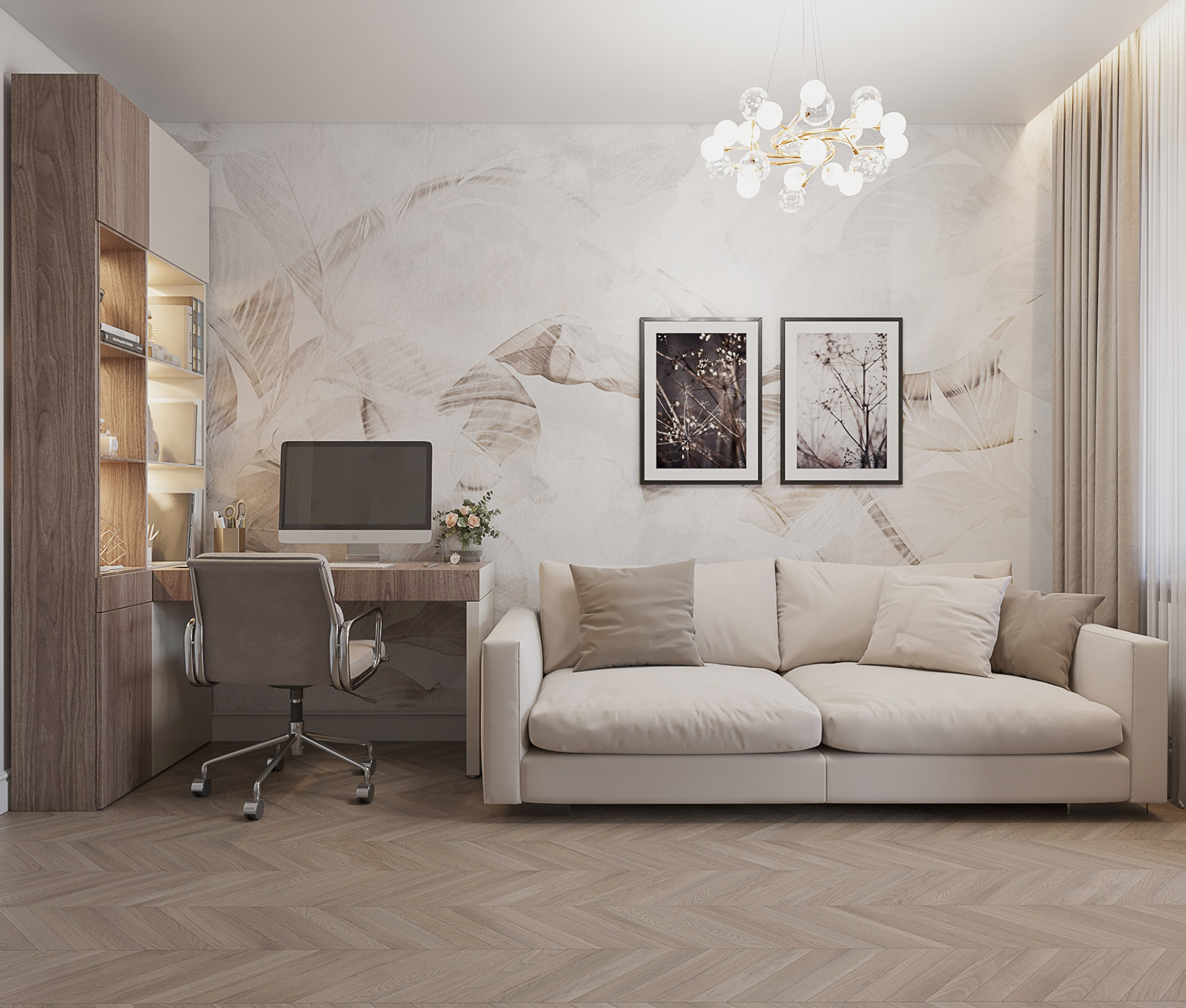 Кабинет-гостевая комната в квартире семьи из двух человек, у которых дети давно уже выросли. Задача стояла сделать квартиру в очень нежных и спокойных тонах в стиле современной классики. Заказчики — деловые люди, поэтому в квартире предусмотрен кабинет, в котором можно также размещать гостей.