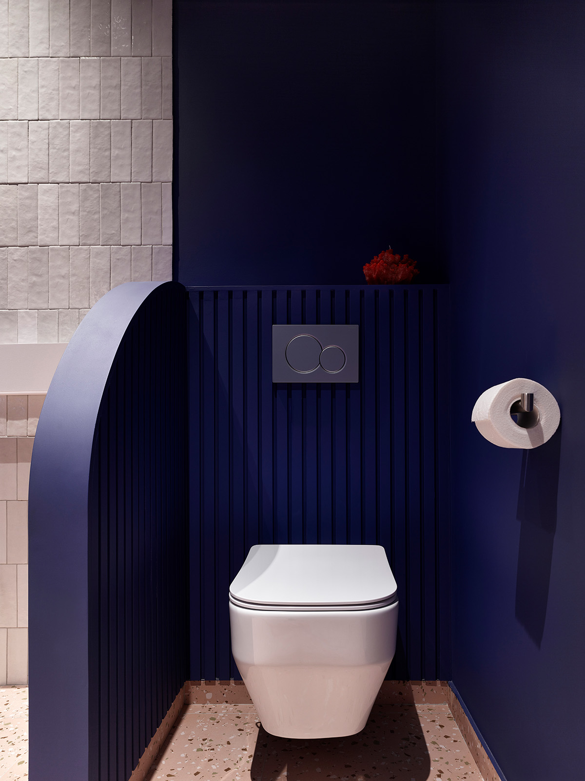 Да, в этом санузле обои смонтированы прямо в зоне душа. Но у них влагостойкое покрытие, поэтому воды они не боятся, а выглядят классно.