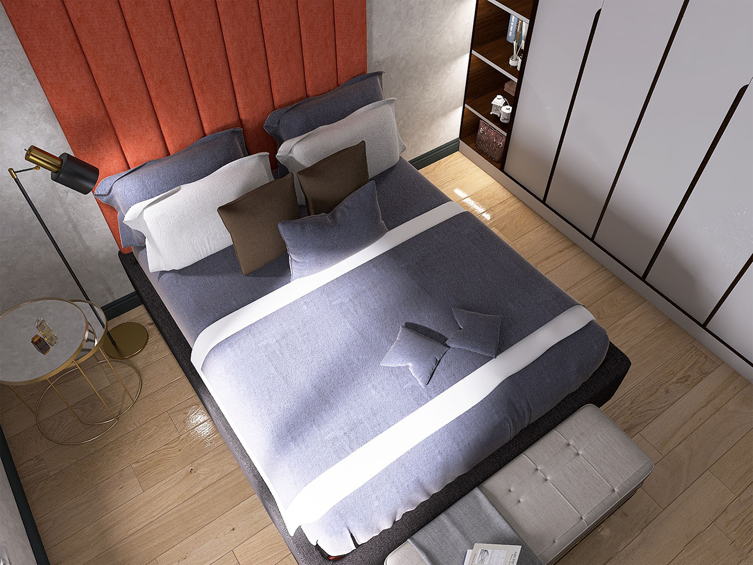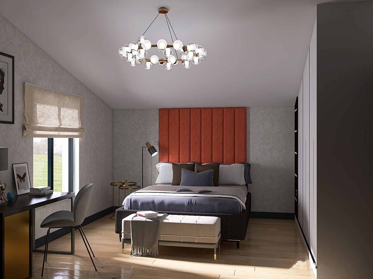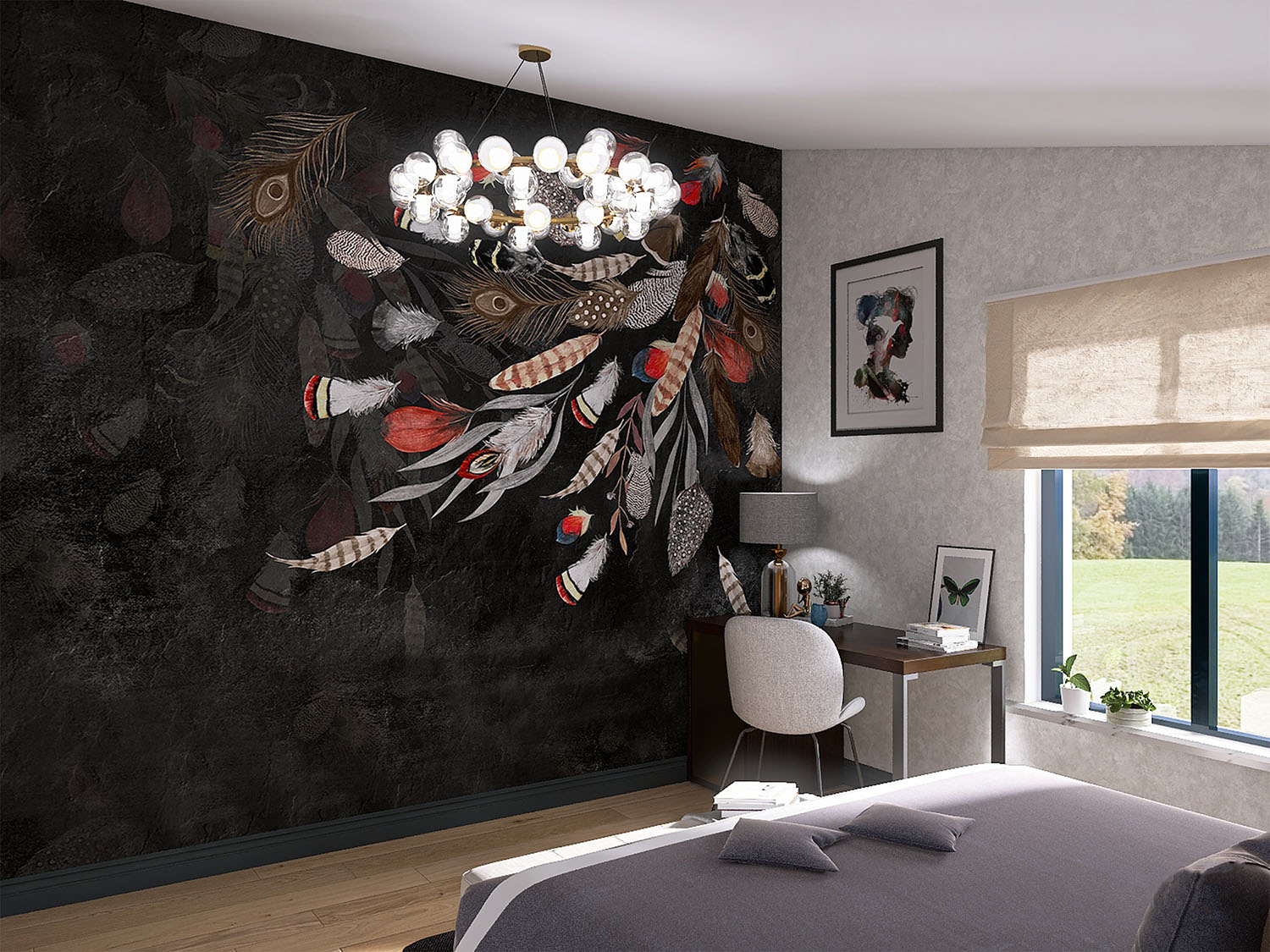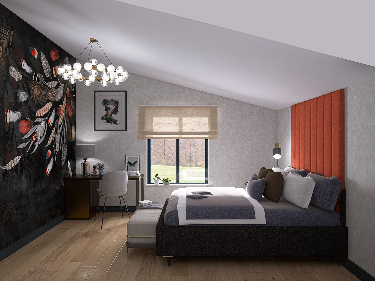 Для выполнения этой задачи на акцентной стене решили разместить необычные обои из коллекции PERO. Остальной дизайн как бы дополняет эту фреску: это и изголовье кровати в терракотовом оттенке, которое является доминантой в комнате, и текстиль в фиалково-серых и бежевых тонах, и письменный стол со столешницей из натурального шпона, и люстра с золотисто-бронзовой отделкой и прозрачными шарами.