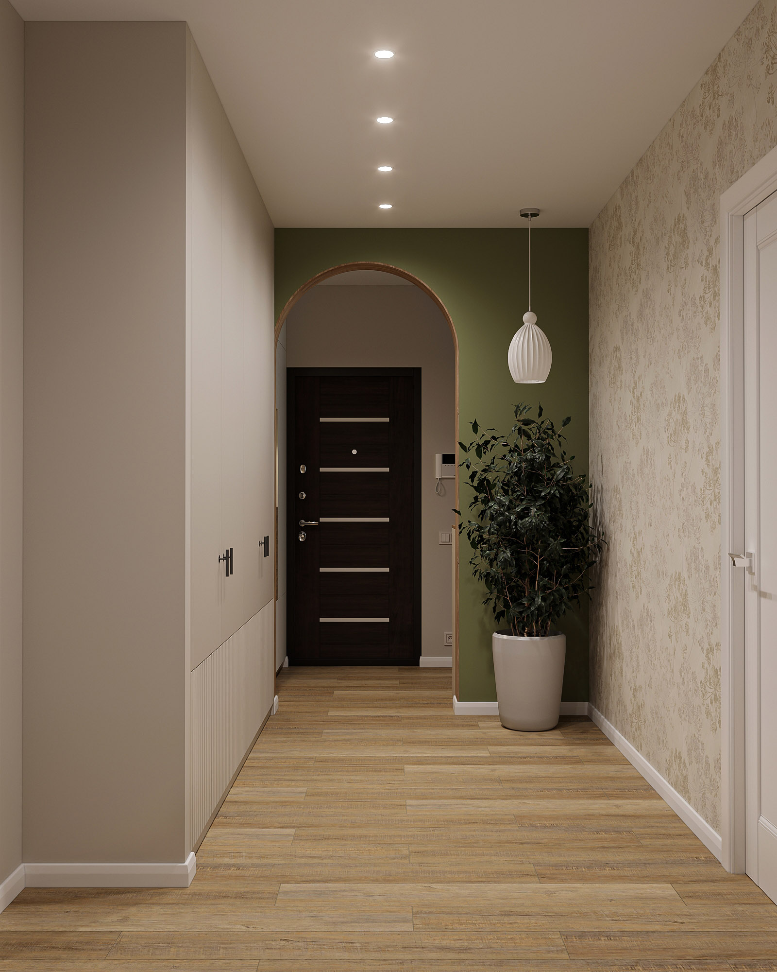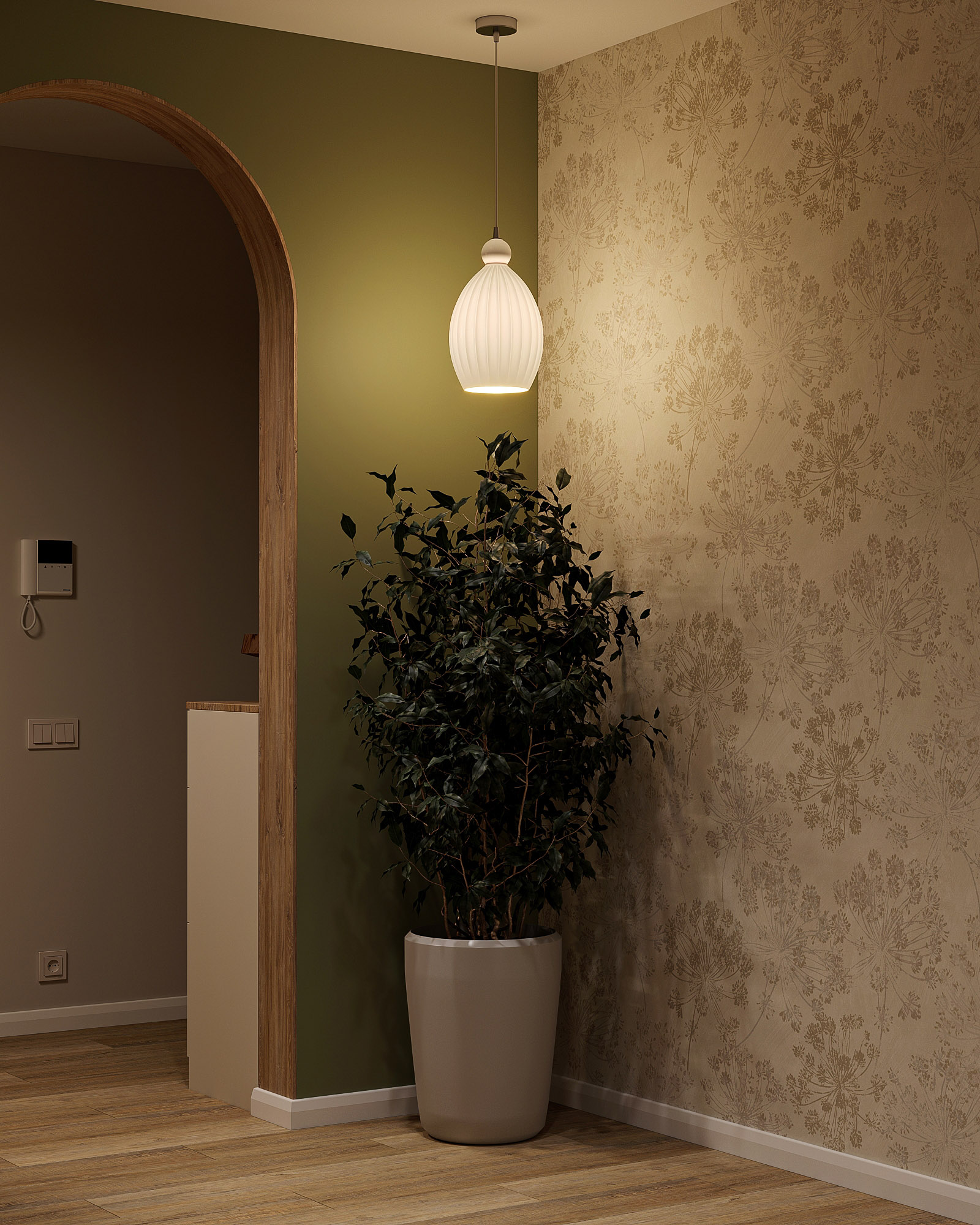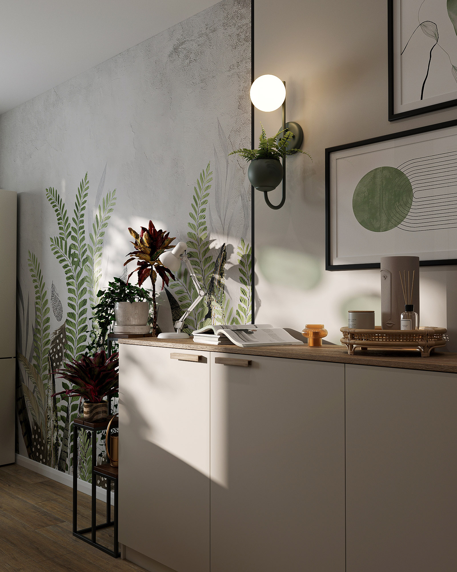 Проект кухни площадью 9,5 м², плюс коридор и прихожая. Для кухни выбрали обои из коллекции «Pero». В наполненных воздухом сюжетах этой коллекции переплетаются в одной композиции растения и пушинки. Художников во все времена вдохновляли легкость и изящество пера павлина и в то же время восхищала естественность природы. Почему бы не объединить в одном сюжете эти два веяния и не сделать шедевр, который будет украшать любую стену вашего интерьера?