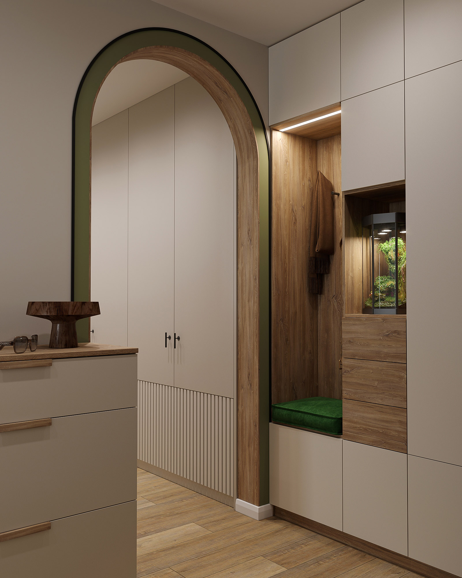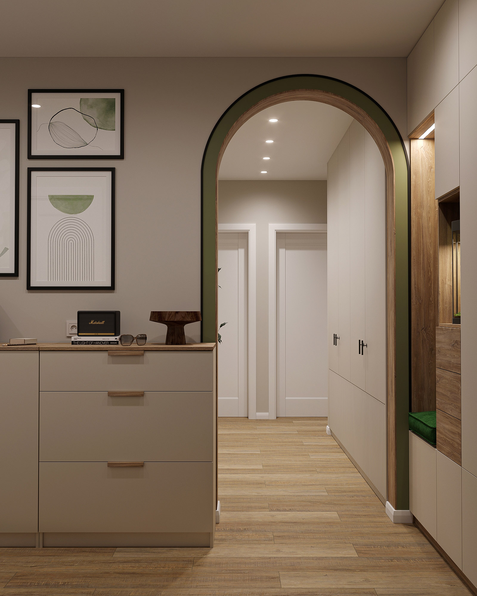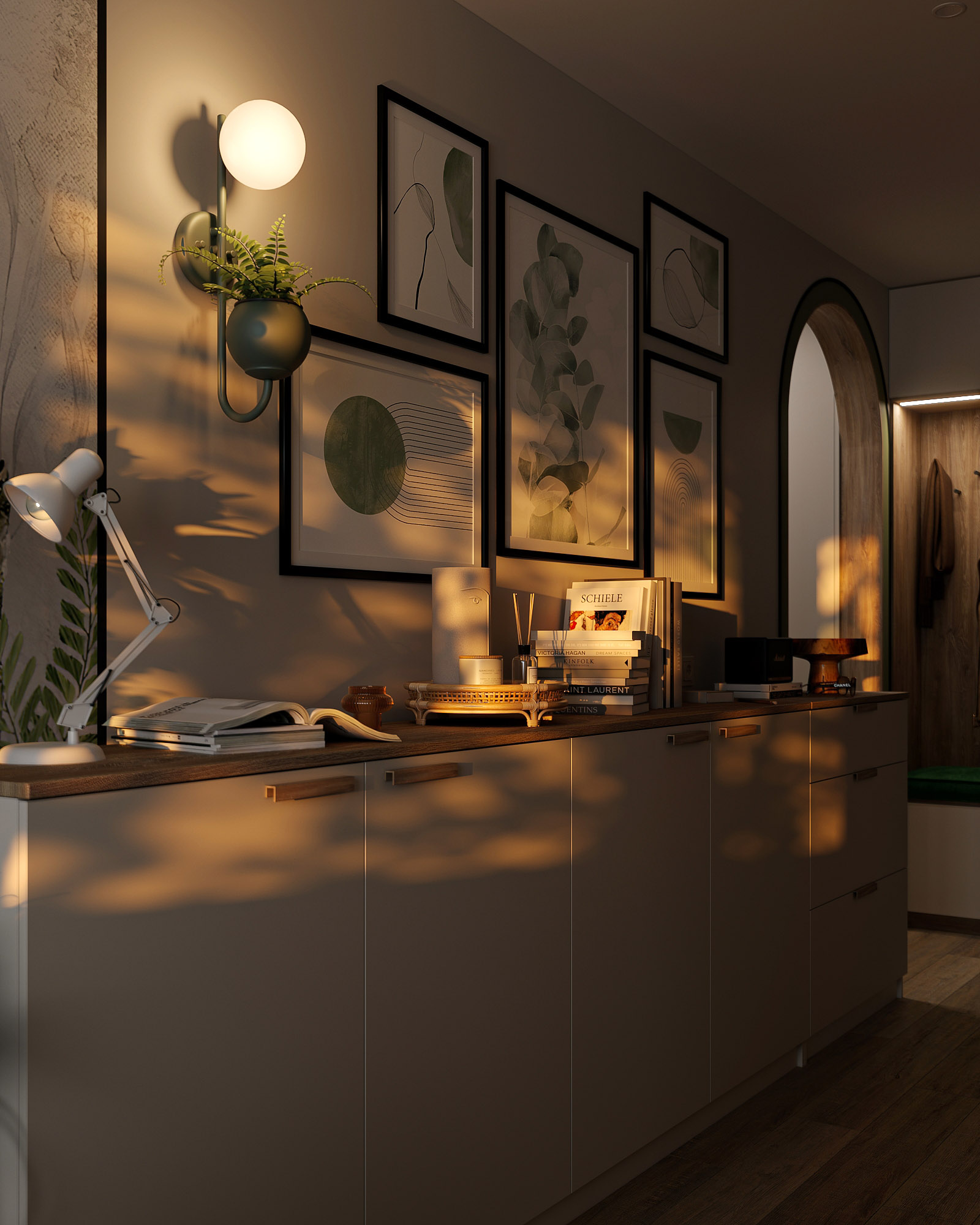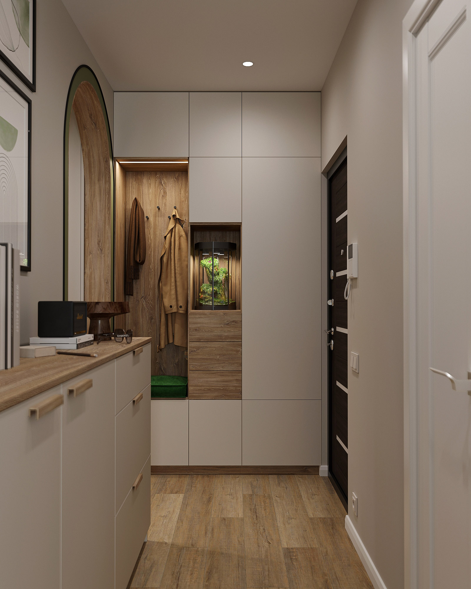 Проект кухни площадью 9,5 м², плюс коридор и прихожая. Для кухни выбрали обои из коллекции «Pero». В наполненных воздухом сюжетах этой коллекции переплетаются в одной композиции растения и пушинки. Художников во все времена вдохновляли легкость и изящество пера павлина и в то же время восхищала естественность природы. Почему бы не объединить в одном сюжете эти два веяния и не сделать шедевр, который будет украшать любую стену вашего интерьера?