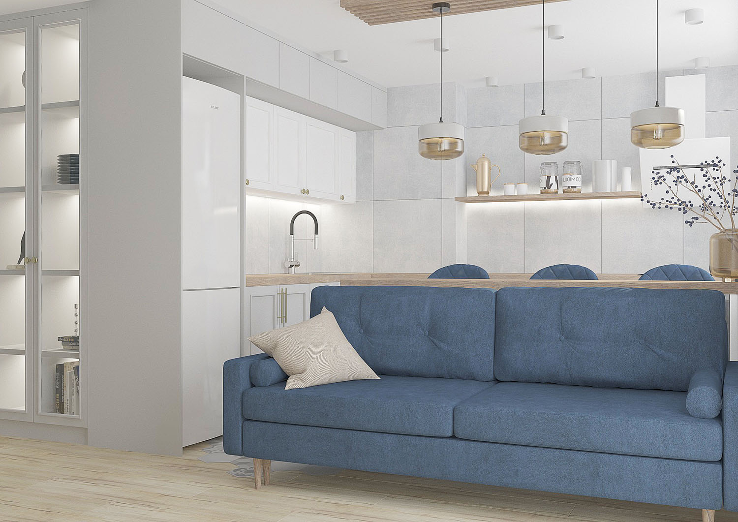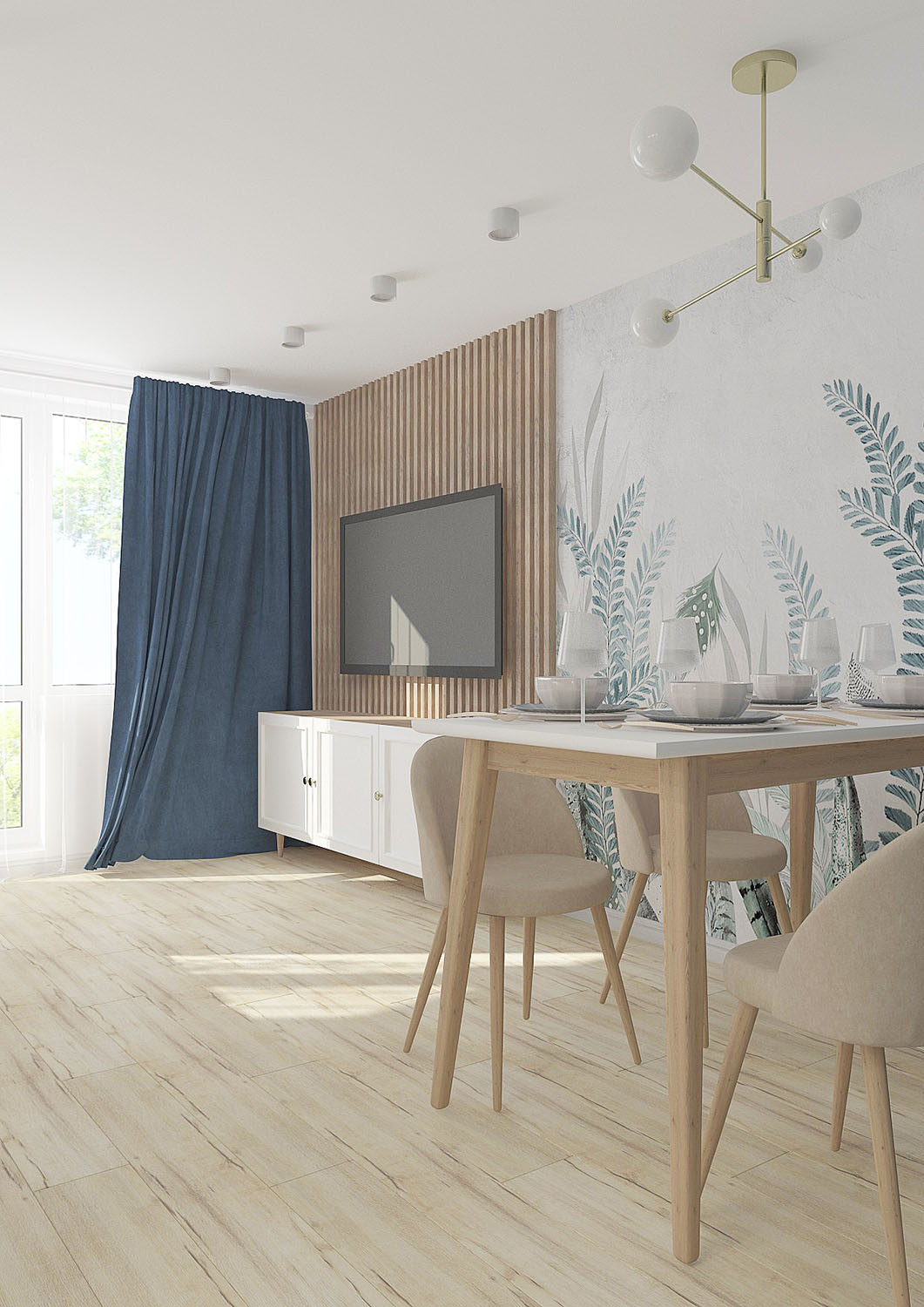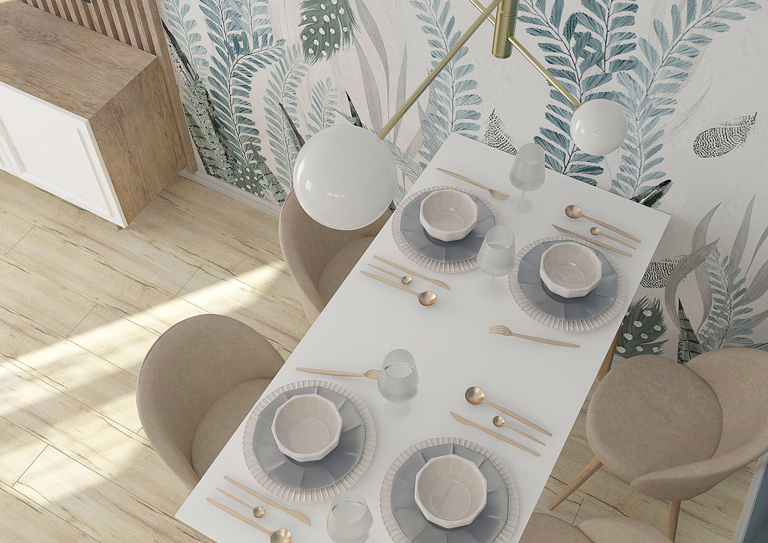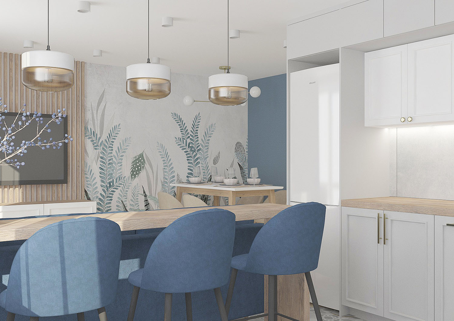 Дизайн кухни-гостиной для семьи из четырех человек в городе Санкт-Петербург. Обои из коллекции PERO. Художников всегда вдохновляли легкость и изящество пера павлина и в то же время восхищала естественность природы. Почему бы не объединить в одном сюжете эти два веяния и не сделать шедевр, который будет украшать любую стену вашего интерьера? В сюжетах, наполненных воздухом, переплетаются в одной композиции растения и пушинки!