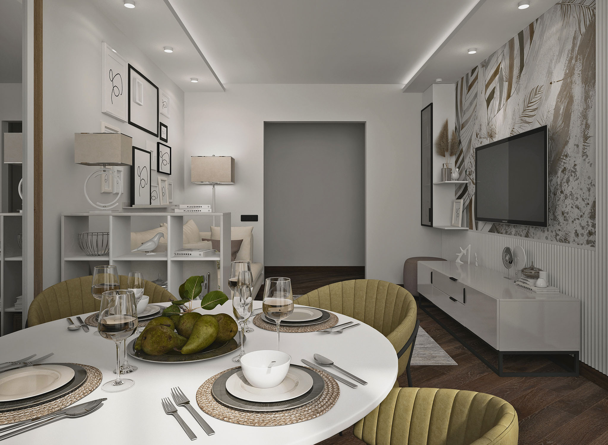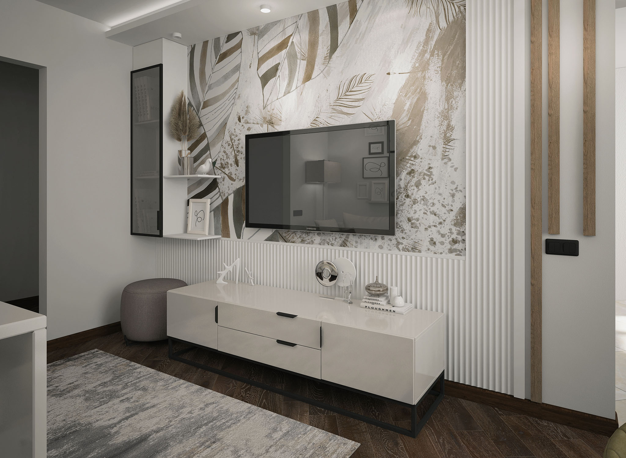 Проект одной из комнат квартиры в Москве для молодой семьи. Площадь — 18 м². Задача стояла сложная: частично переделать интерьер, не меняя потолка и полов. Хотелось сделать интерьер более светлым и воздушным, но в то же время интересным и современным. Для акцентной стены в зоне ТВ использовали обои из коллекции Pero. Заказчики были в восторге от такой идеи. Цвет подобрался очень быстро, а сочетание фактуры обоев и панелей придали этой стене яркий и законченный вид.