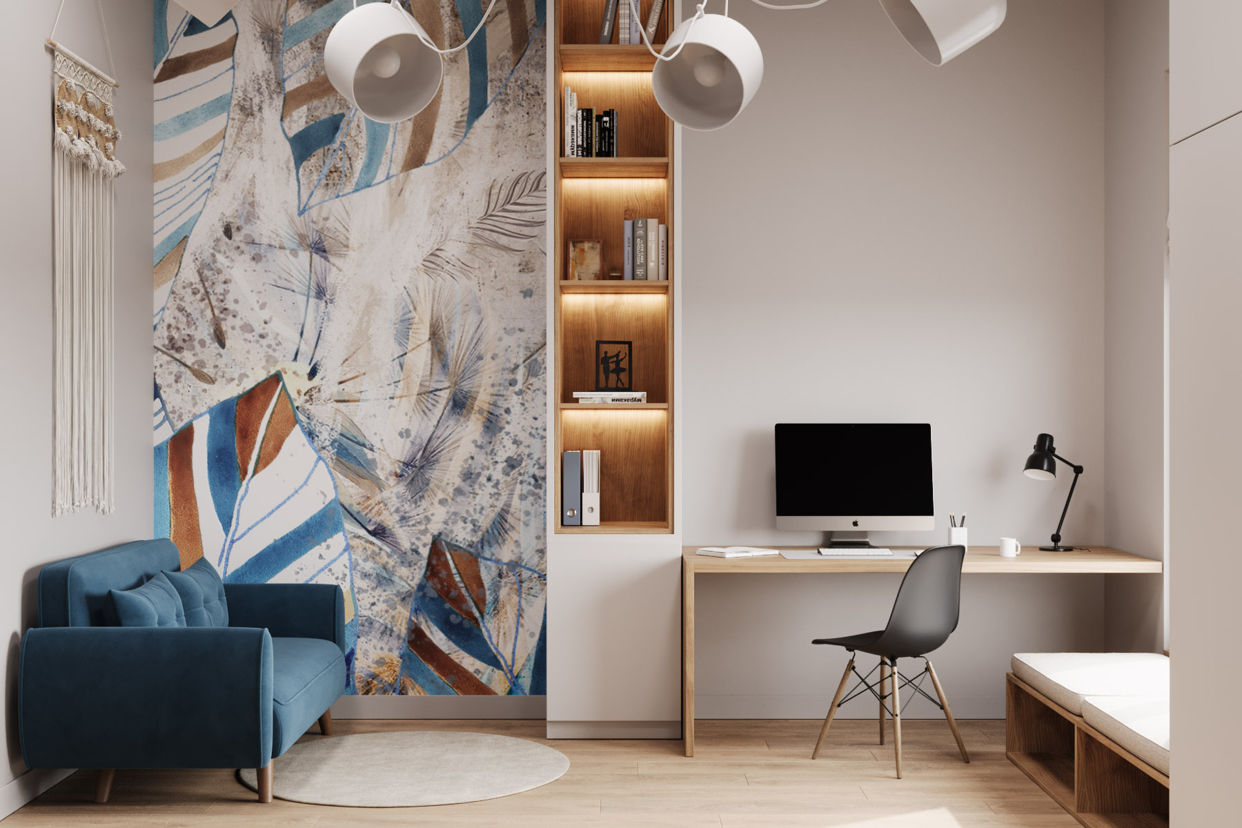 Проект кабинета, в котором акцентом стали синий диван и подобранная по цветовой гамме фреска «Pero». Художников вдохновляют легкость и изящество пера павлина и в то же время восхищает естественность природы. Почему бы не объединить в одном сюжете эти два веяния и не сделать шедевр, который будет украшать любую стену вашего интерьера? В сюжетах, наполненных воздухом, переплетаются в одной композиции растения и пушинки!