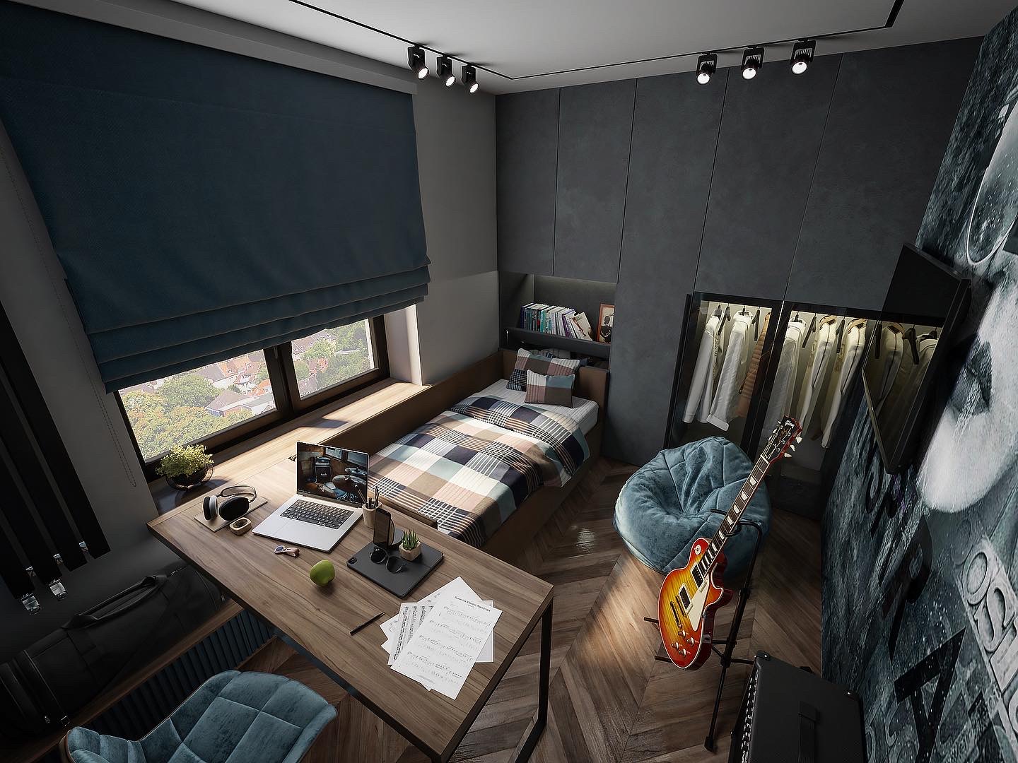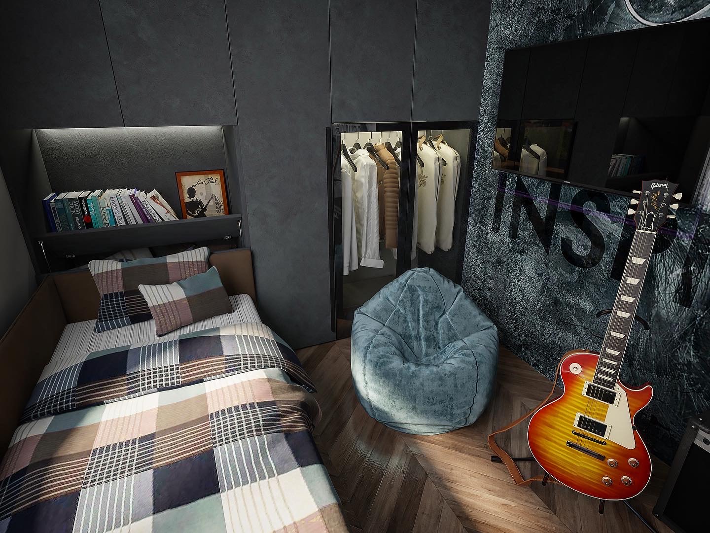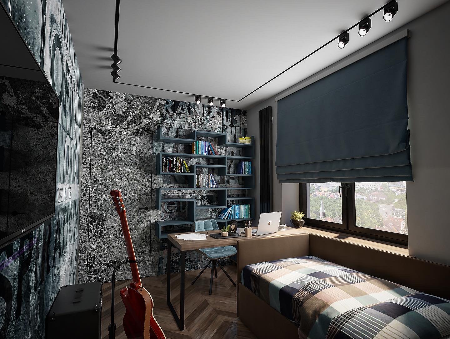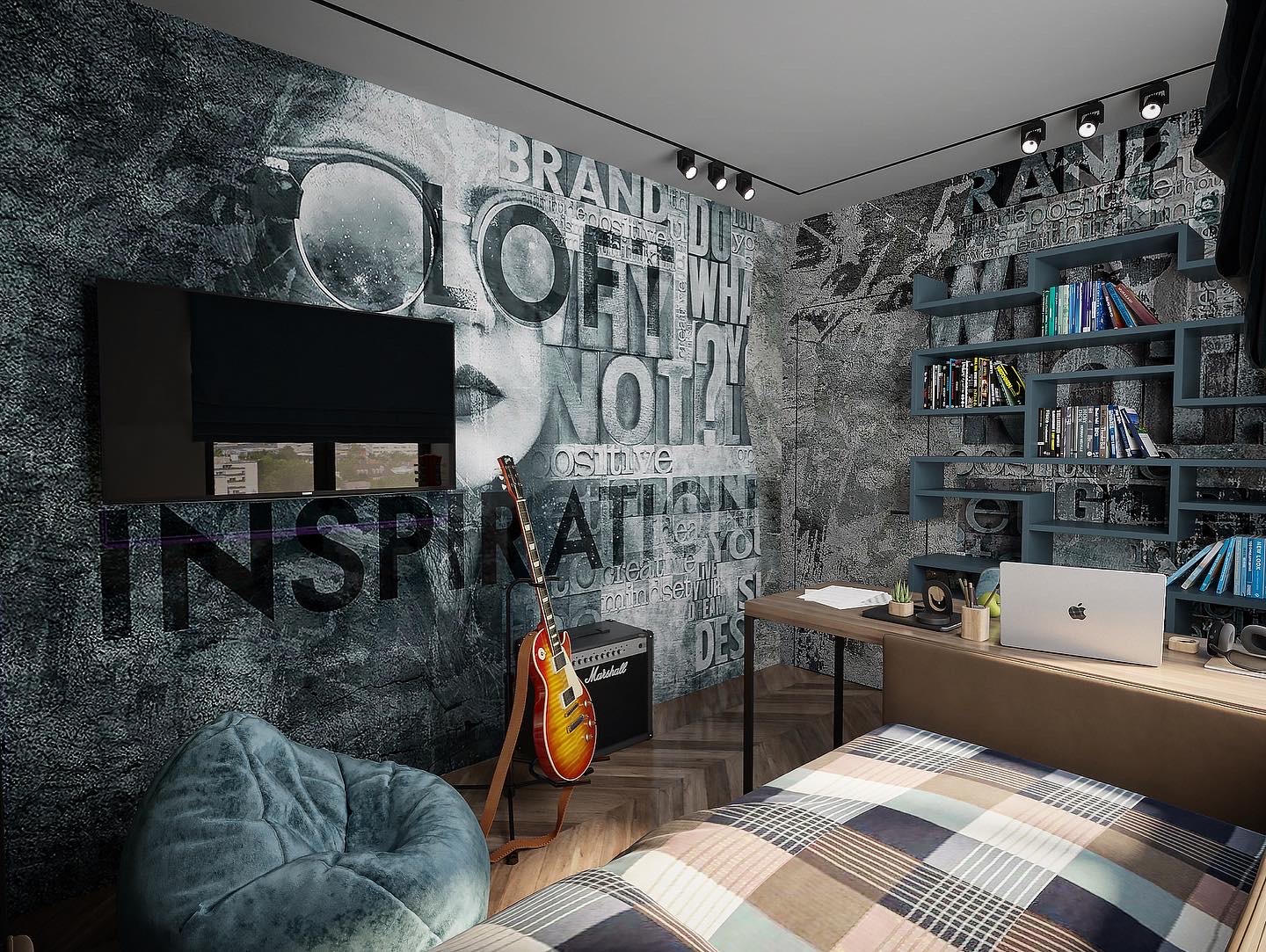 Проект комнаты площадью 10,5 м² для юноши-подростка в московской квартире, который не обошелся без особенностей. Дизайнер, конечно же, всегда учитывает пожелания заказчика, но в данном случае дело не ограничилось просто стандартными хотелками. Дело в том, что подросток — это особая возрастная категория, когда человек самоутверждается, показывает свой характер, хочет выделится и показать свое Я. Для данного проекта идеально подошли обои из коллекции podLOFT, создав нужное настроение и подчеркнув цветовую гамму комнаты.